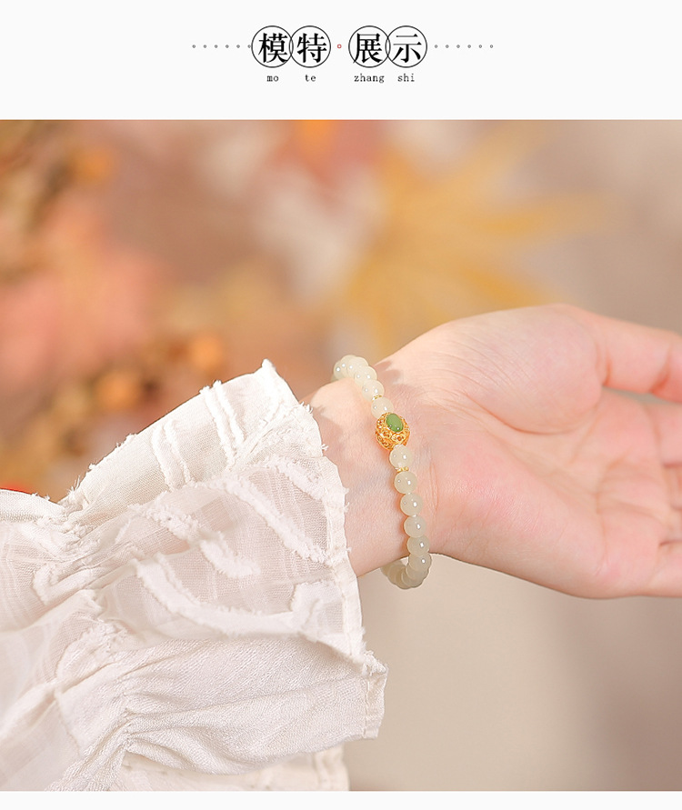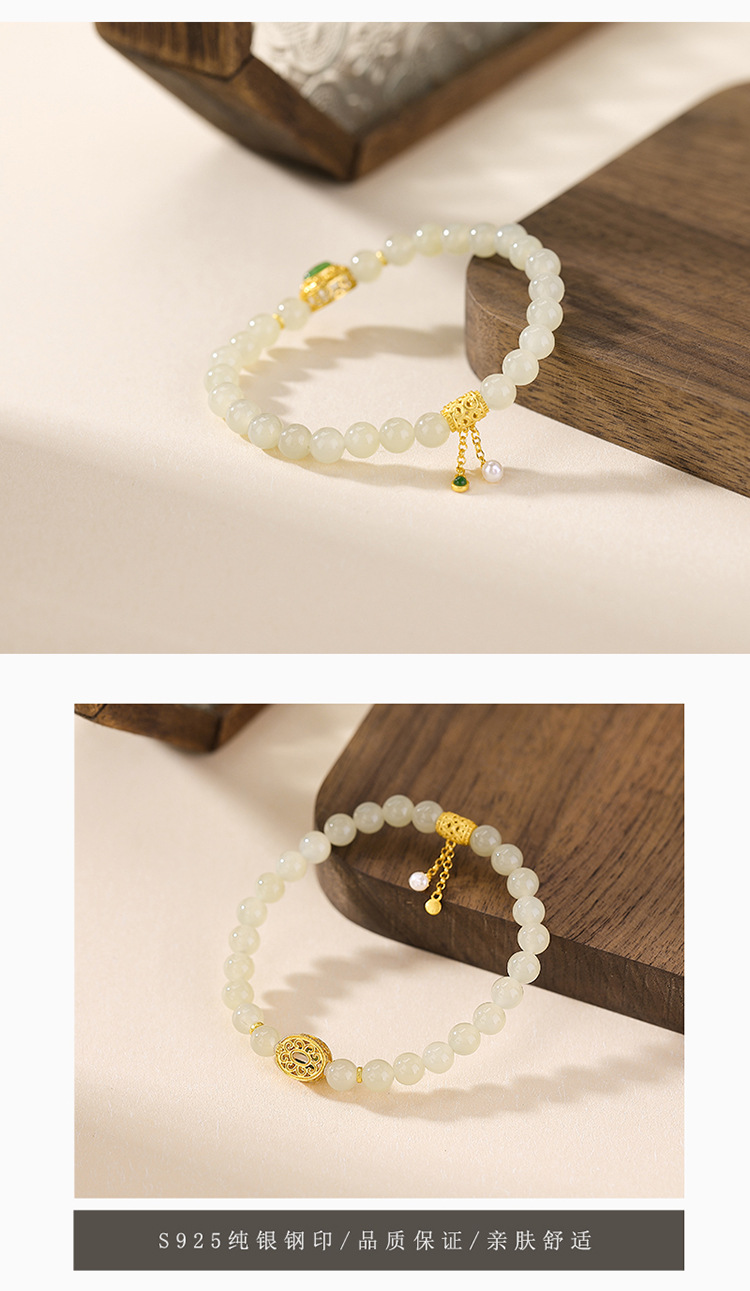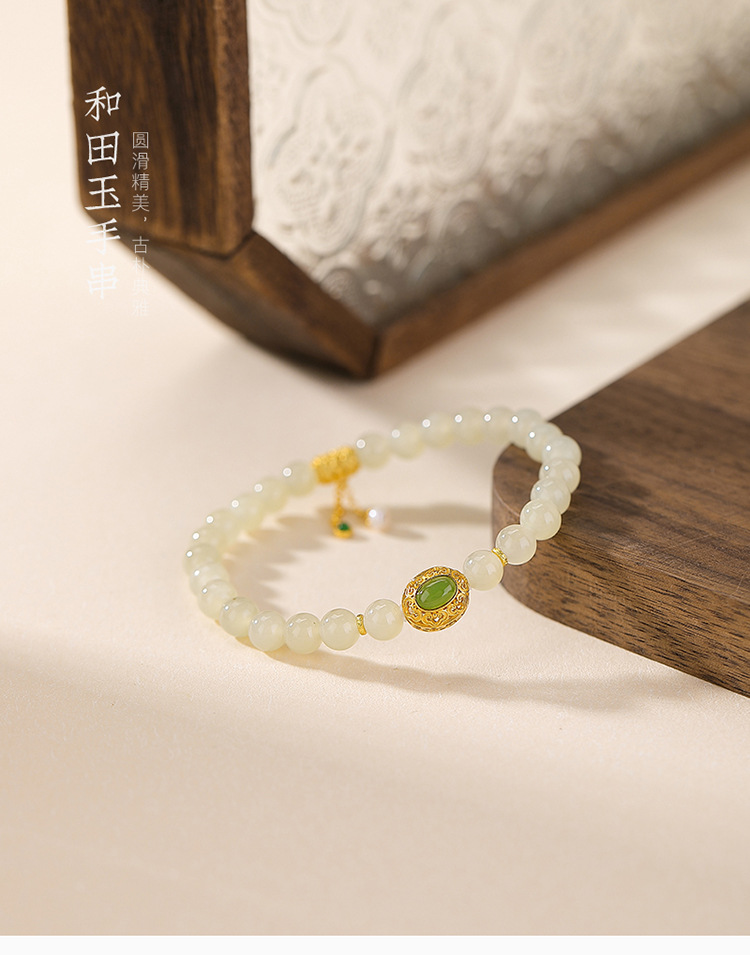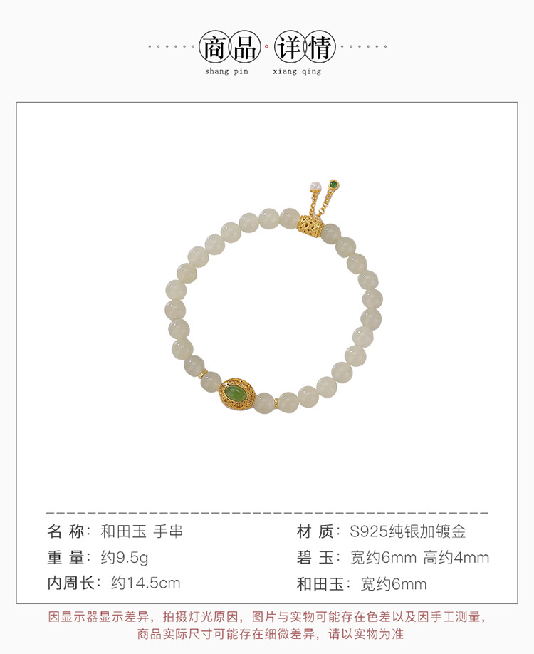 【又见寒山】S925纯银天然和田玉蛋面镂空如意圆珠手串【CW-23220】