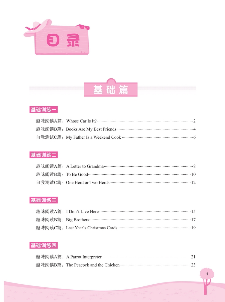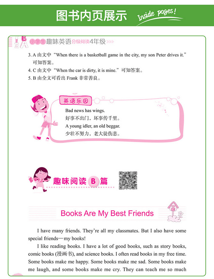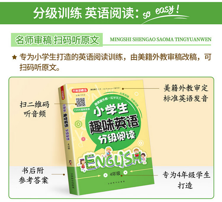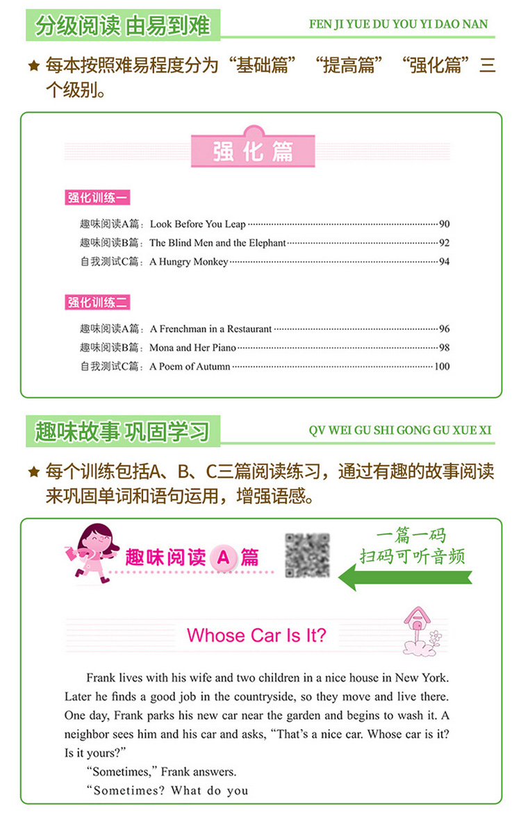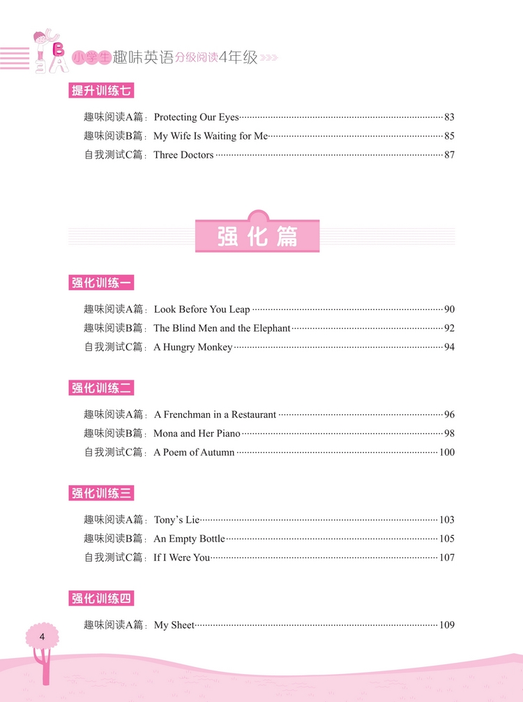 这是一套针对小学生英语阅读的图书,旨在培养阅读兴趣,提高阅读能力。全套书按照年级学习水平分成四本,每本按照难易程度分为“基础篇”“提高篇”“强化篇”三个级别,每个训练包括A、B、C三篇阅读练习,通过有趣的故事阅读来巩固单词和语句运用,增强语感。 知识点和题型设置涵盖了小学英语阅读中常出现的知识要点和训练形式。文中配有清晰有趣的插图,既能够帮助学生理解故事内容,又可以激发学生阅读的积极性。