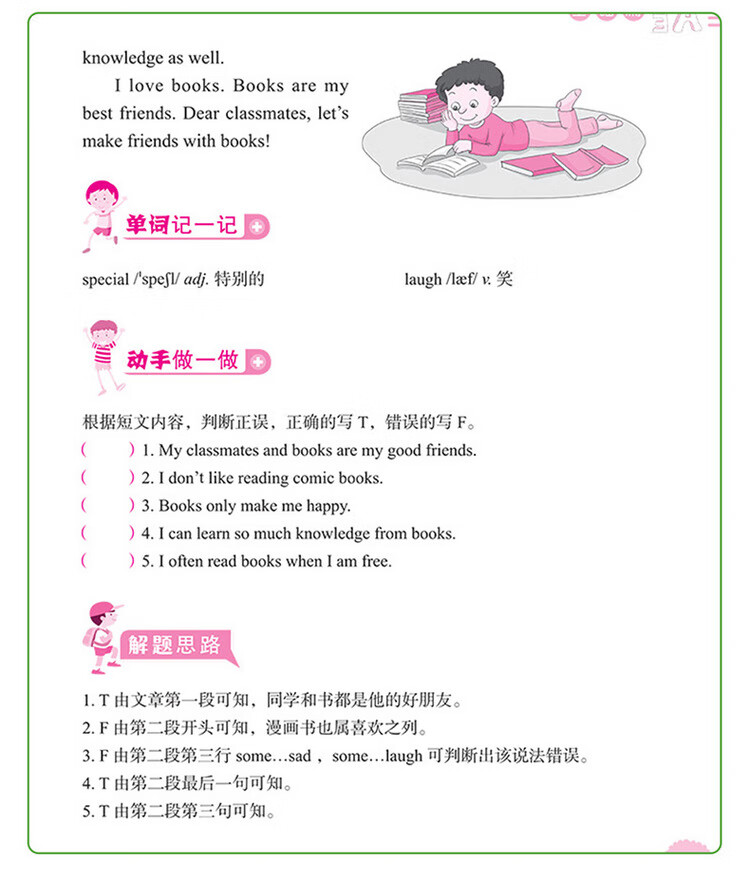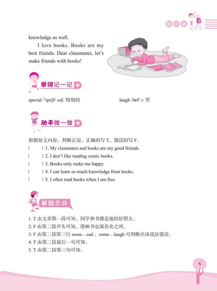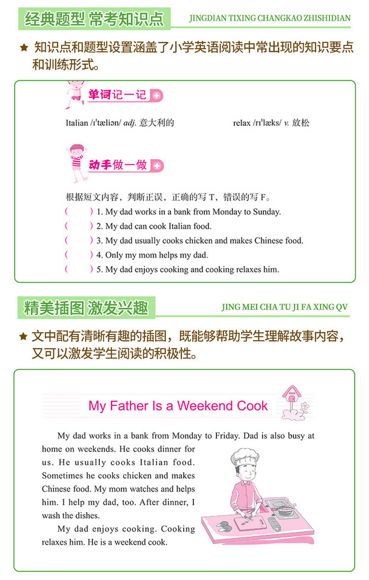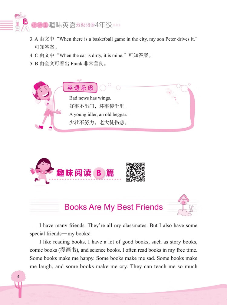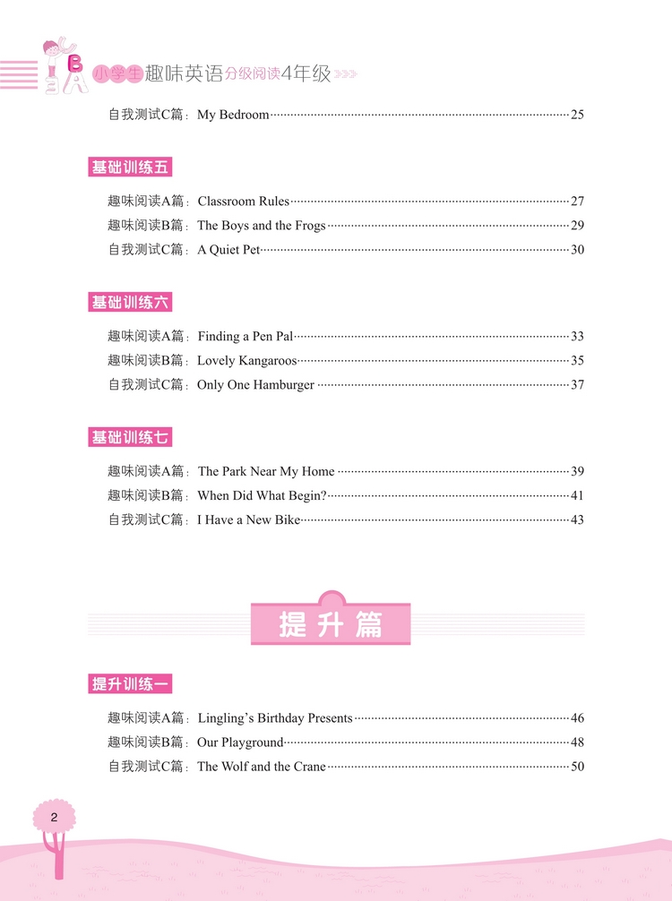 这是一套针对小学生英语阅读的图书,旨在培养阅读兴趣,提高阅读能力。全套书按照年级学习水平分成四本,每本按照难易程度分为“基础篇”“提高篇”“强化篇”三个级别,每个训练包括A、B、C三篇阅读练习,通过有趣的故事阅读来巩固单词和语句运用,增强语感。 知识点和题型设置涵盖了小学英语阅读中常出现的知识要点和训练形式。文中配有清晰有趣的插图,既能够帮助学生理解故事内容,又可以激发学生阅读的积极性。