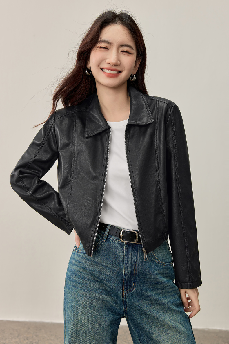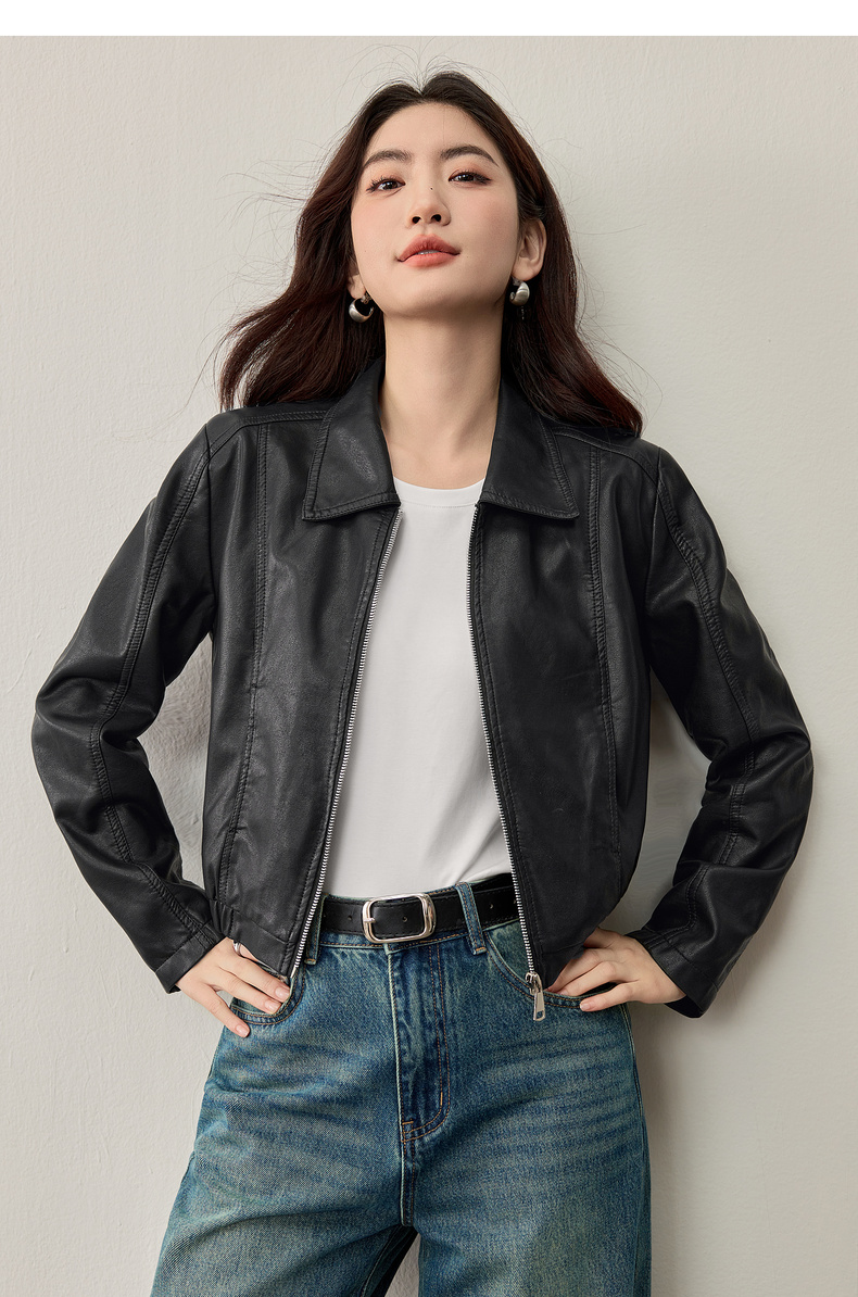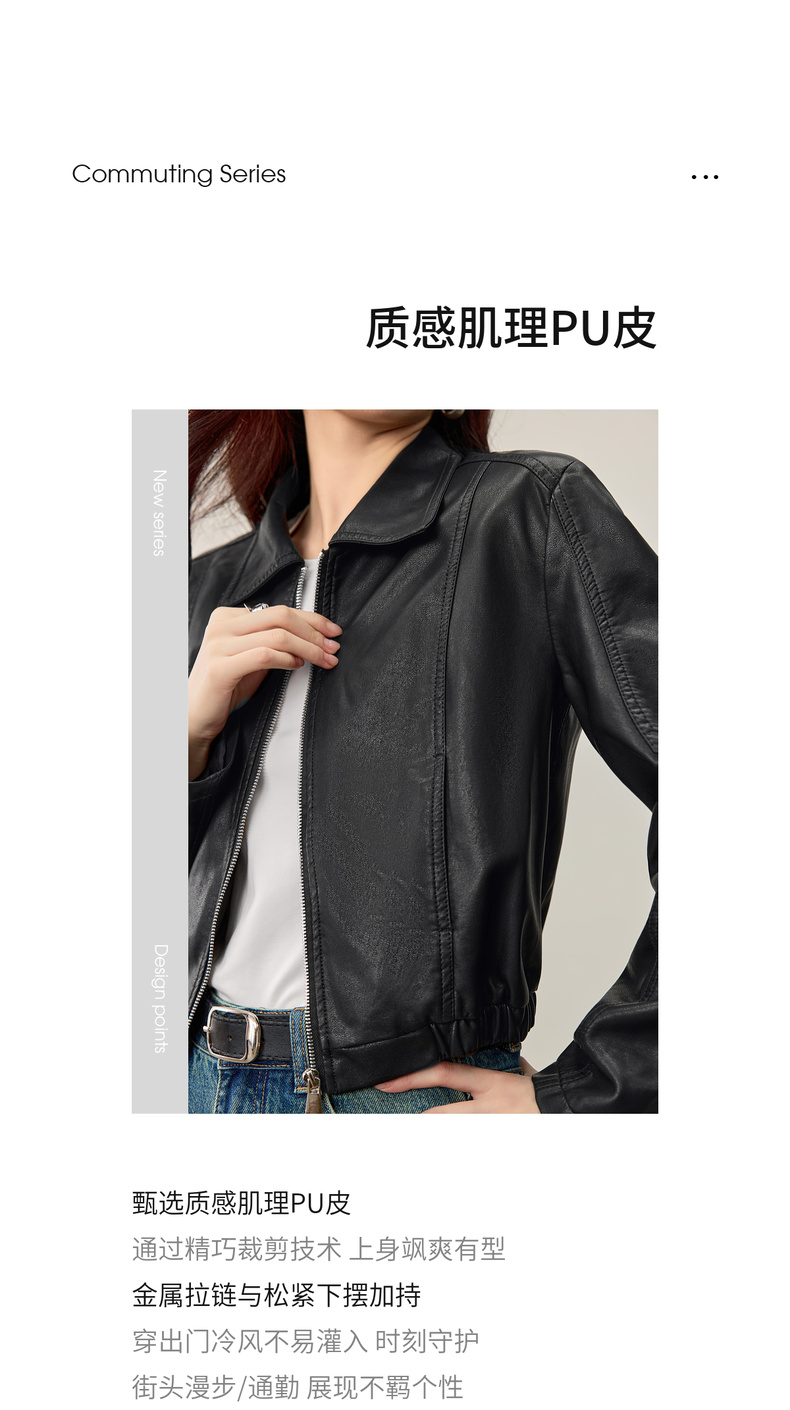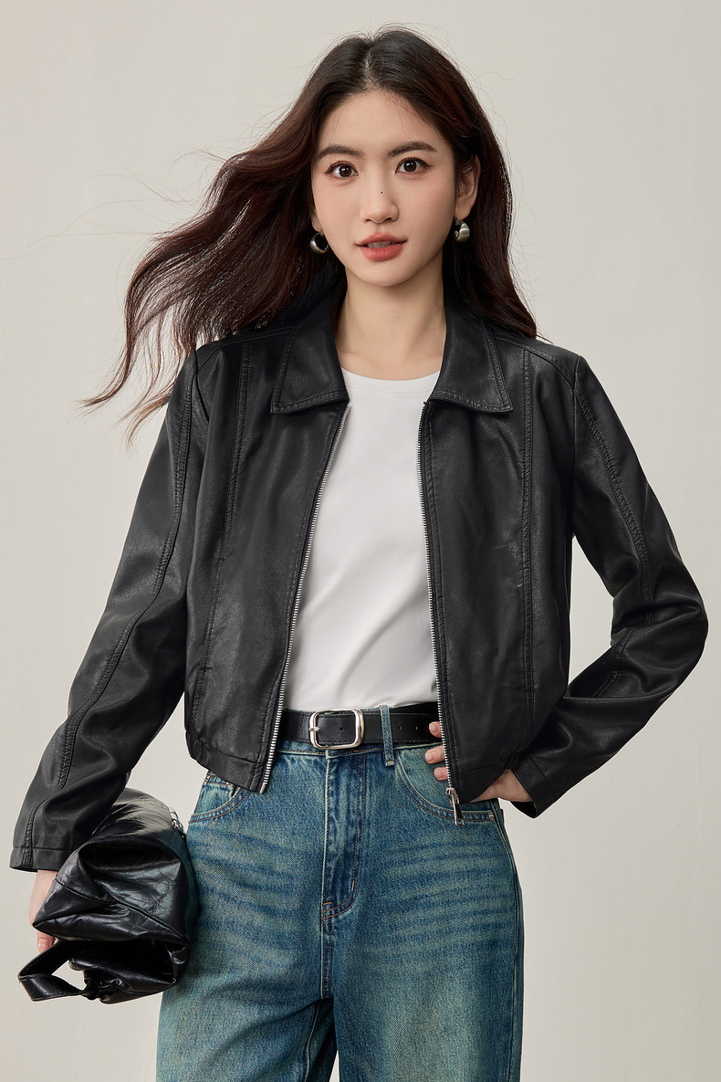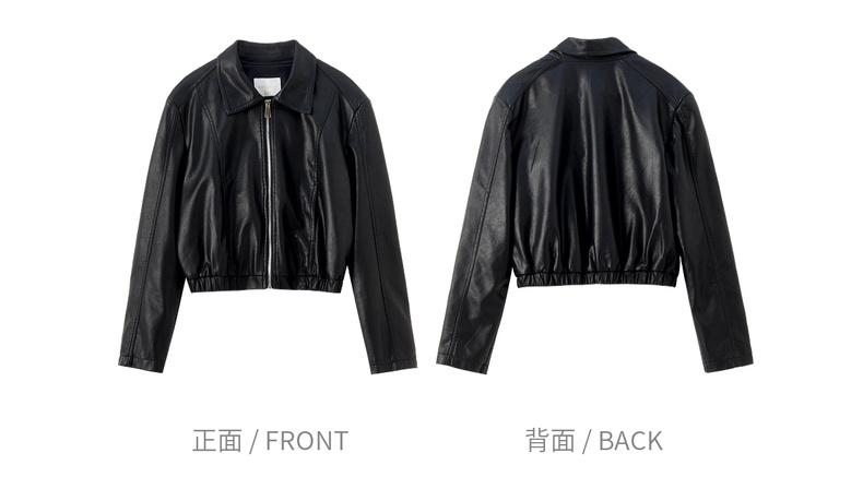 【内购】【松紧下摆】摩登都市通勤翻领金属拉链直筒长袖PU皮外套-W53GA2745