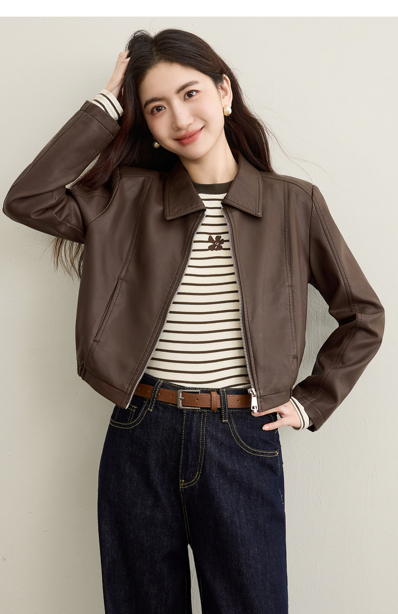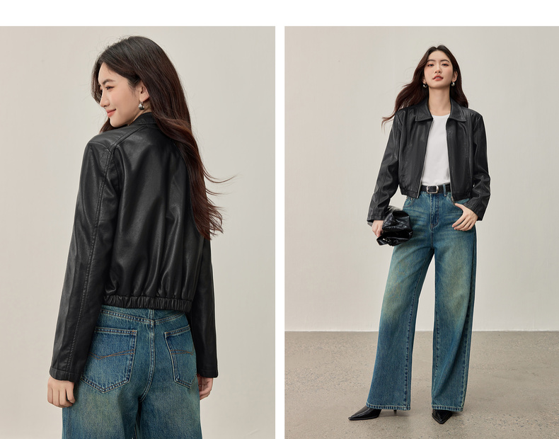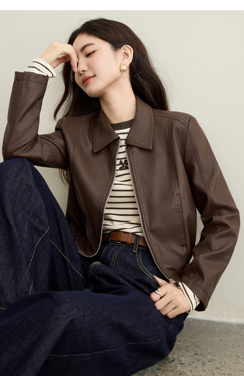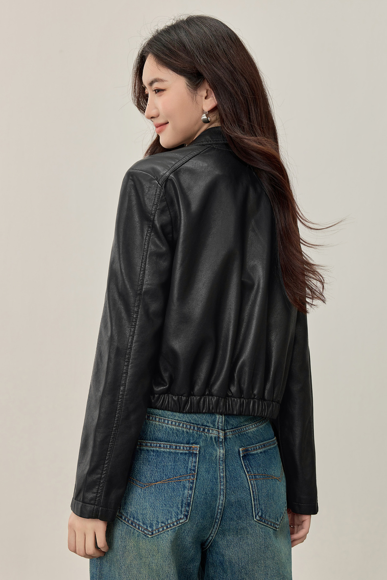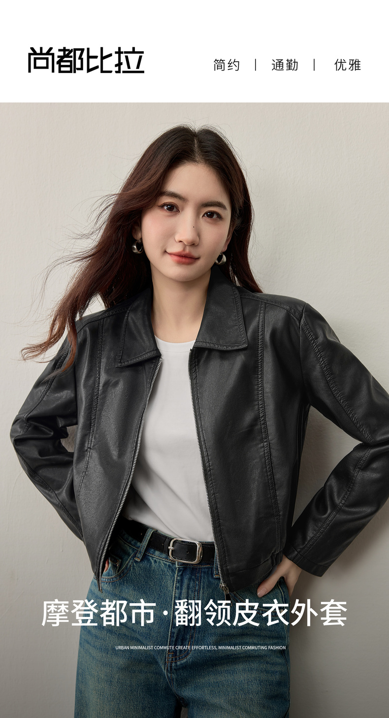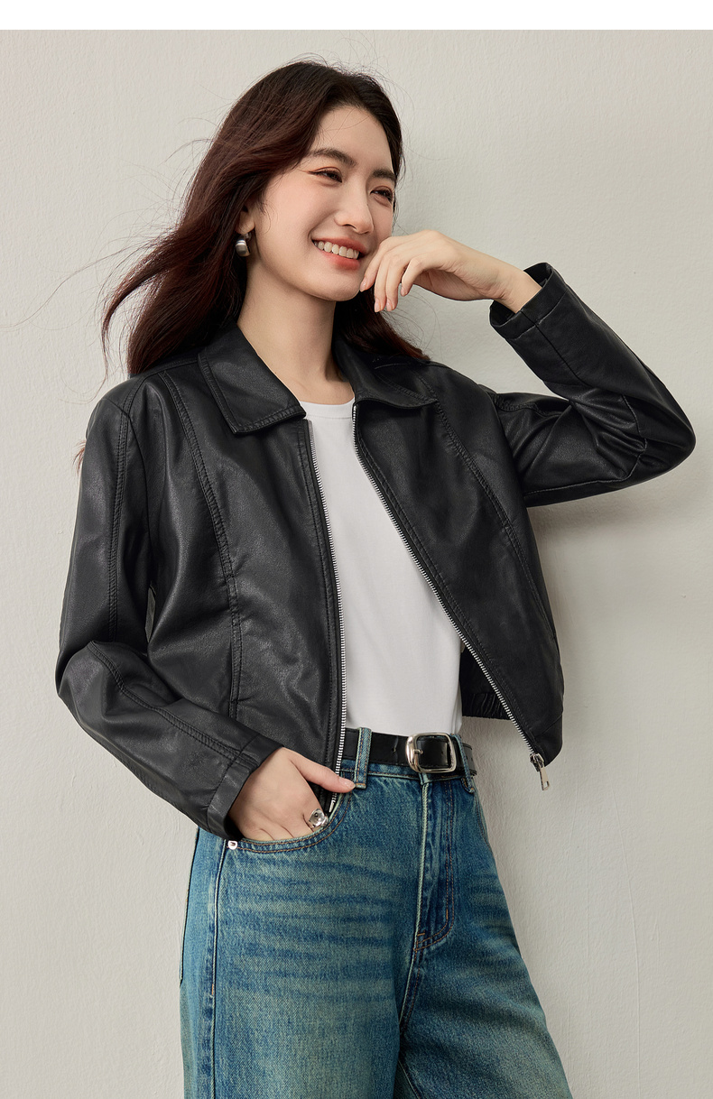 【内购】【松紧下摆】摩登都市通勤翻领金属拉链直筒长袖PU皮外套-W53GA2745
