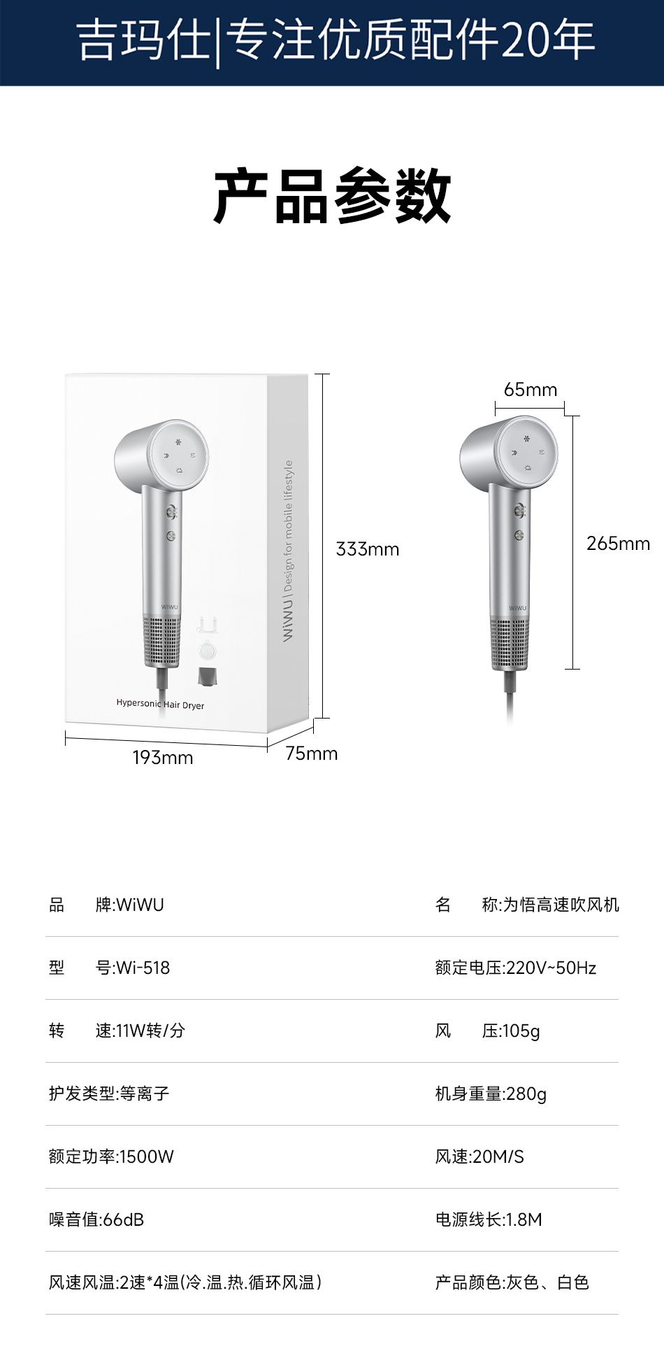 唯吾 智能设备 高速吹风机 Wi-518灰色