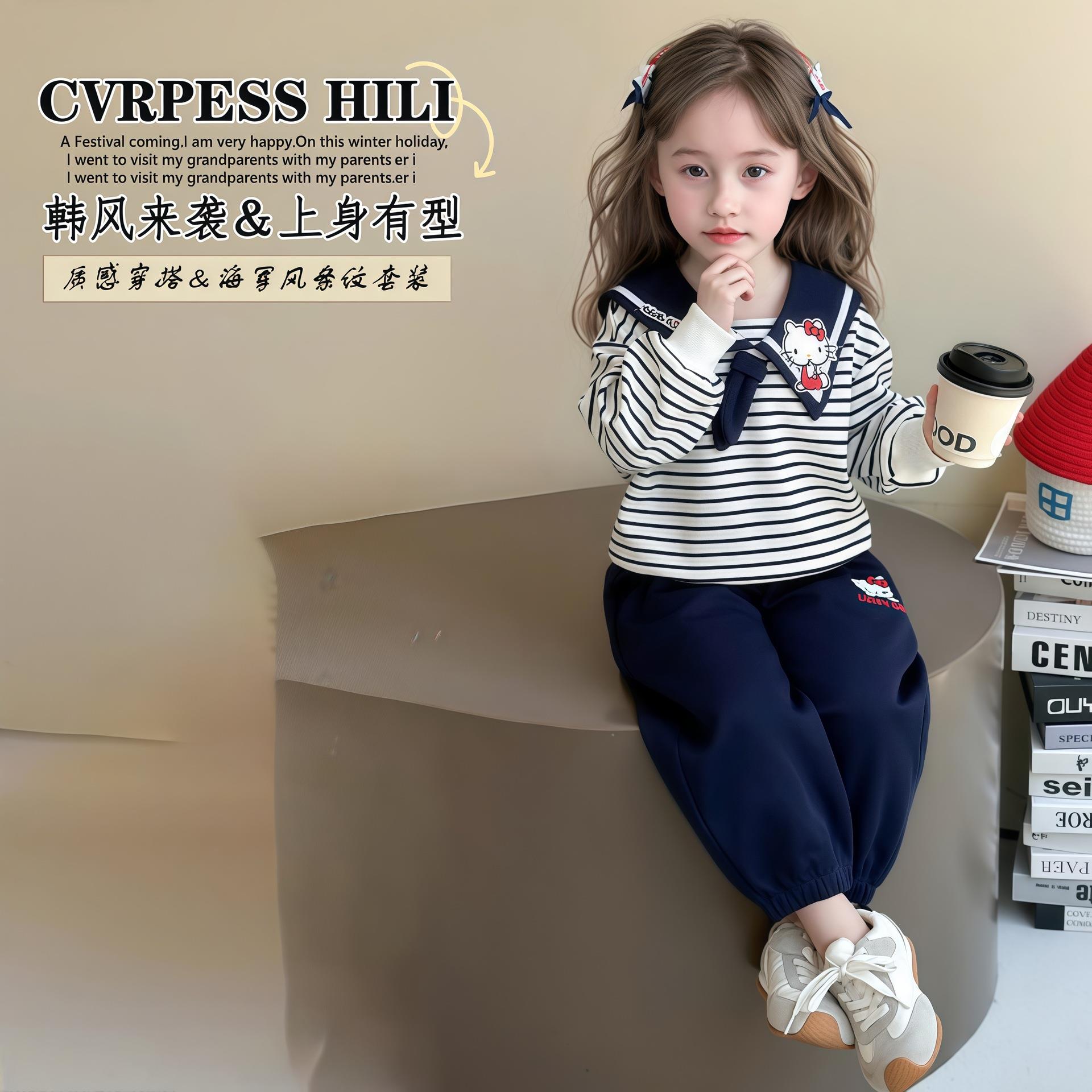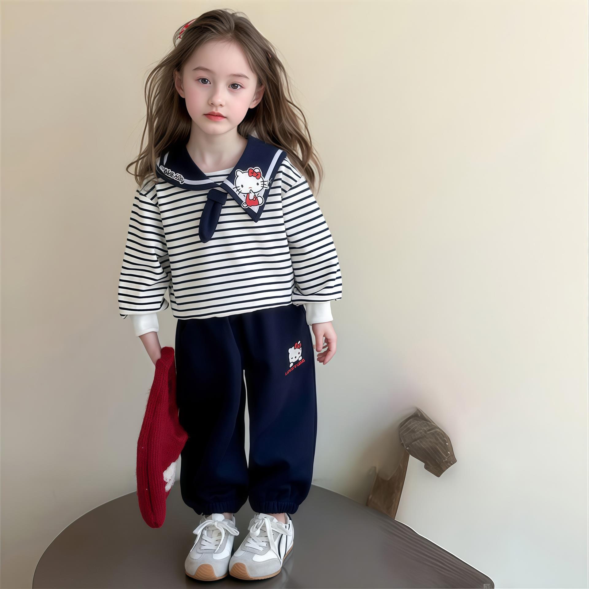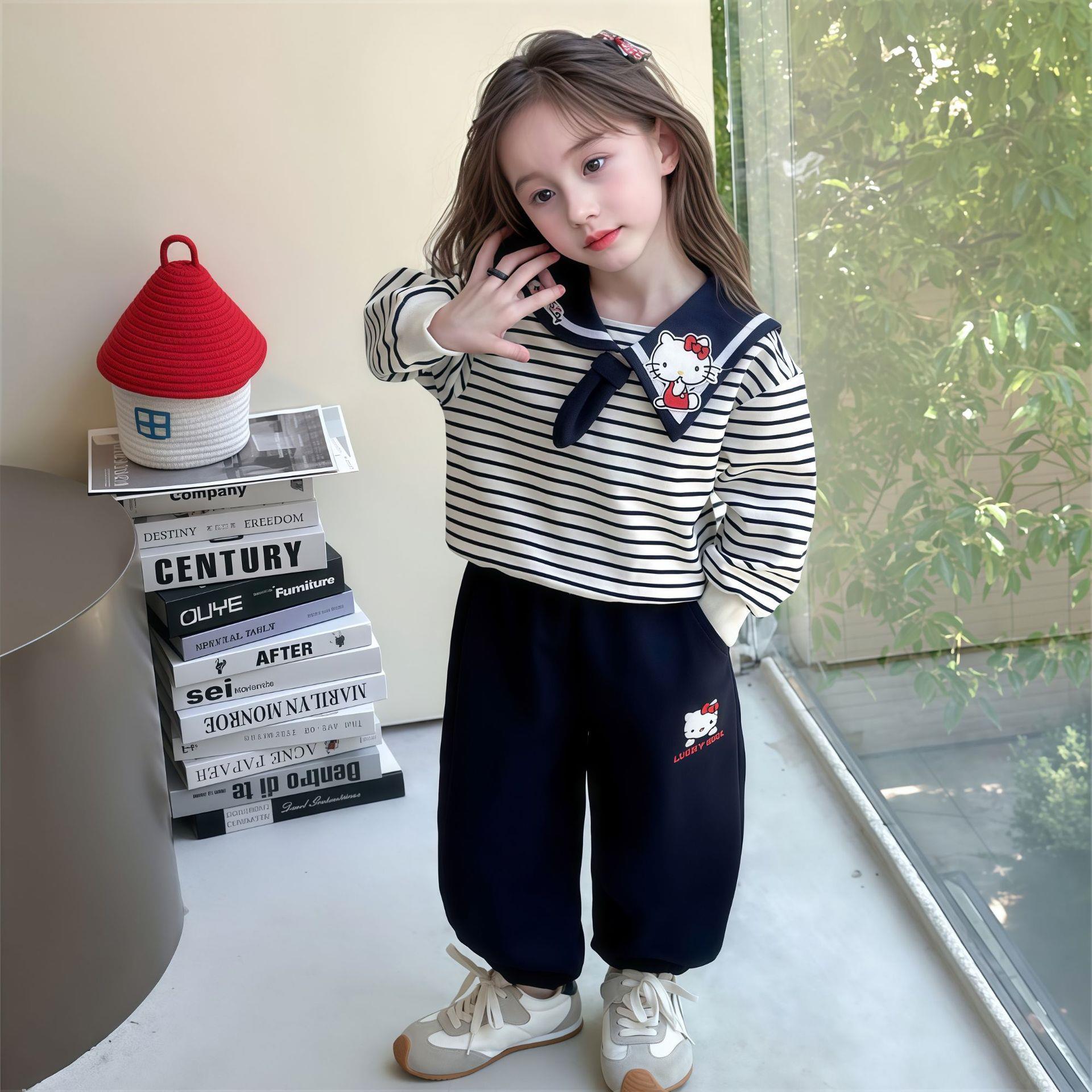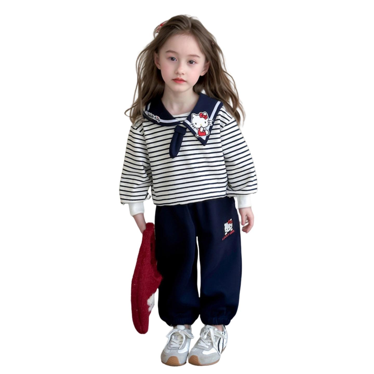 Laffey & Monkey女童秋款卫衣套装儿童可爱海军领休闲运动套装宝宝卡通条纹蝴蝶结80-150