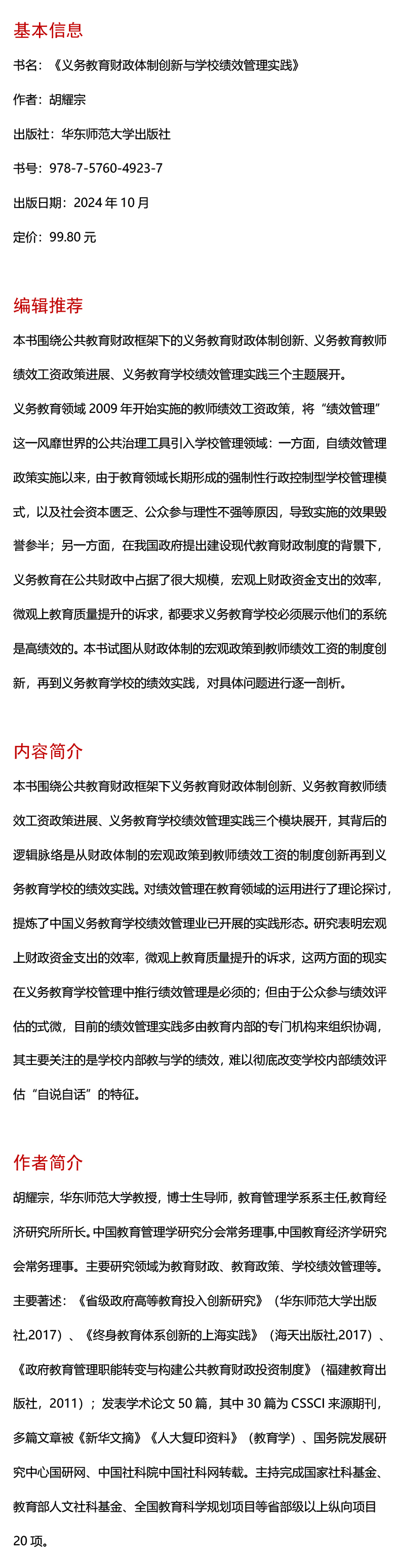 本书围绕公共教育财政框架下义务教育财政体制创新、义务教育教师绩效工资政策进展、义务教育学校绩效管理实践三个模块展开, 其背后的逻辑脉络是从财政体制的宏观政策到教师绩效工资的制度创新再到义务教育学校的绩效实践。对绩效管理在教育领域的运用进行了理论探讨, 提炼了中国义务教育学校绩效管理业已开展的实践形态。研究表明宏观上财政资金支出的效率, 微观上教育质量提升的诉求, 这两方面的现实在义务教育学校管理中推行绩效管理是必须的; 但由于公众参与绩效评估的式微, 目前的绩效管理实践多由教育内部的专门机构来组织协调, 其主要关注的是学校内部教与学的绩效, 难以改变学校内部绩效评估“自说自话”的特征。