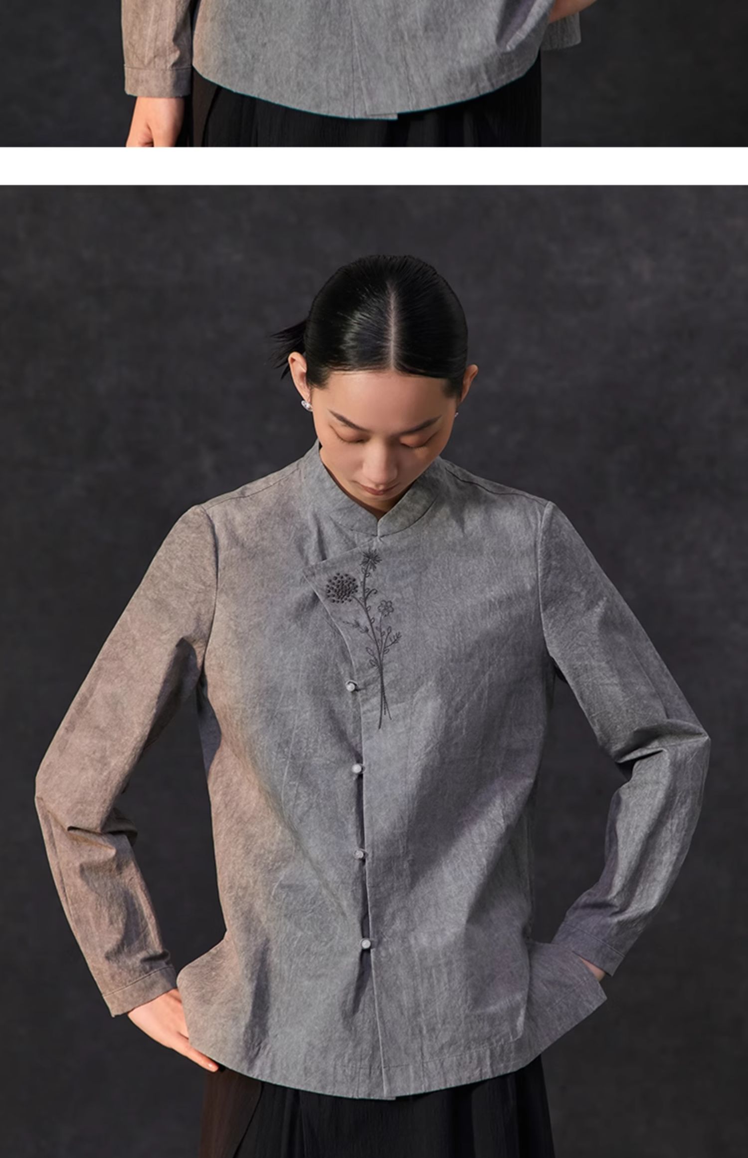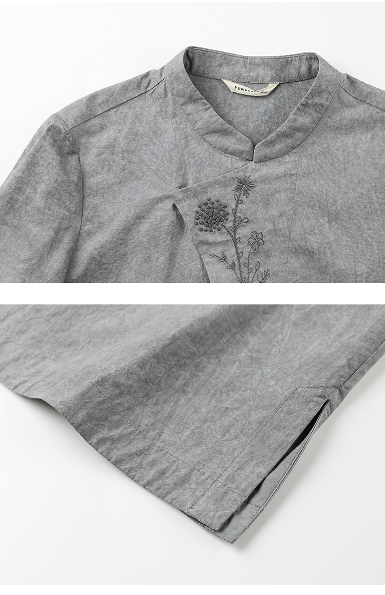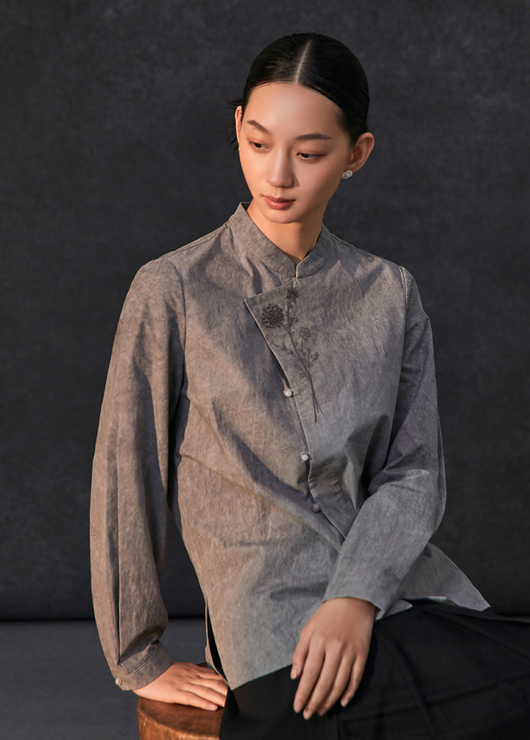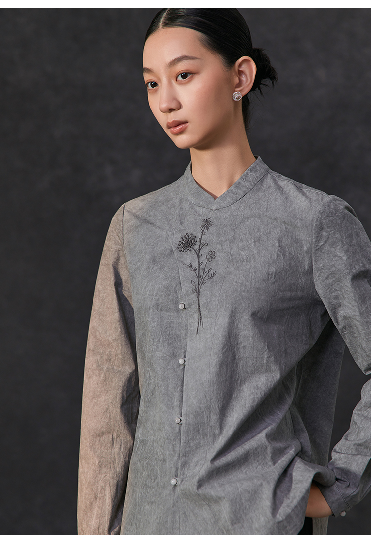Famecoco复古新中式立领手工花朵刺绣衬衫女棉长袖衬衣FAC1BA001