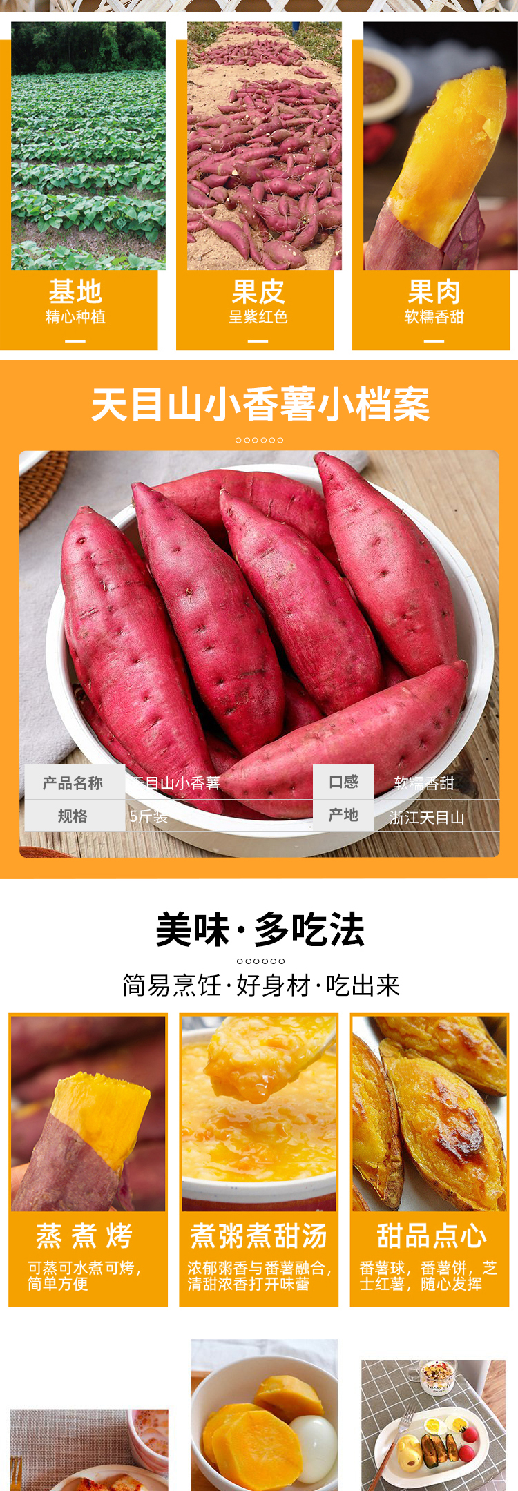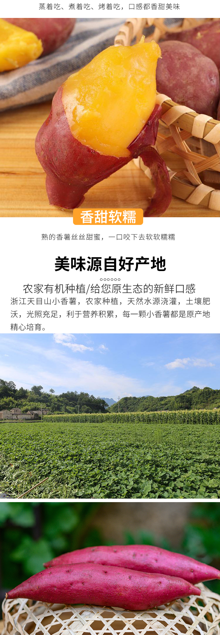 天目山小香薯的美 更多的体现在它的口感, 这是最直观的味蕾感受,香气扑鼻,耐人寻味,香甜软糯粉,蒸煮烤炸,百变美味 更适合蒸 甘甜爽糯!