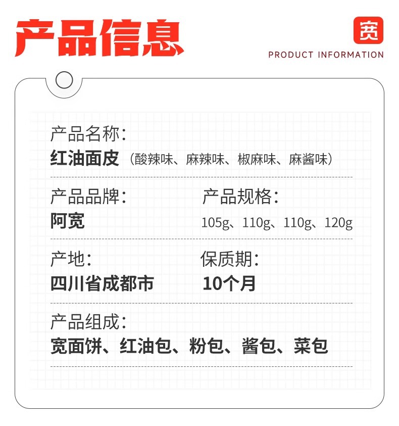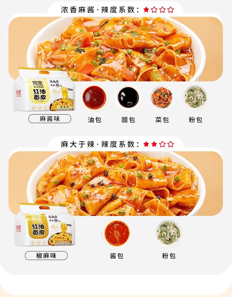 【8包超值!阿宽红油面皮】甄选优质原料,多种口味任选,麻辣椒/麻酸辣,综合味四联包,夜宵速食方便面冲泡面L