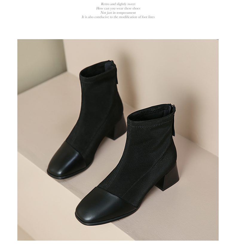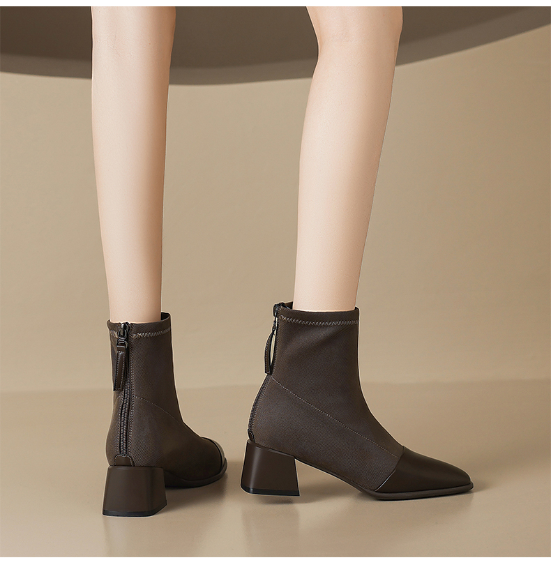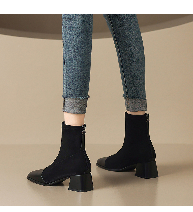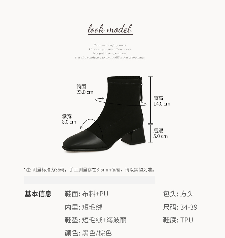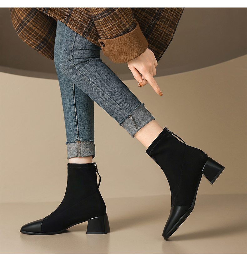 ZHR中跟短靴女2022秋冬新款韩版方头粗跟女靴百搭加绒保暖瘦瘦靴
