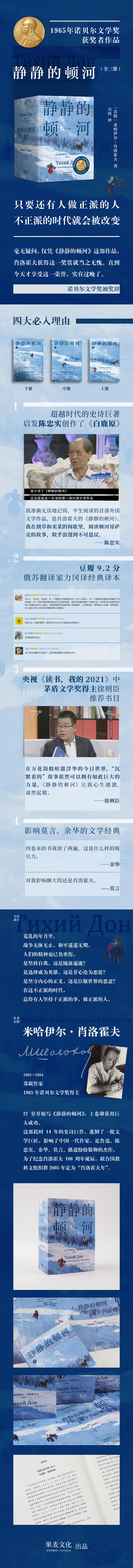 《静静的顿河》是苏联作家肖洛霍夫的长篇小说,作者凭此获得1965年诺贝尔文学奖。本书展示了1912到1922年间,俄国顿河地区哥萨克人在一战、二月革命和十月革命以及国内战争中的苦难历程。主人公格里高利,动摇于妻子娜塔莉亚与情人阿克西妮亚之间,徘徊于革命与反革命之间,他既是英雄,也是受难者。无论战争有多荒谬,他都始终善良勇敢正直。作者关心在夹缝中生存的普通人,赞美了在残酷的环境中仍保持美好人性的人,他尊重人的价值,希望用自己的作品帮助人们变得更好,改变不完善的世界。这本书让我们相信:只要还有人做正派的人,不正派的时代就会被改变。