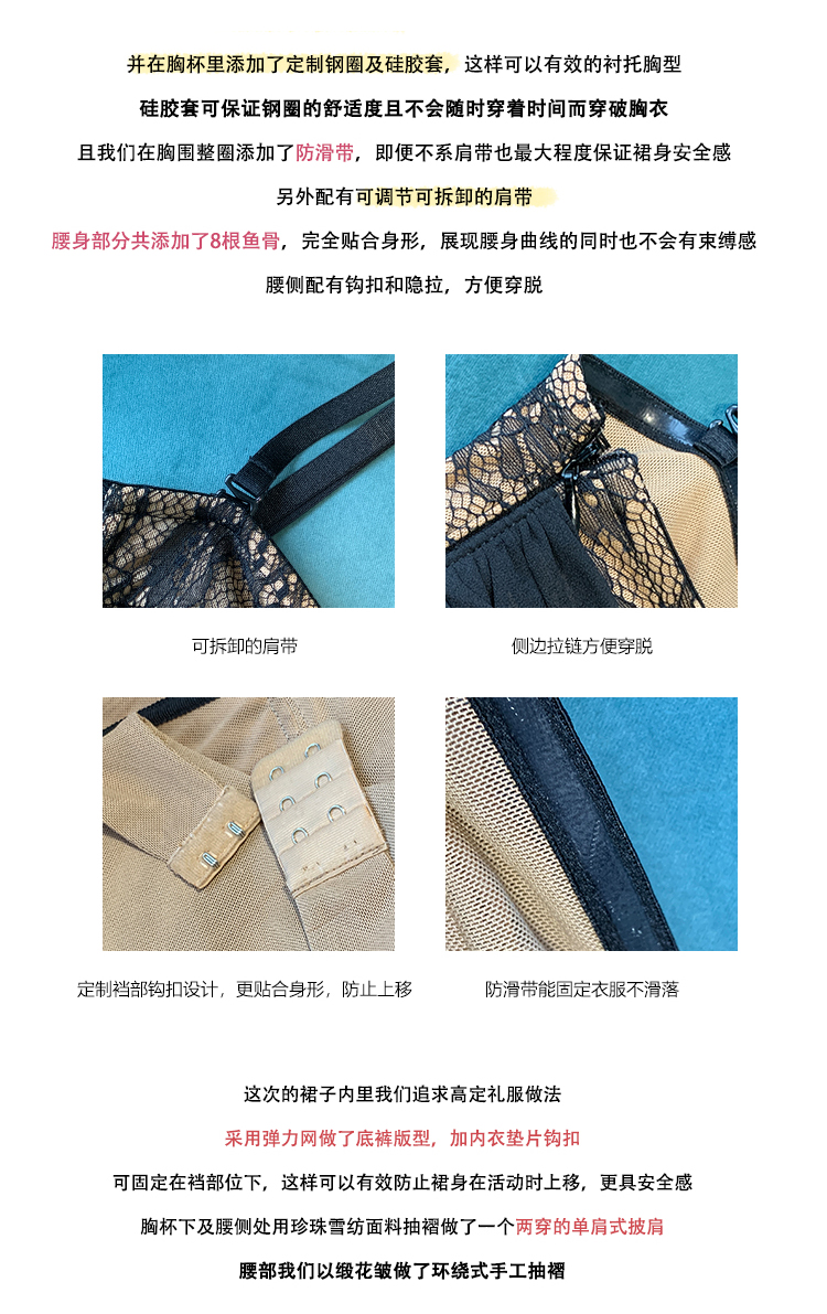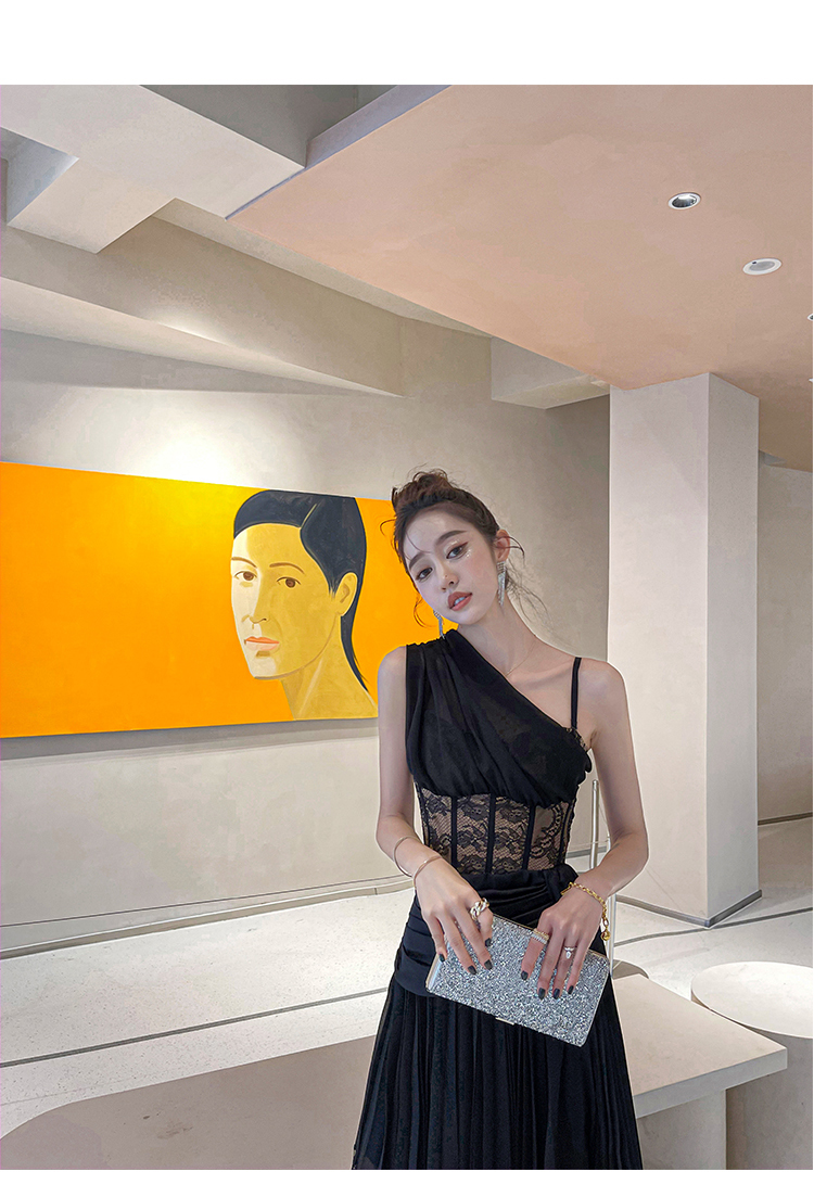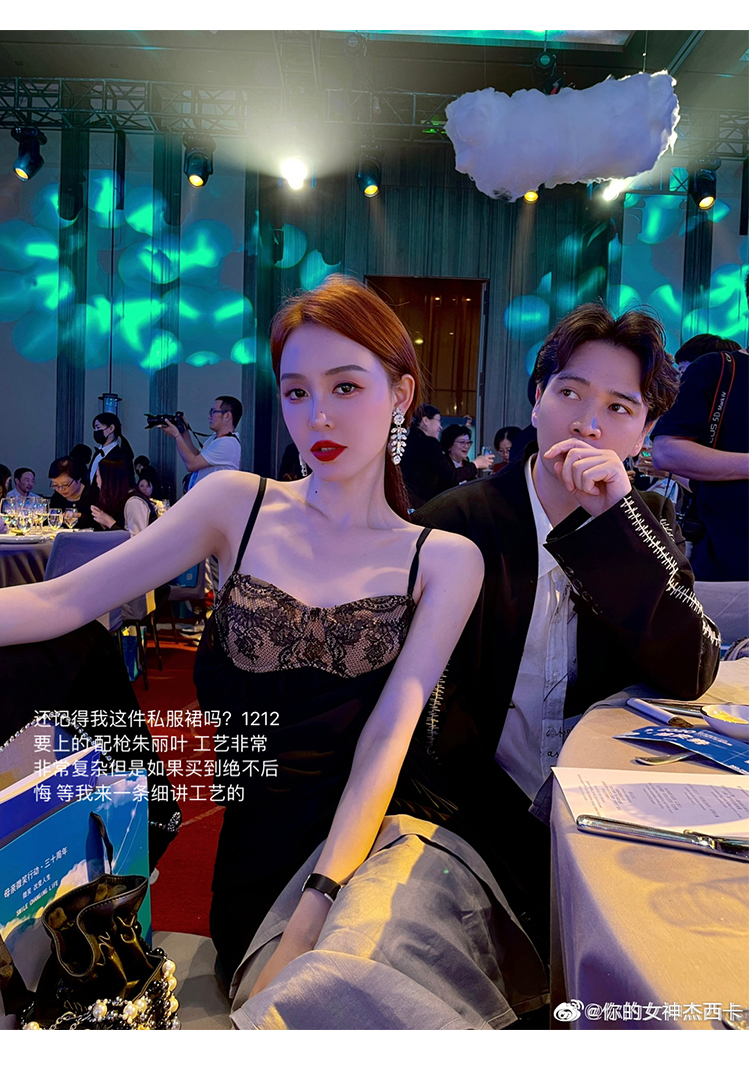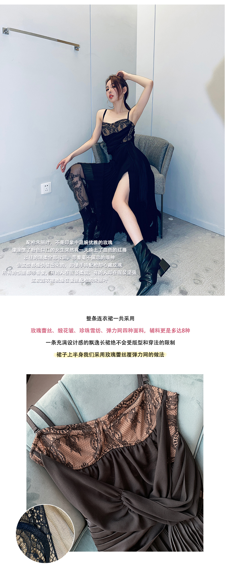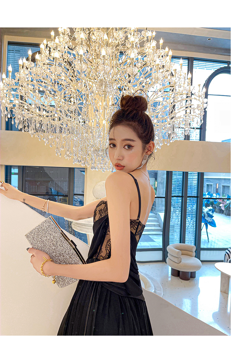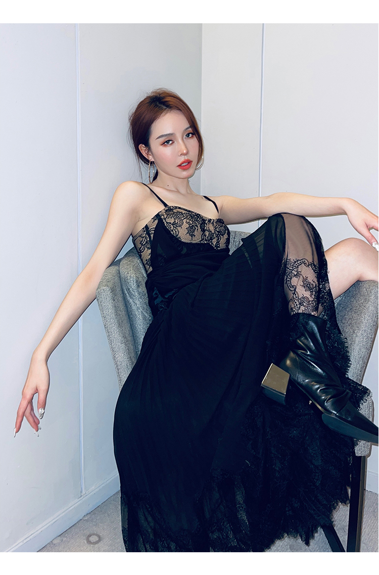 BeQueenStory【配枪朱丽叶】重工缎面拼接蕾丝吊带裙修身小黑裙