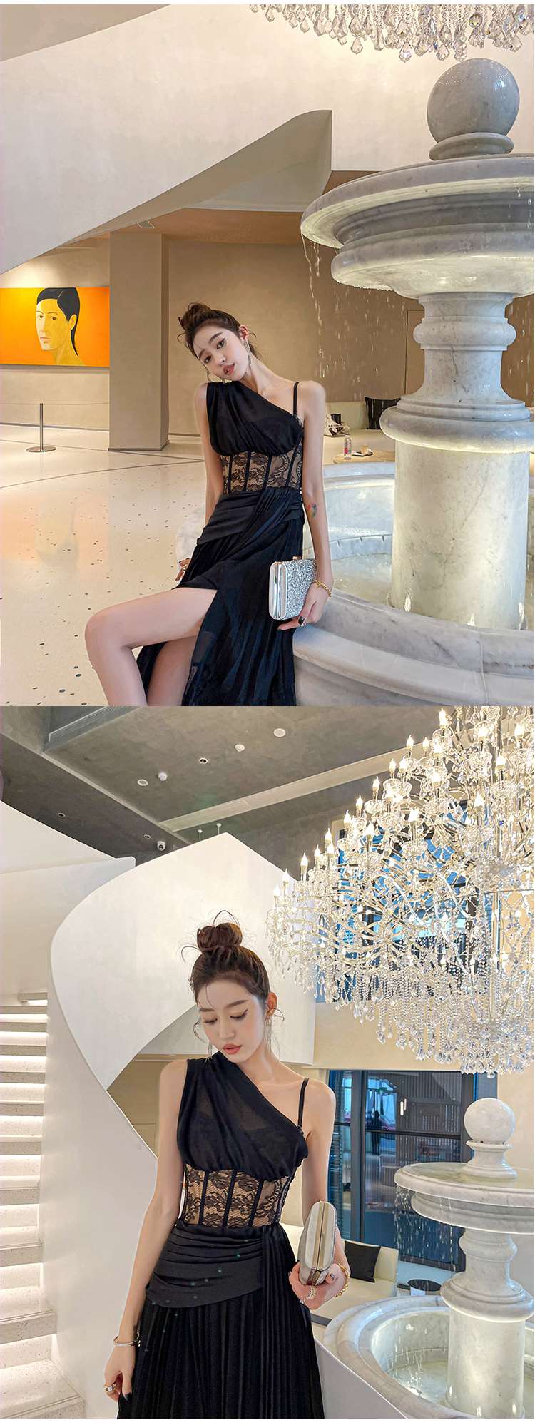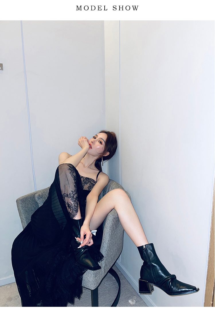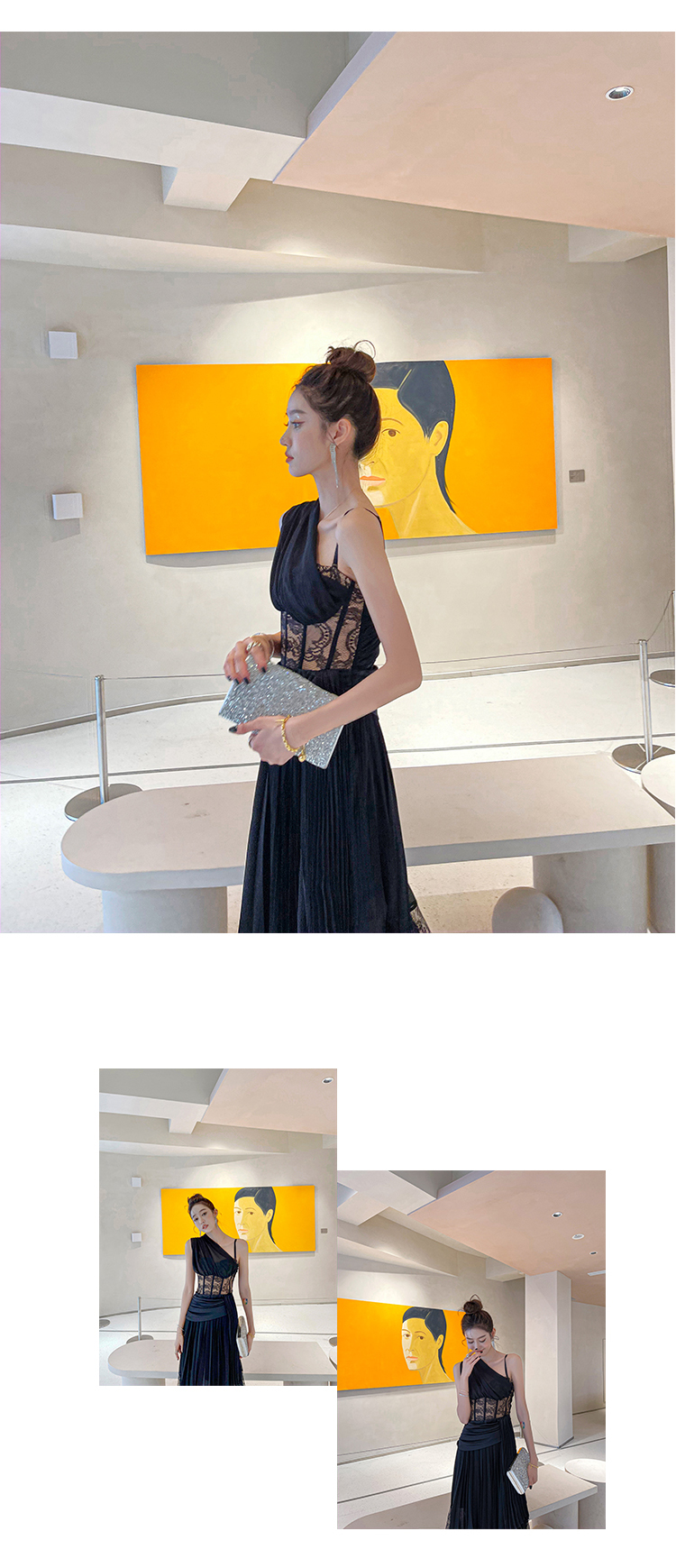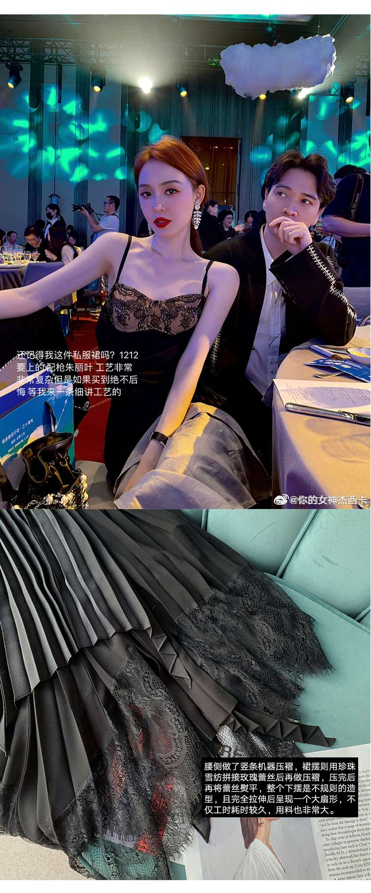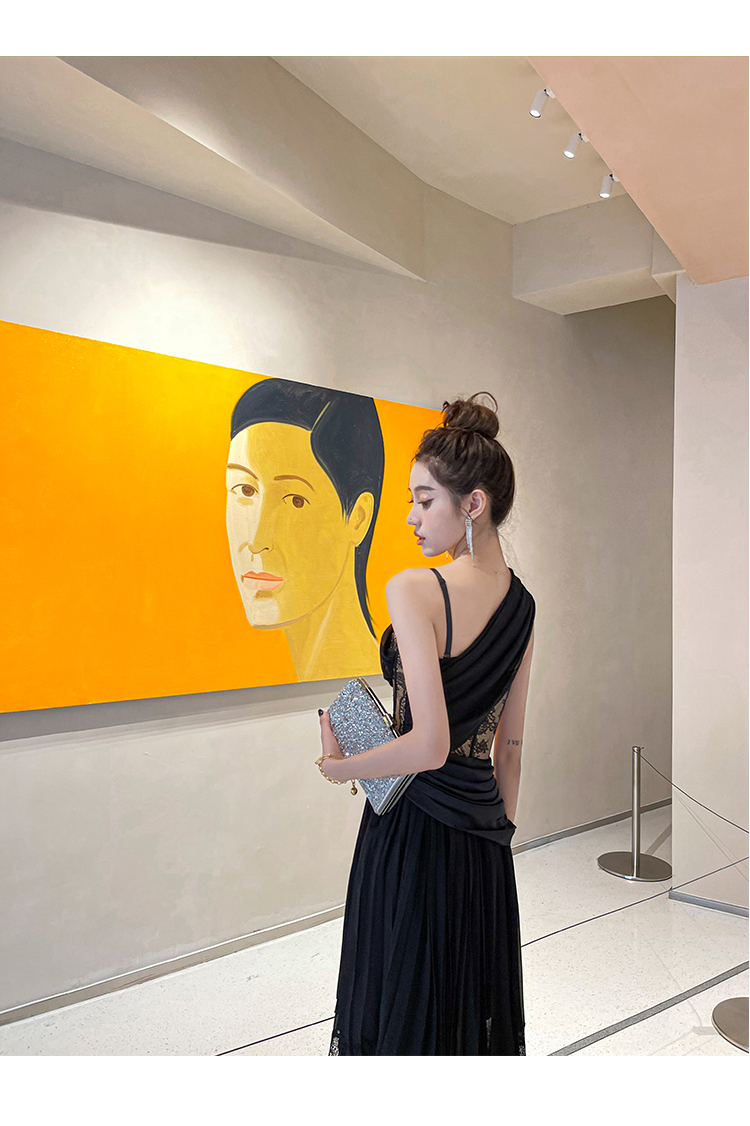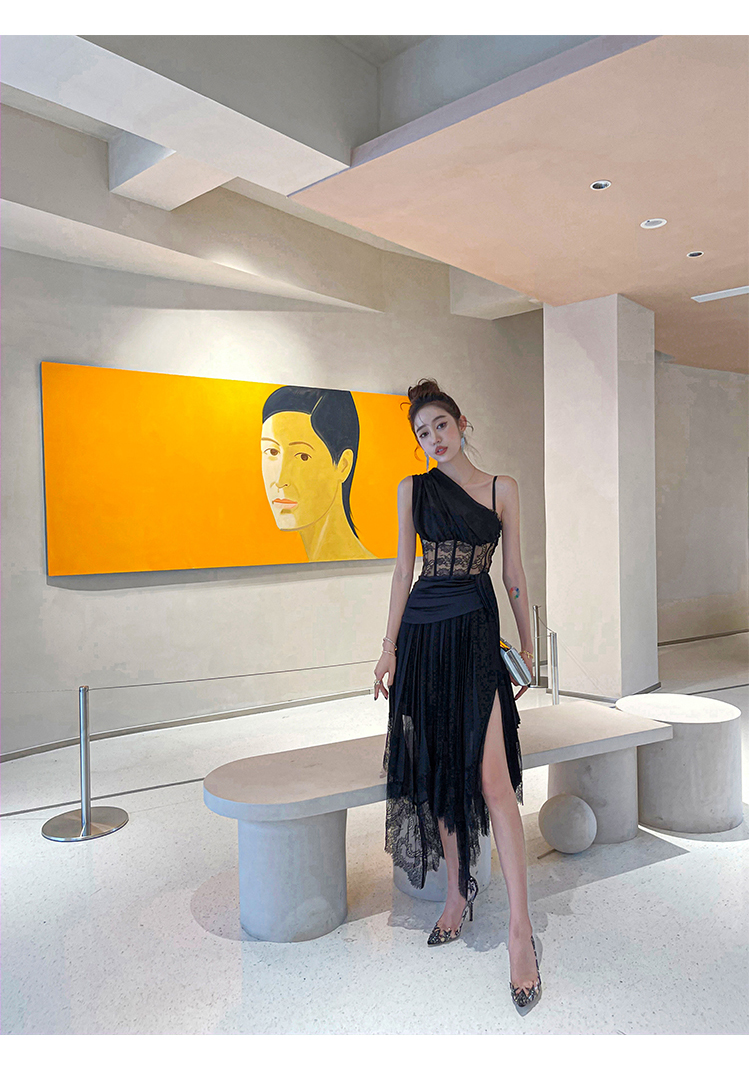 BeQueenStory【配枪朱丽叶】重工缎面拼接蕾丝吊带裙修身小黑裙