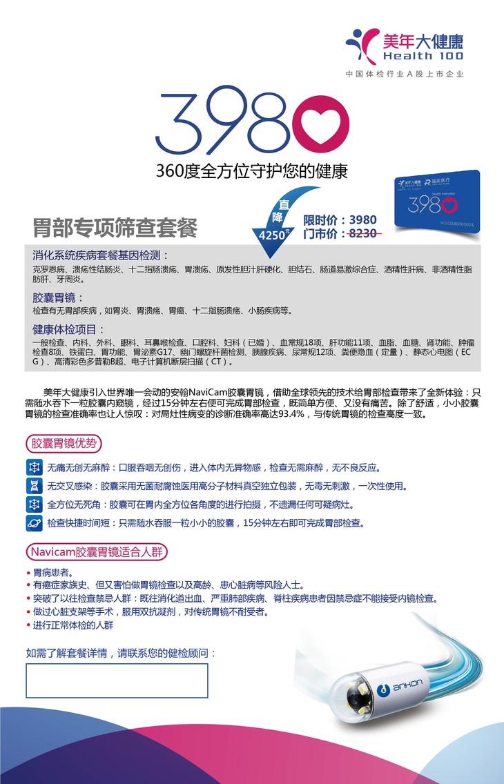 郑重承诺!本商品是【美年大健康体检中心】官方授权套餐,全国通用,绝无虚抬价格、修改内容等虚假行为。