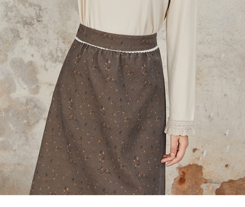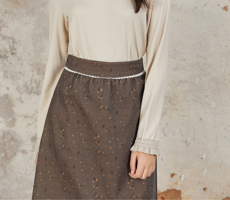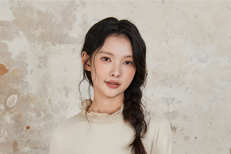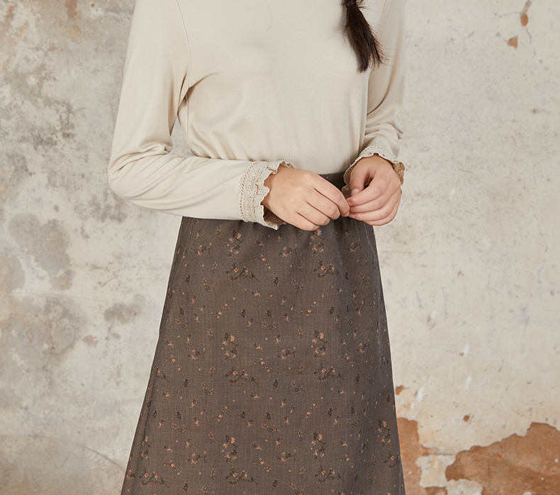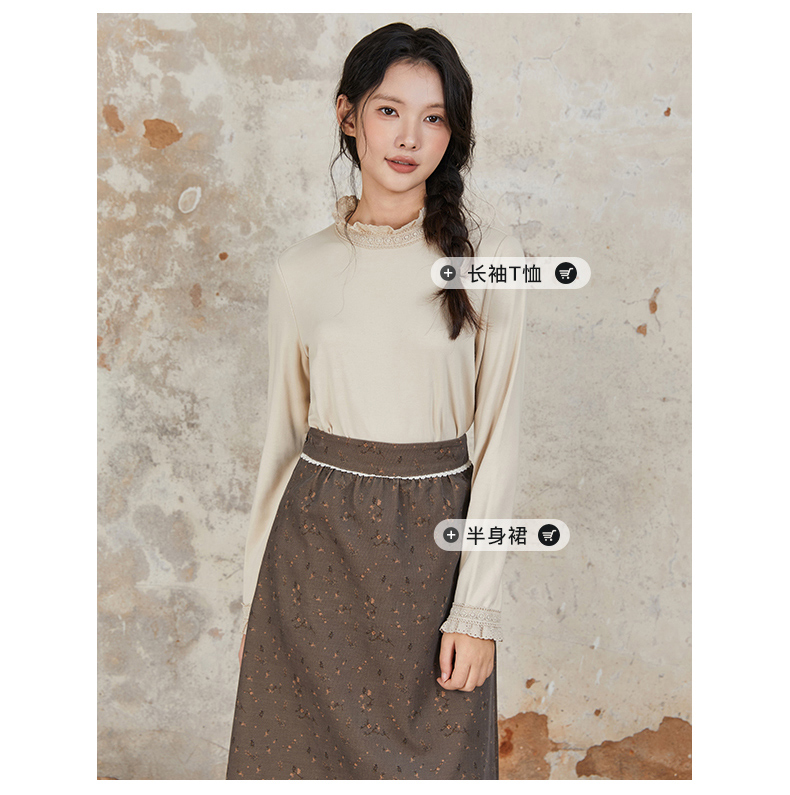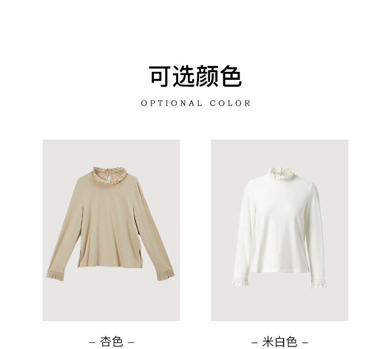 Famecoco范可儿长袖T恤 刺绣花边领口袖口纯色文艺内搭