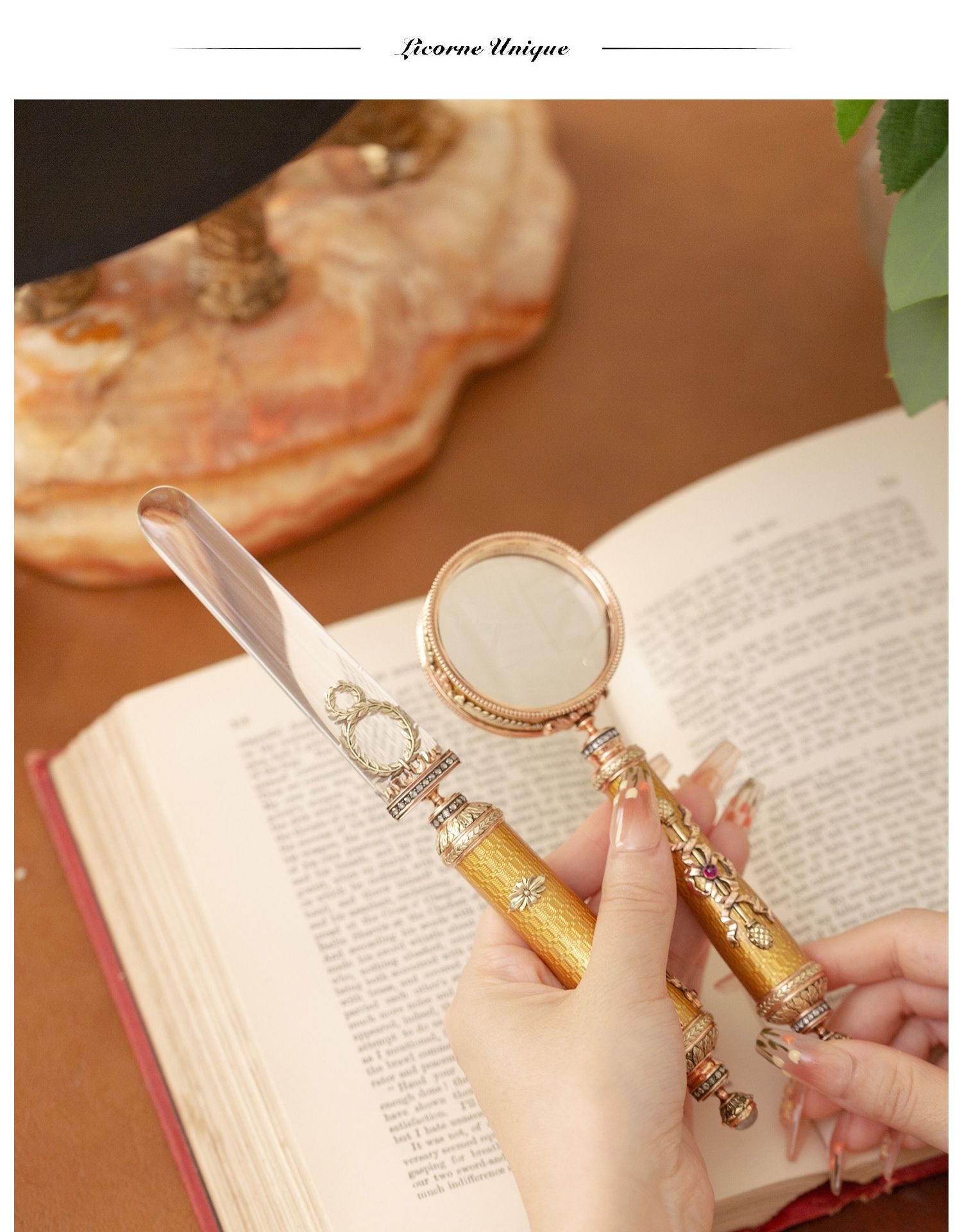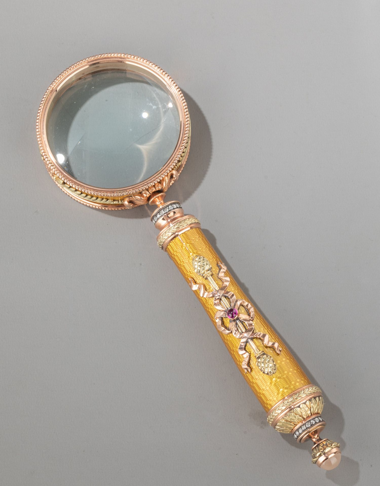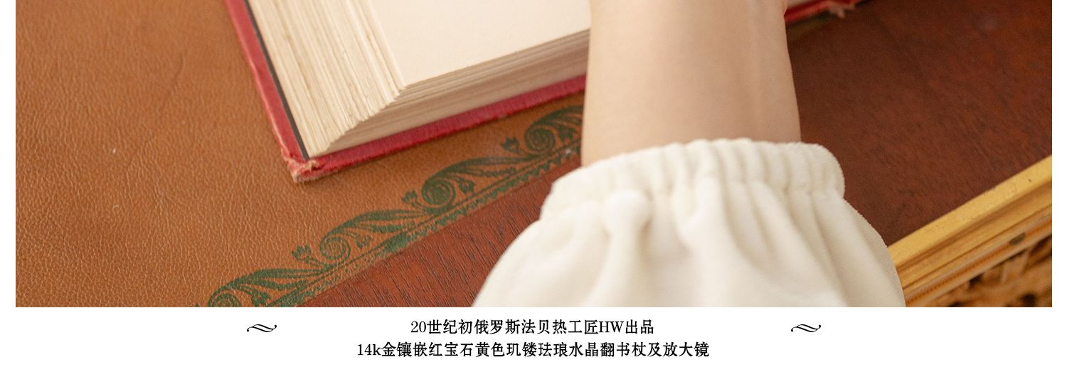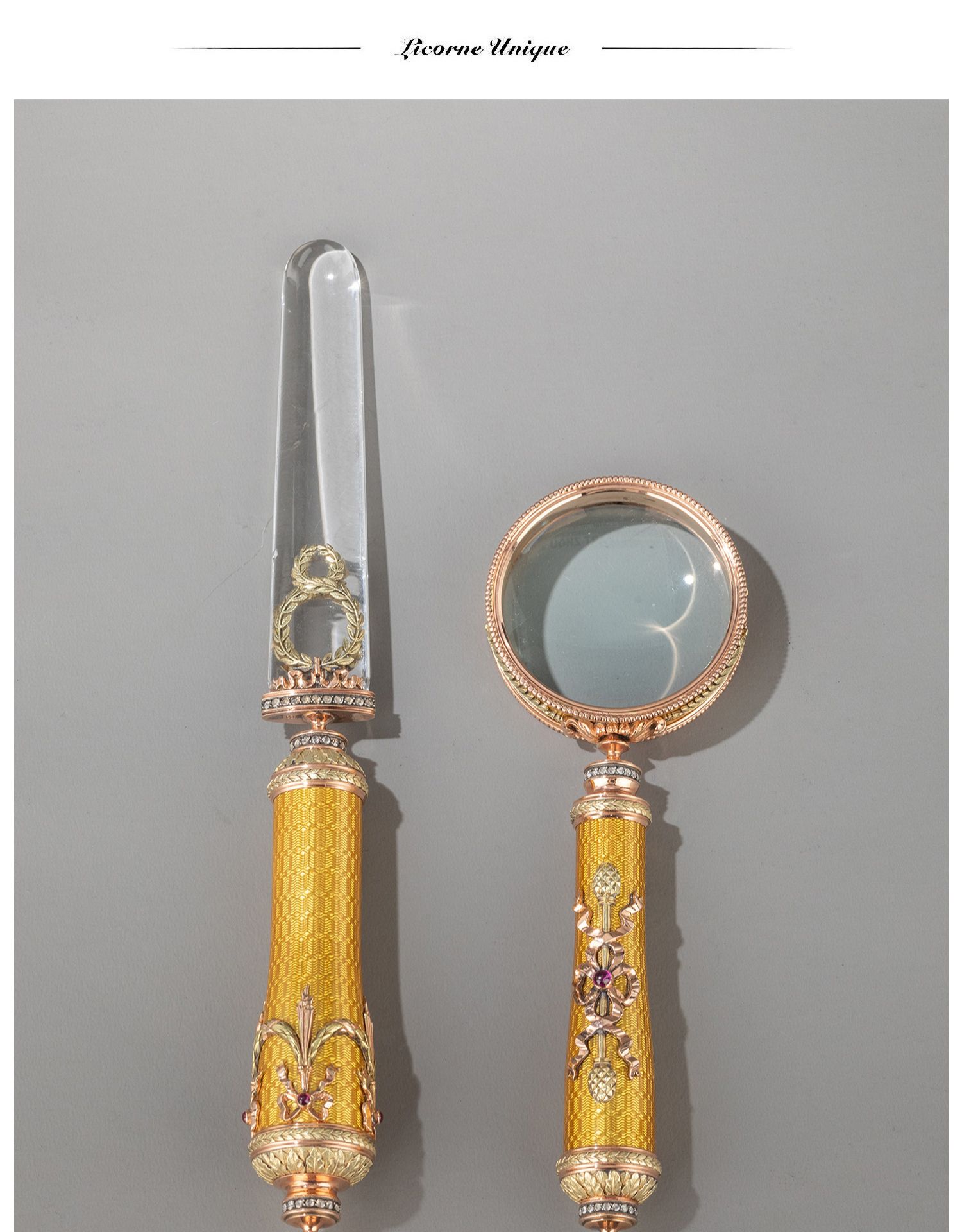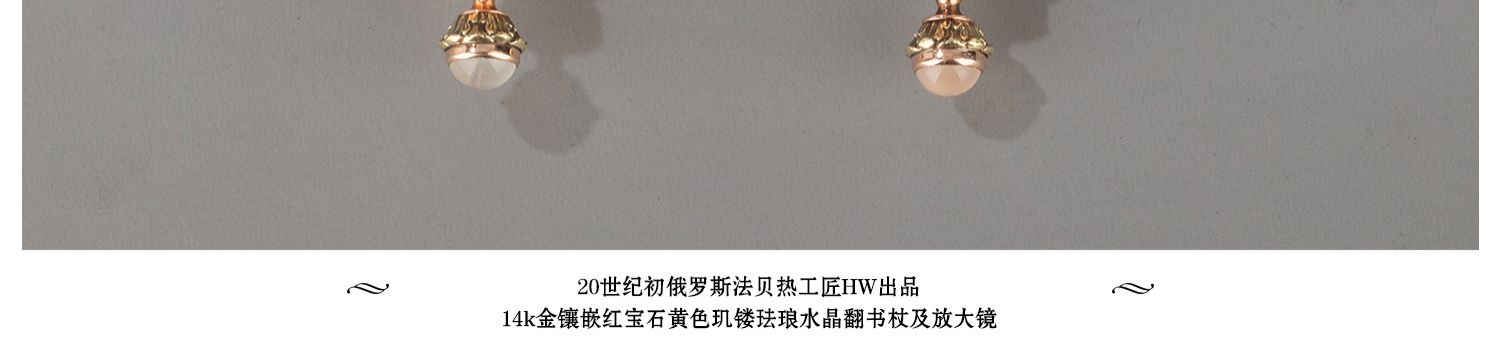 独角鹿西洋古董法贝热14K金镶红宝石玑镂珐琅水晶翻书杖放大镜