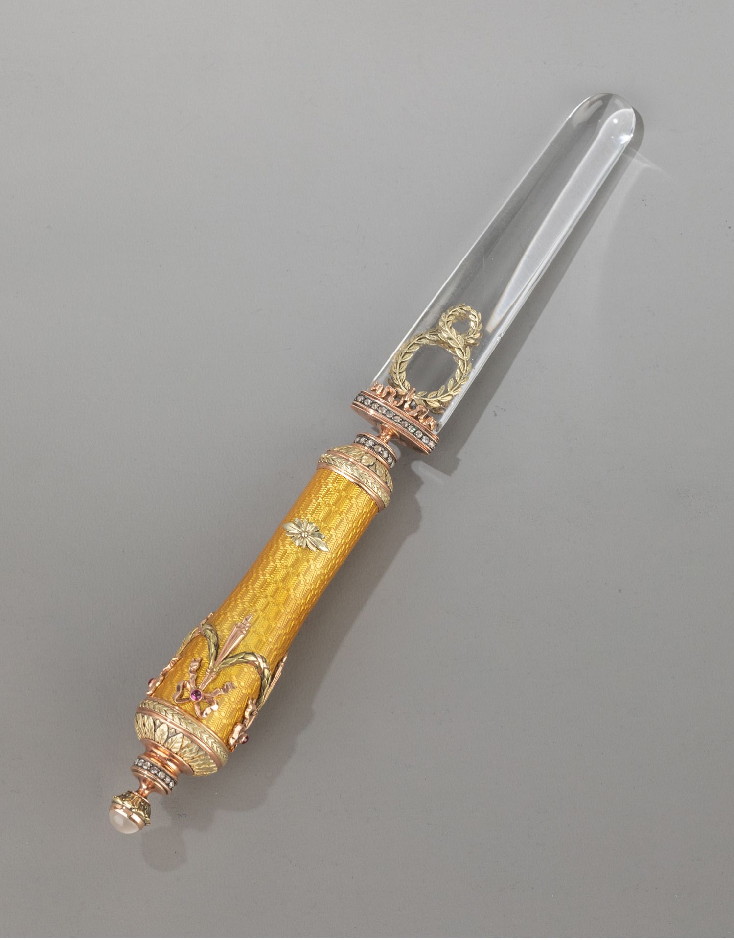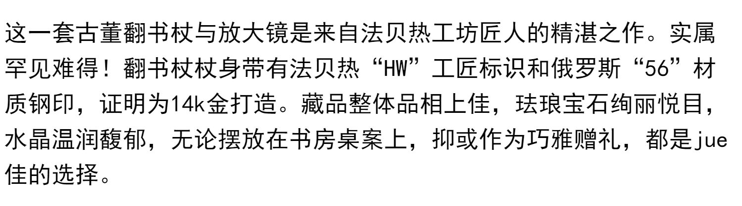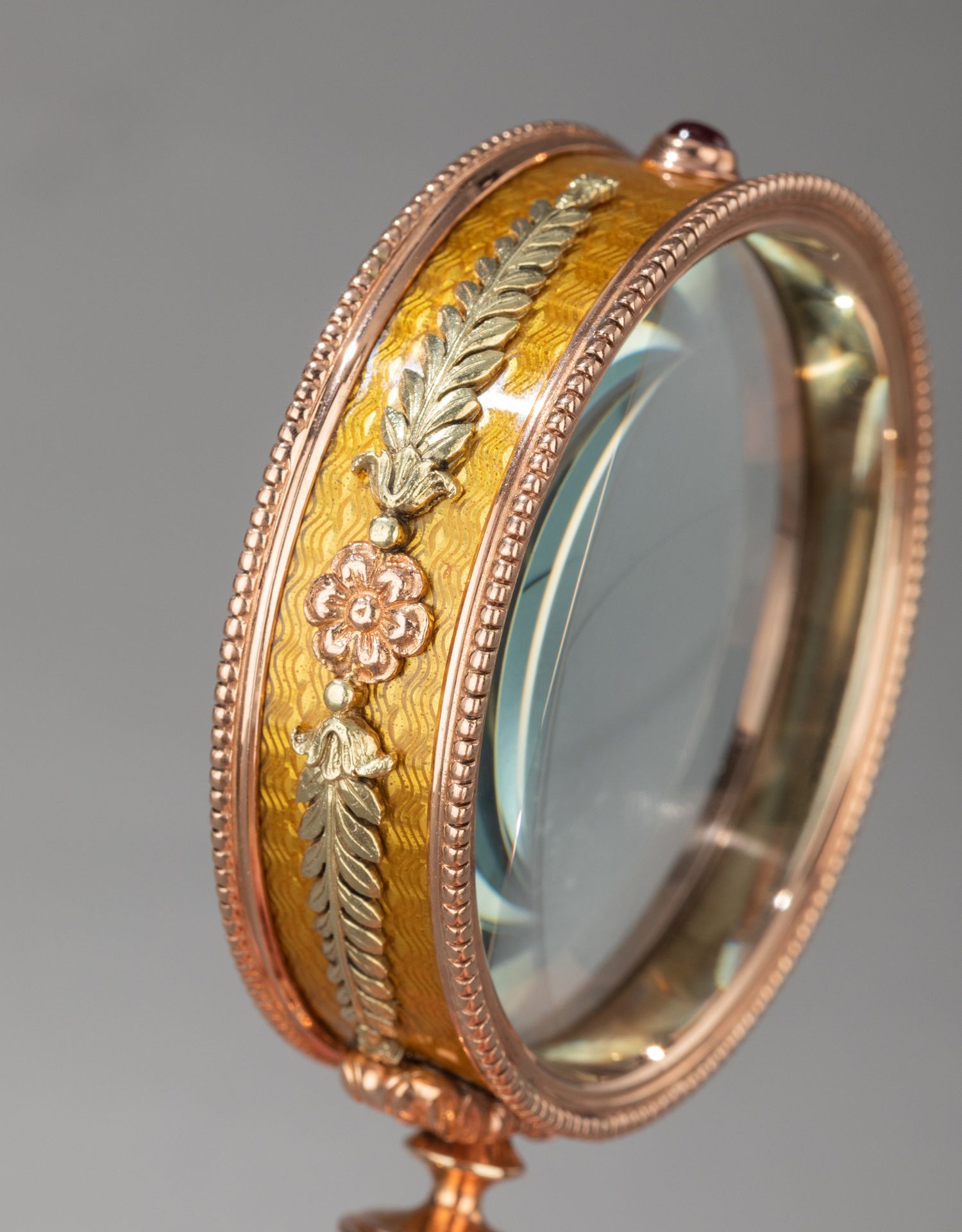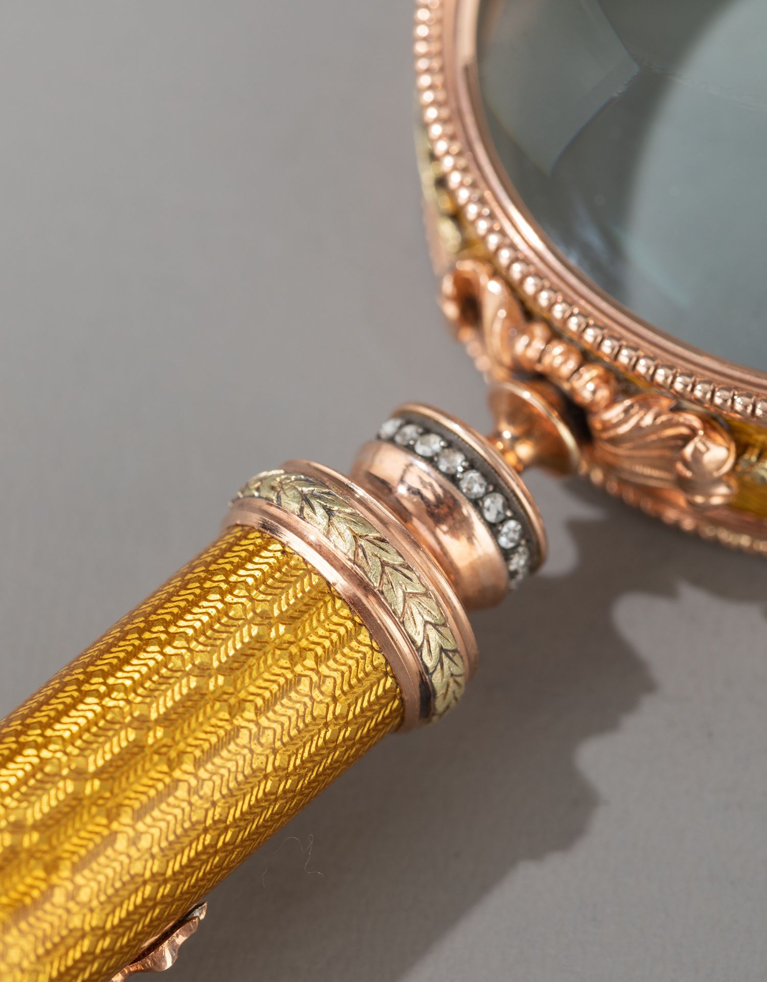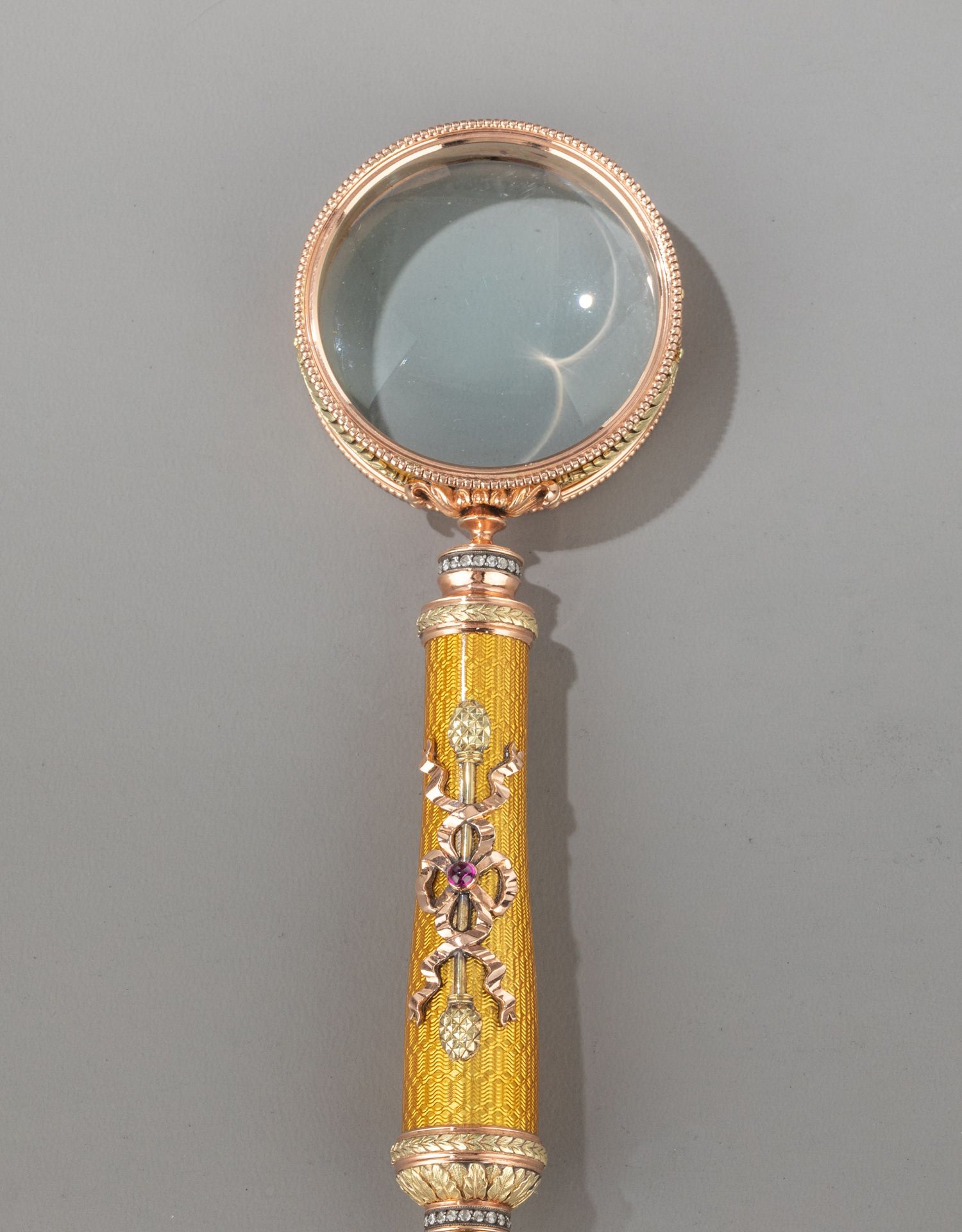 独角鹿西洋古董法贝热14K金镶红宝石玑镂珐琅水晶翻书杖放大镜