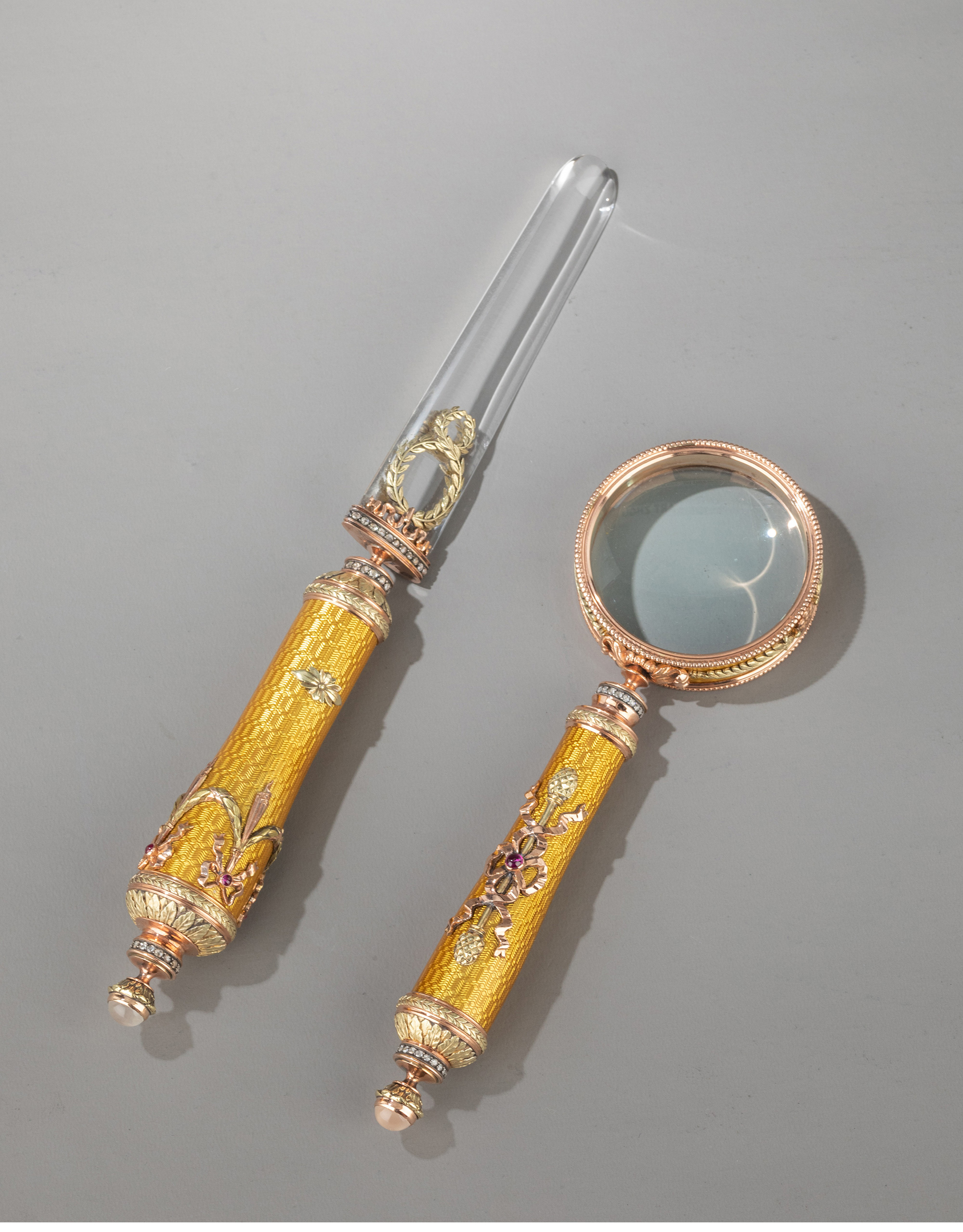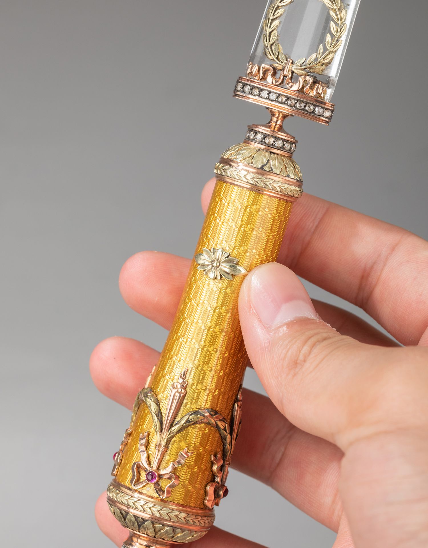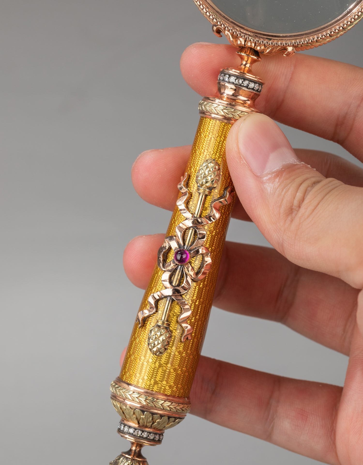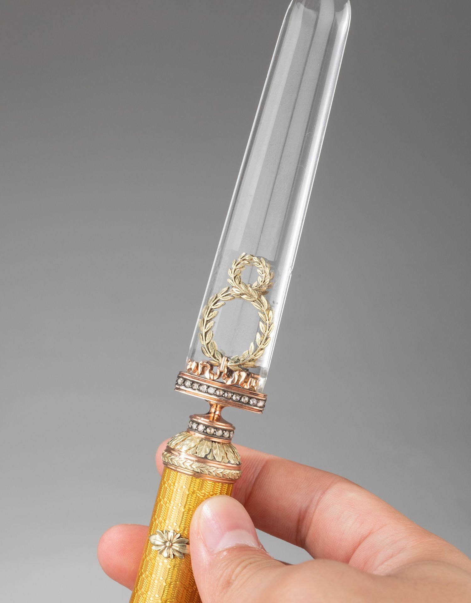 独角鹿西洋古董法贝热14K金镶红宝石玑镂珐琅水晶翻书杖放大镜