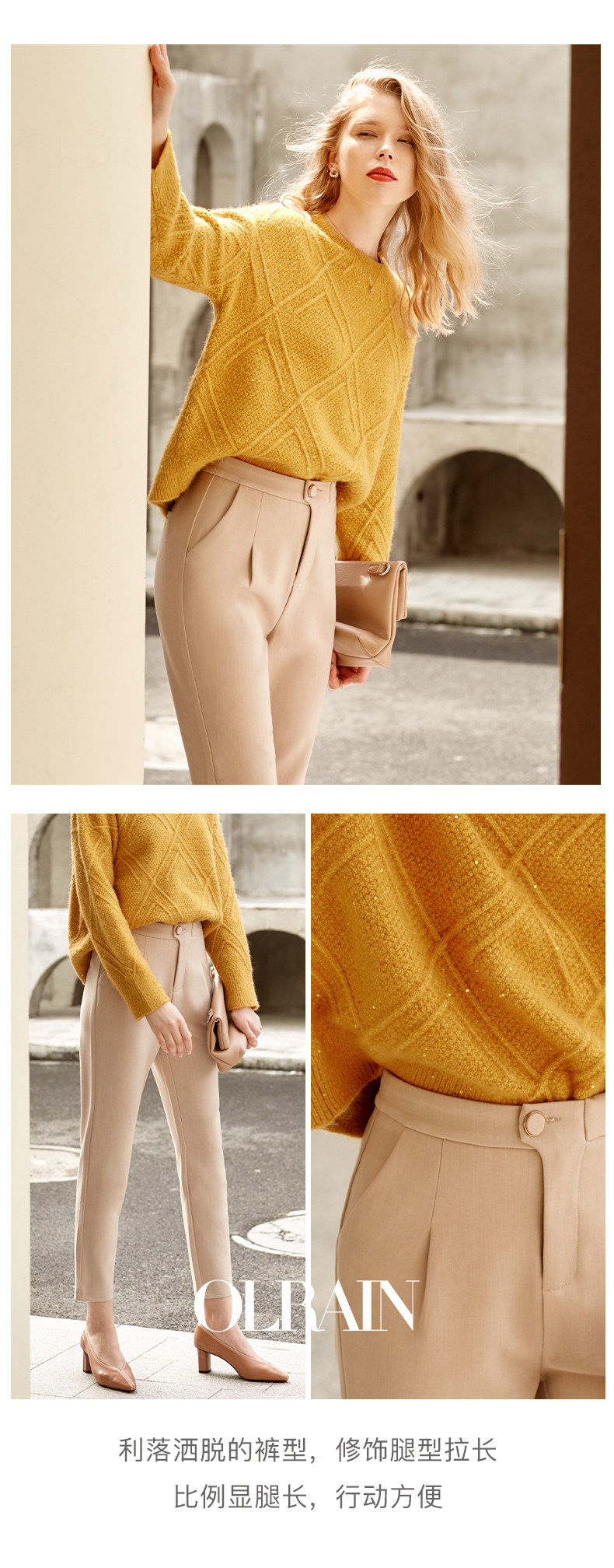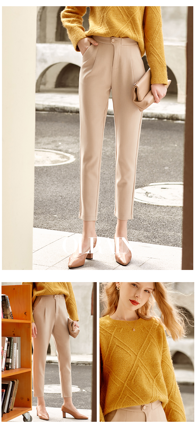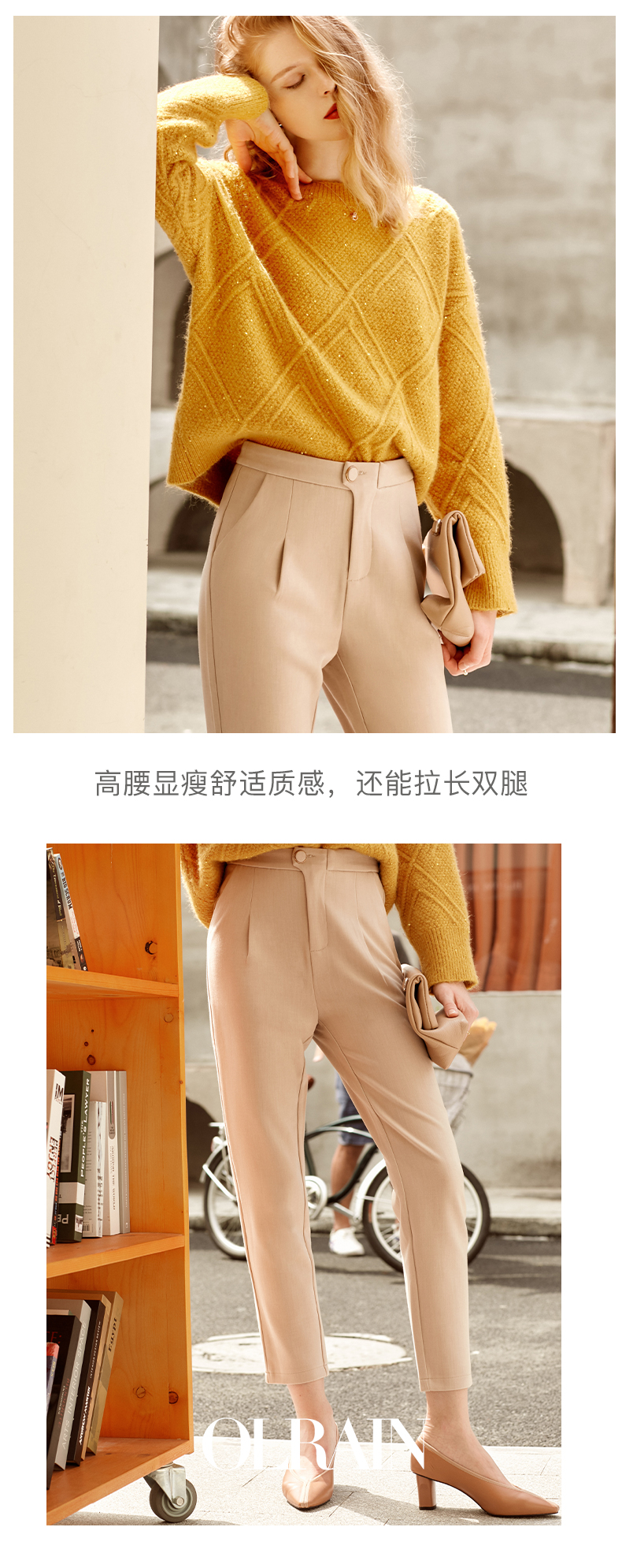 欧芮儿精致斜边纽扣高腰显瘦休闲女春季新款职业OL九分小脚裤