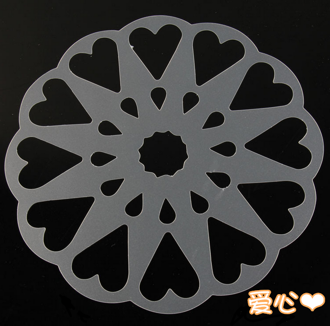 【用法】:将喷花模置于蛋糕或者欲装饰的其它点心上方,一手喷花模,一手持面粉筛,将糖粉,可可粉,抹茶粉等从上方筛下,完成后拿开喷花模,与喷花模相同的图案就形成了。