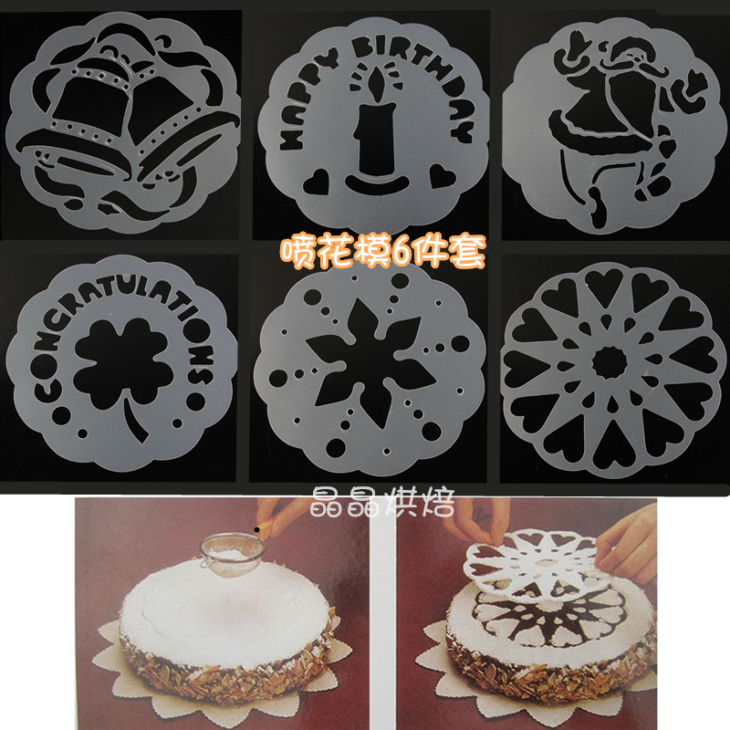 一般6寸-12寸的蛋糕都可以用它来装饰,8寸基本上满喷状态,6寸您可以选局部喷也非常漂亮。8寸以上蛋糕外圈空白处可以在边沿继续喷上装饰粉弥补空白, 一套是6片。