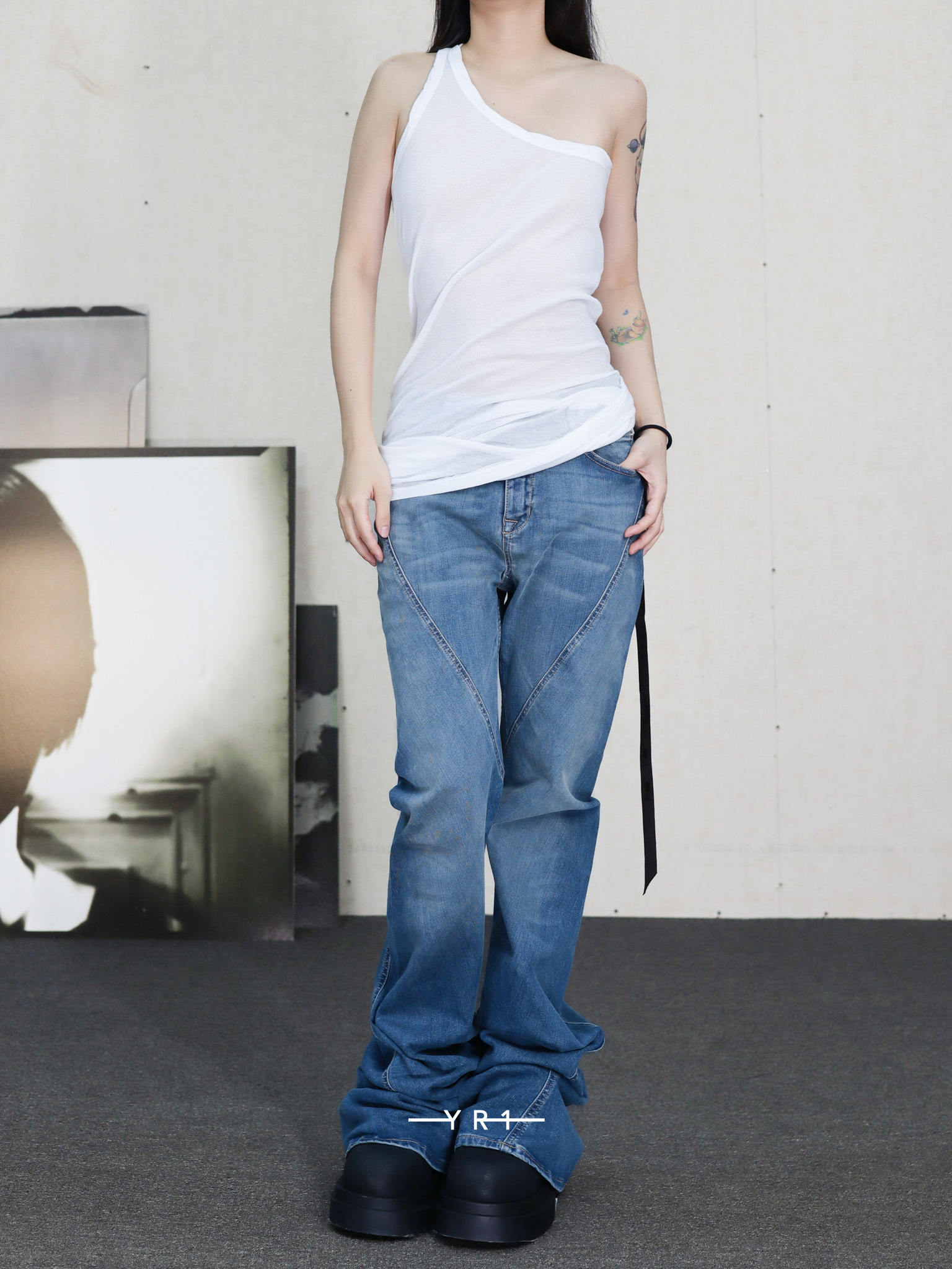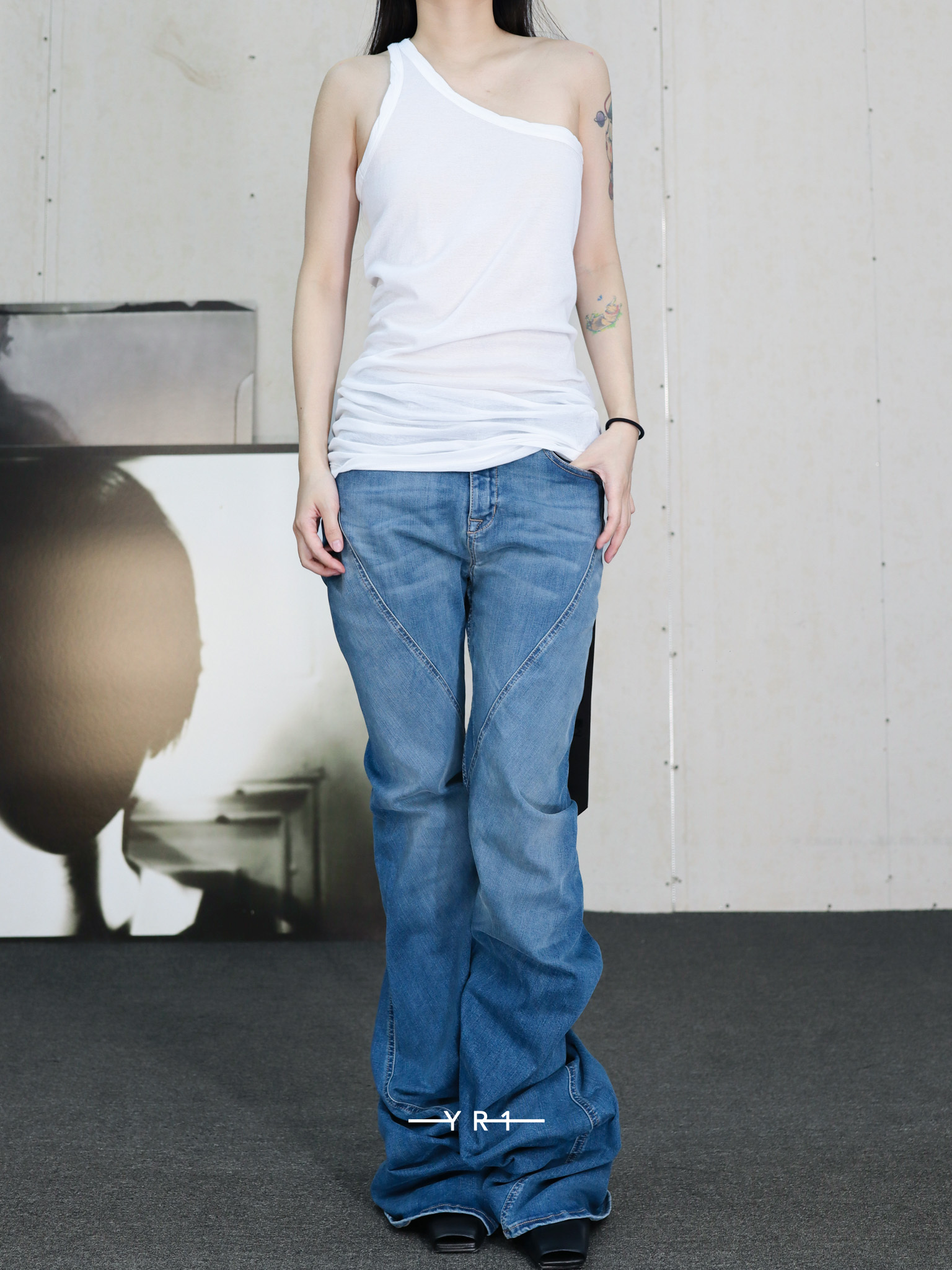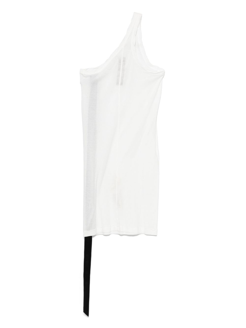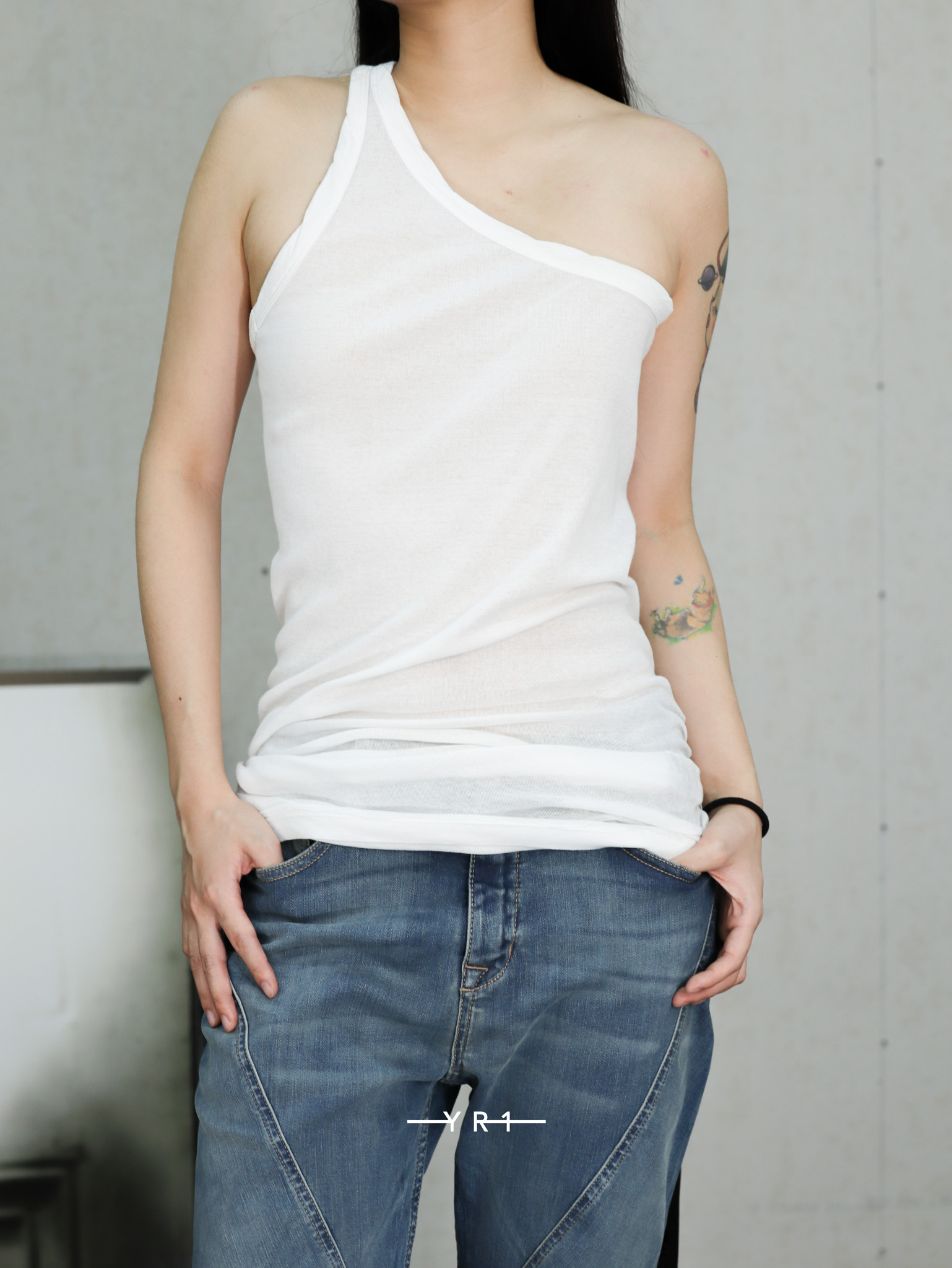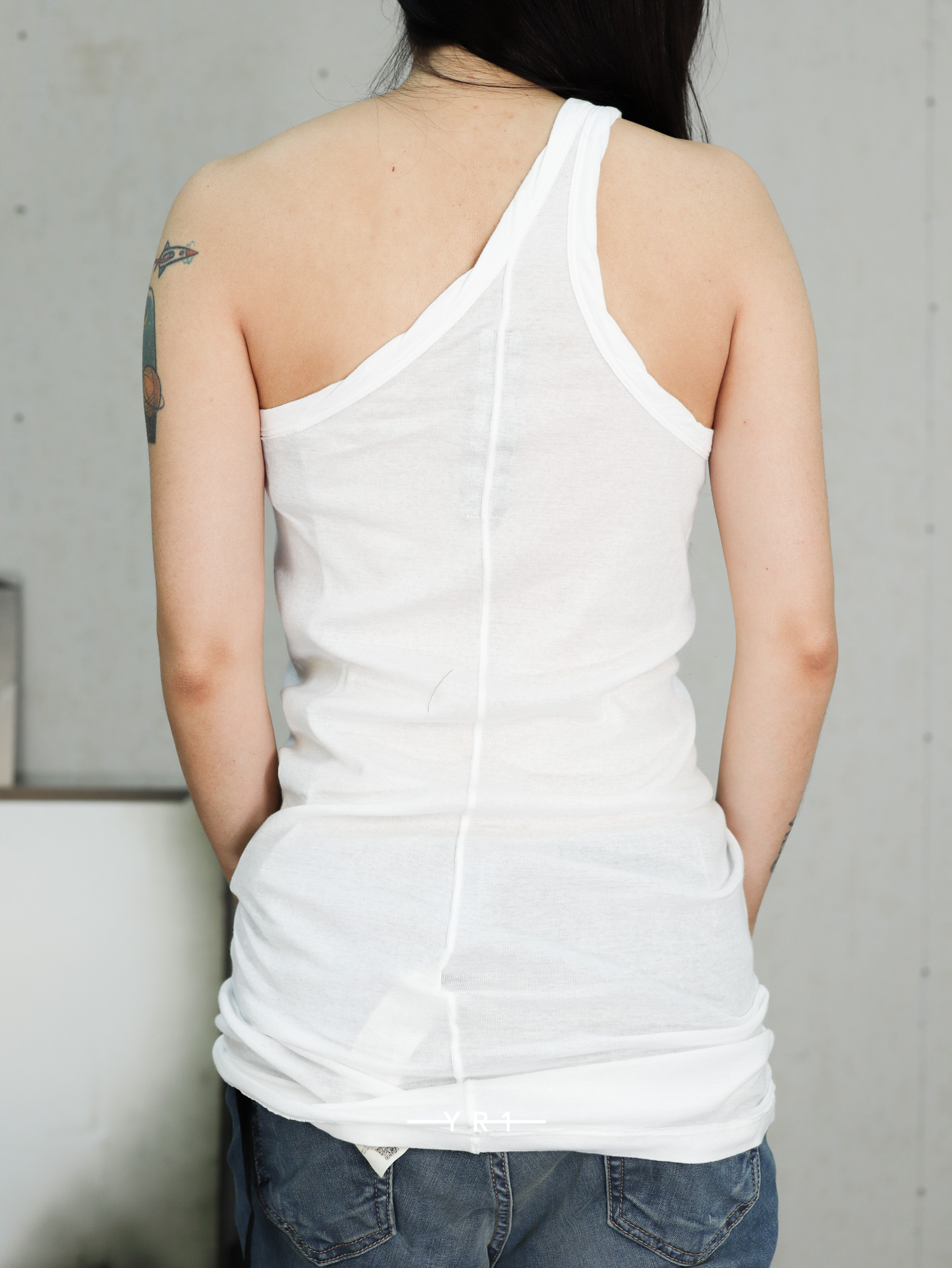 这款单肩背心长度低于臀部,带有圆边直下摆。