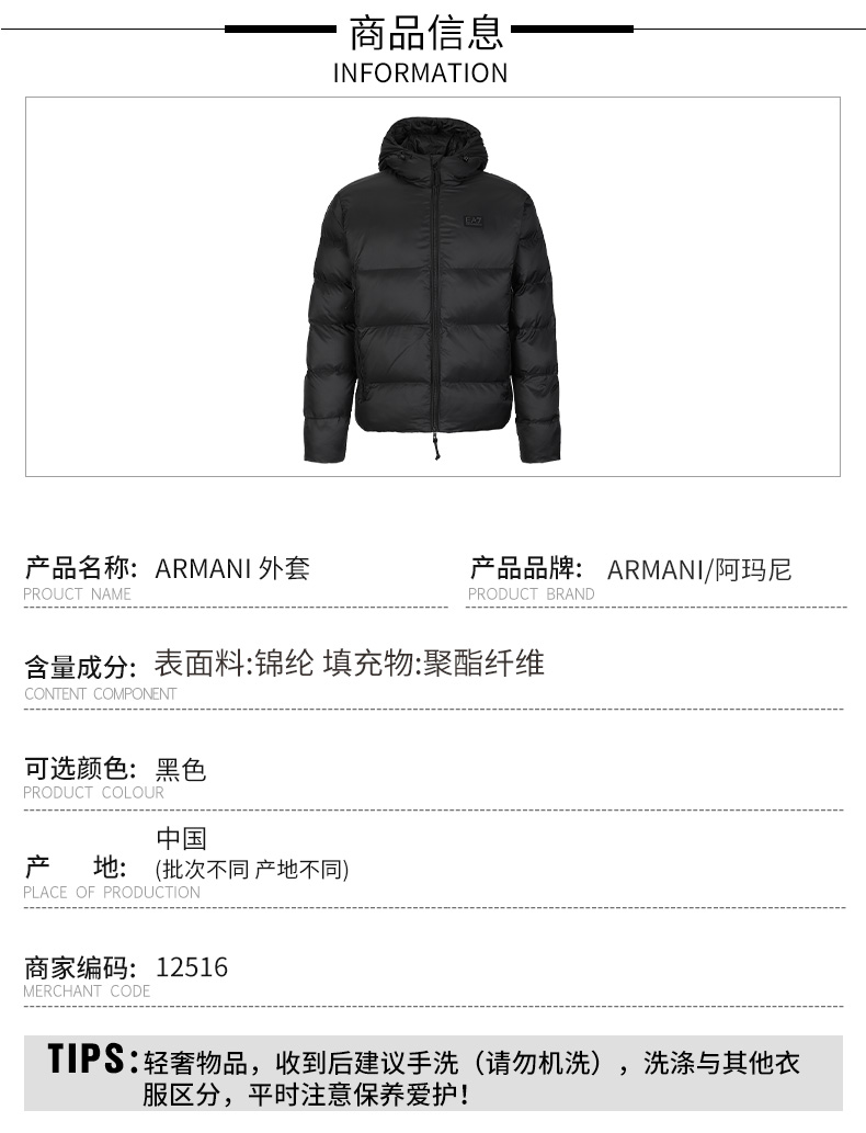 【超惠秒】Armani EA7男士运动休闲防风雪抗寒保暖外套12516