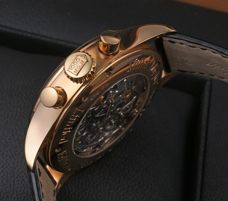 镜面材质 | 蓝宝石水晶玻璃 | 表盘 | 18K玫瑰金表壳 瓦灰色表盘 18K玫瑰金时针 分针 日期显示 双时区 计时码表 透底 |