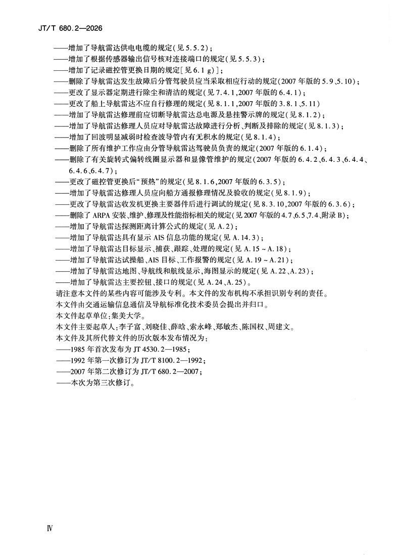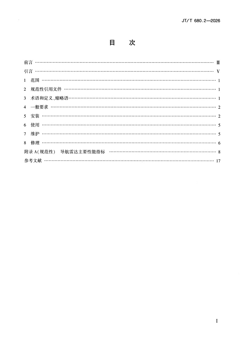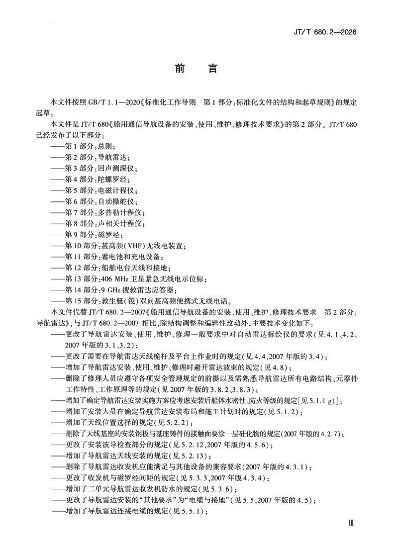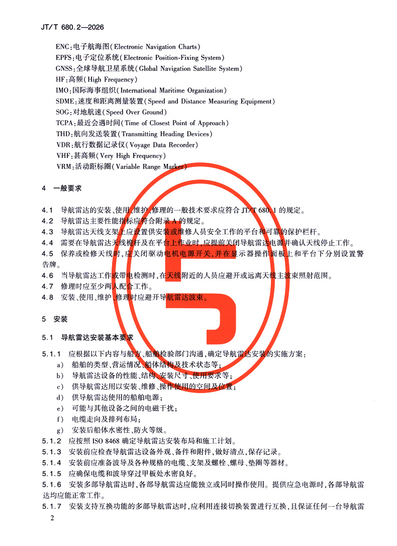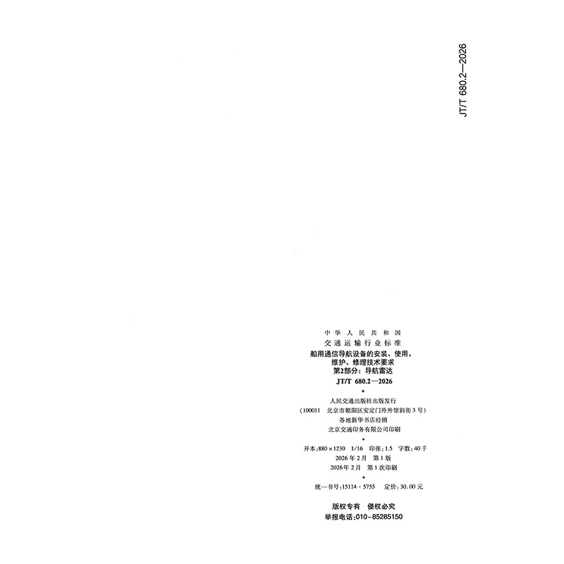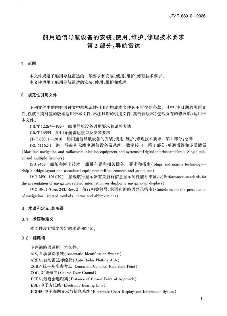 书名:船用通信导航设备的安装、使用、维护、修理技术要求 第2部分:导航雷达(JT/T 680.2—2026)