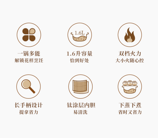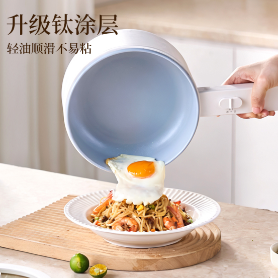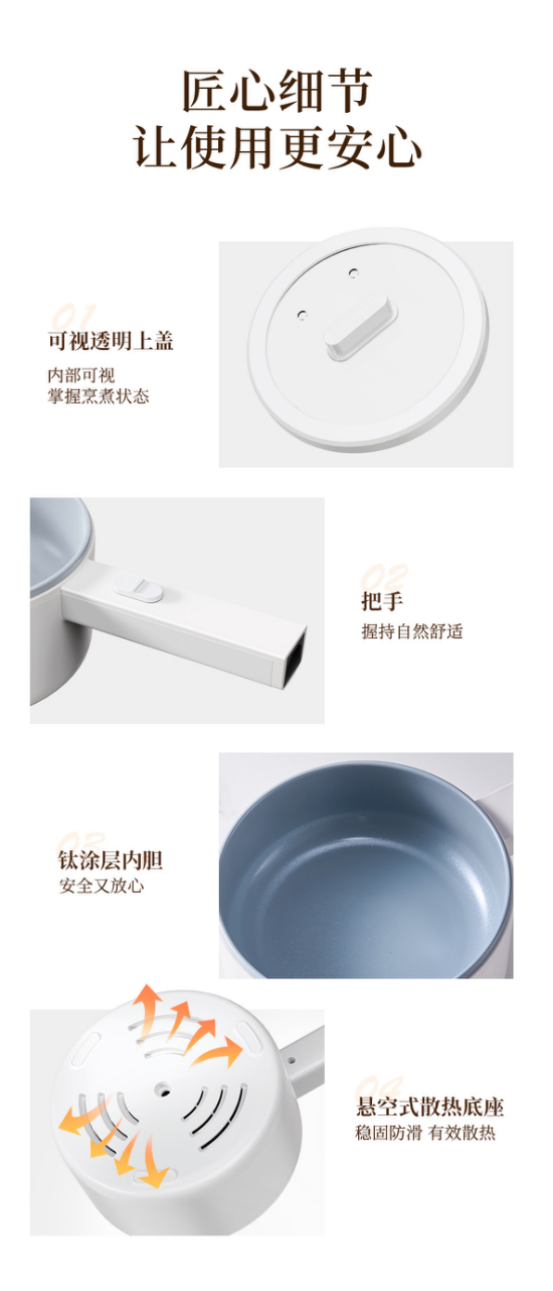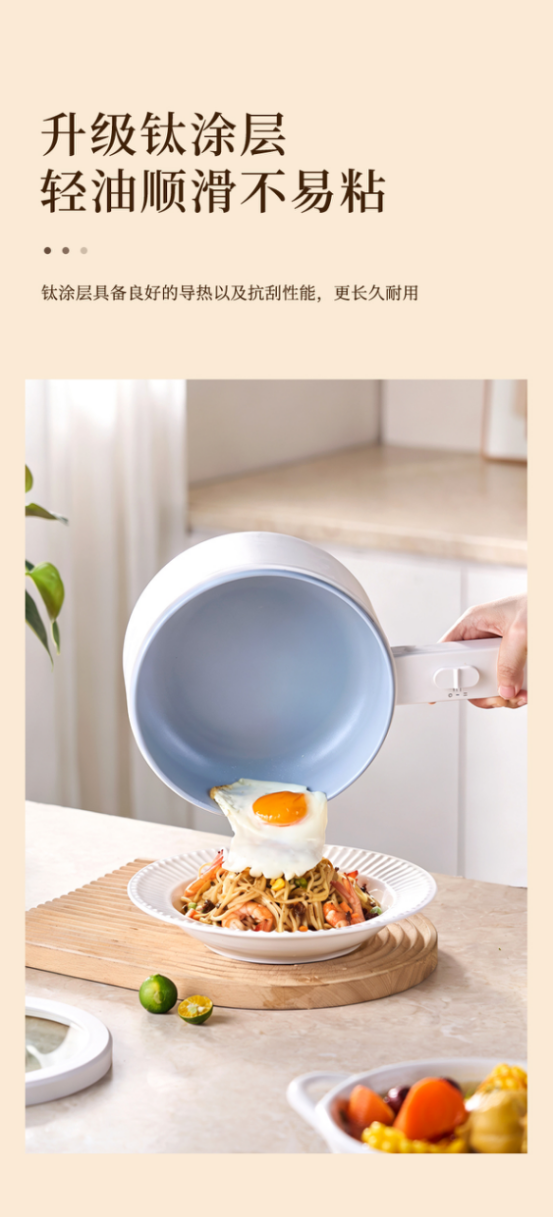 特点: ✅长手柄,绝对安全; ✅大口径,炒菜方便; ✅双档调节,随意切换; ✅钛涂层内胆,清洗方便; ✅上蒸下煮,一次性享受两种美食; ✅煮、蒸、煎、炒、炸 无敌全能 ✅1.6L精致容量,一个人也要好好吃饭哦。
