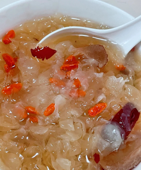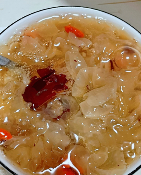 煮的银耳枸杞羹软糯入味,每一口都是细腻的口感~ 💥银耳泡发半小时或者1小时都可以,清洗干净,然后撕成小朵 💥冷水下锅,水没过银耳即可,大火煮十分钟,快速搅拌30秒(出胶的关键) 💥加入红枣冰糖,继续小火煮30分钟 💥关火前加入枸杞煮一两分钟后关火
