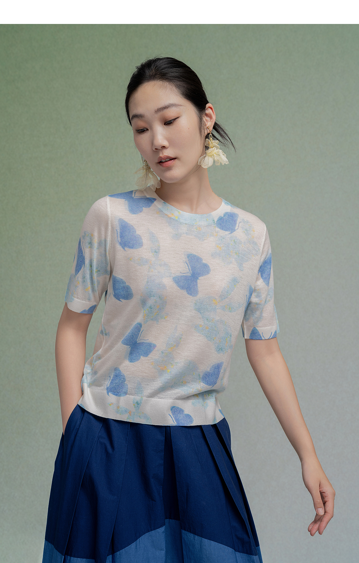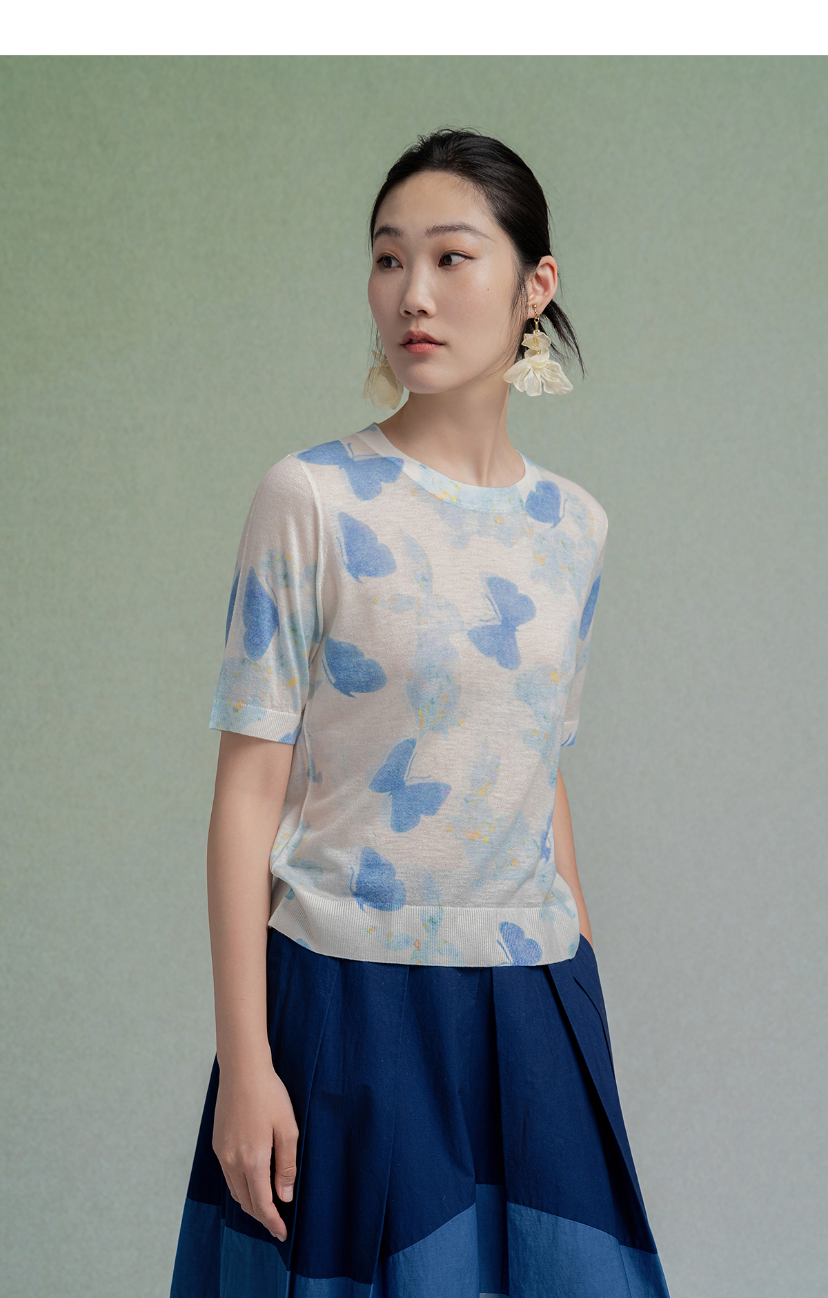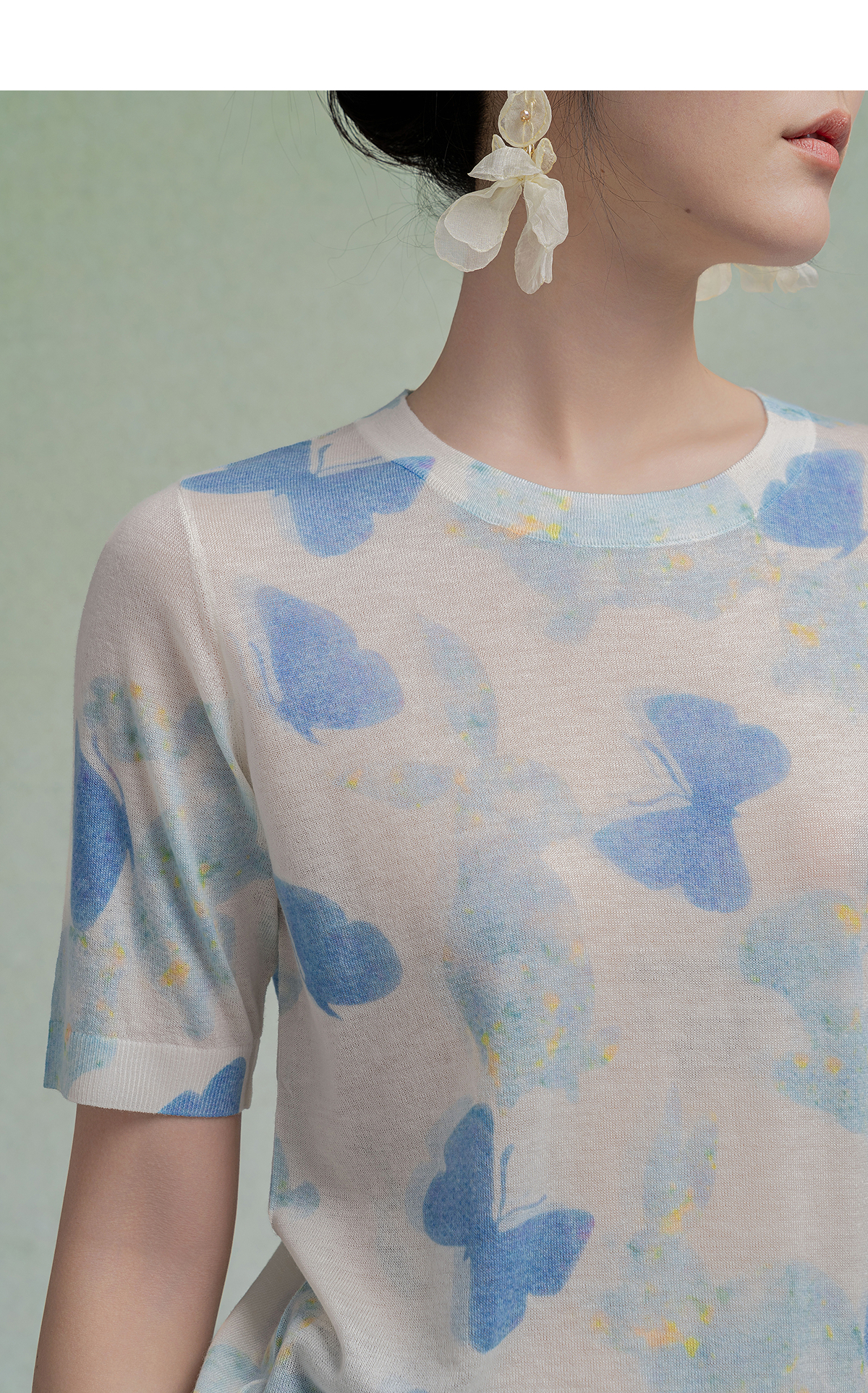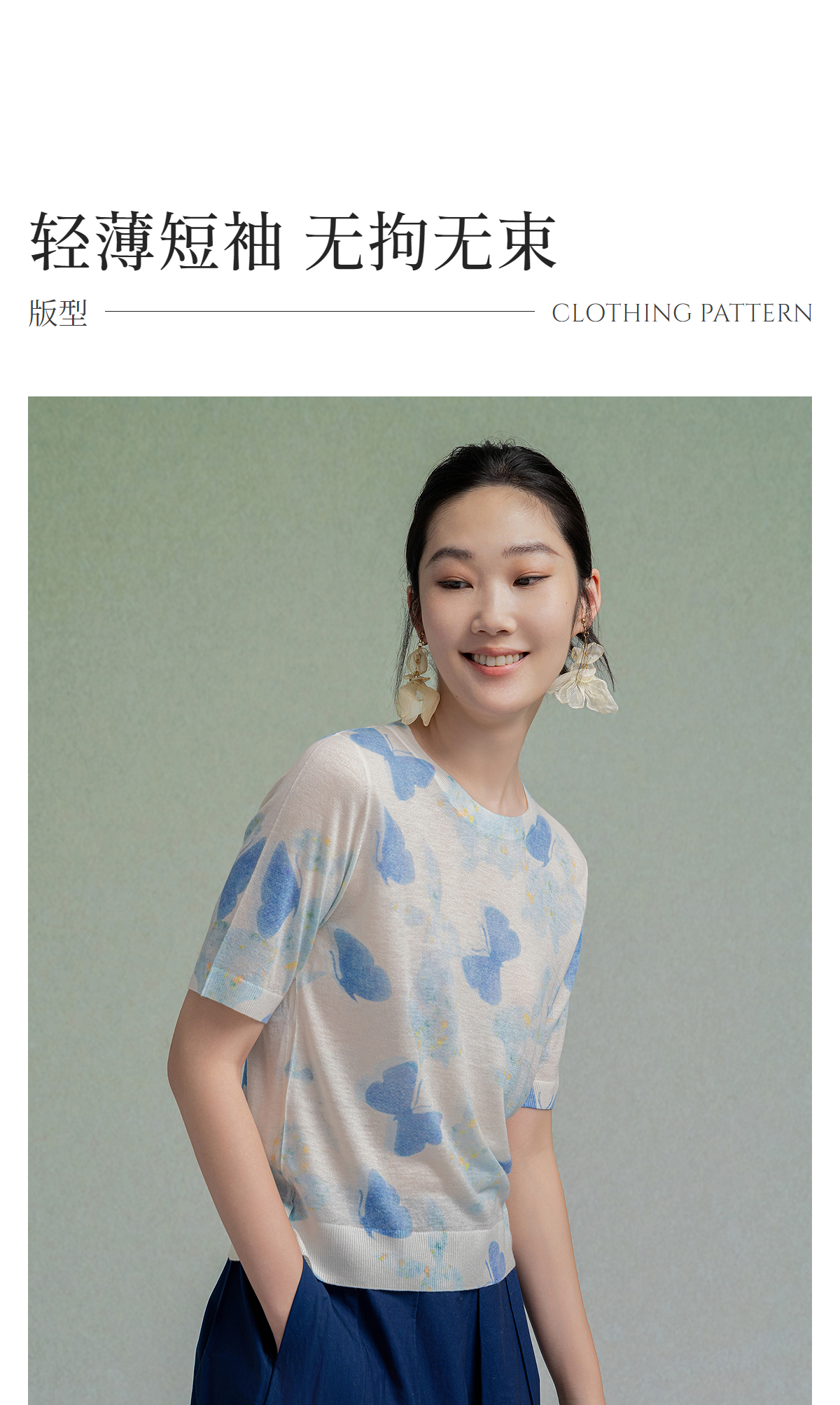 【林栖设计小店】蝴蝶衫轻氧薄绵羊毛衣印花油画衫套头透气早秋新款T恤短袖女G1953324