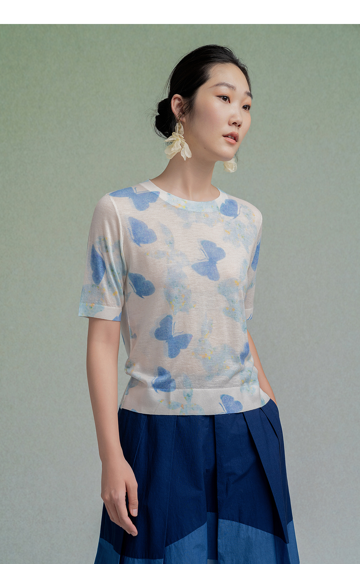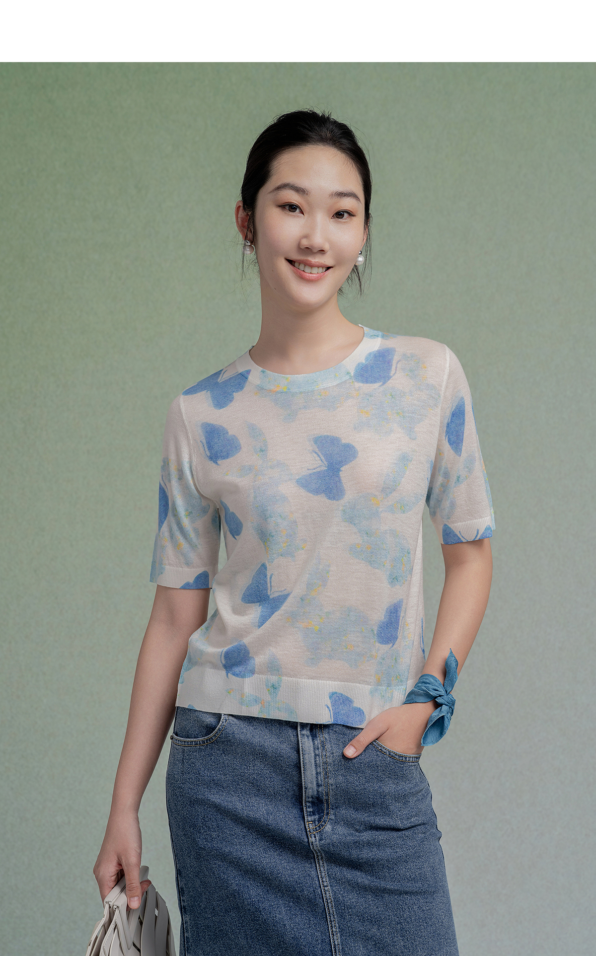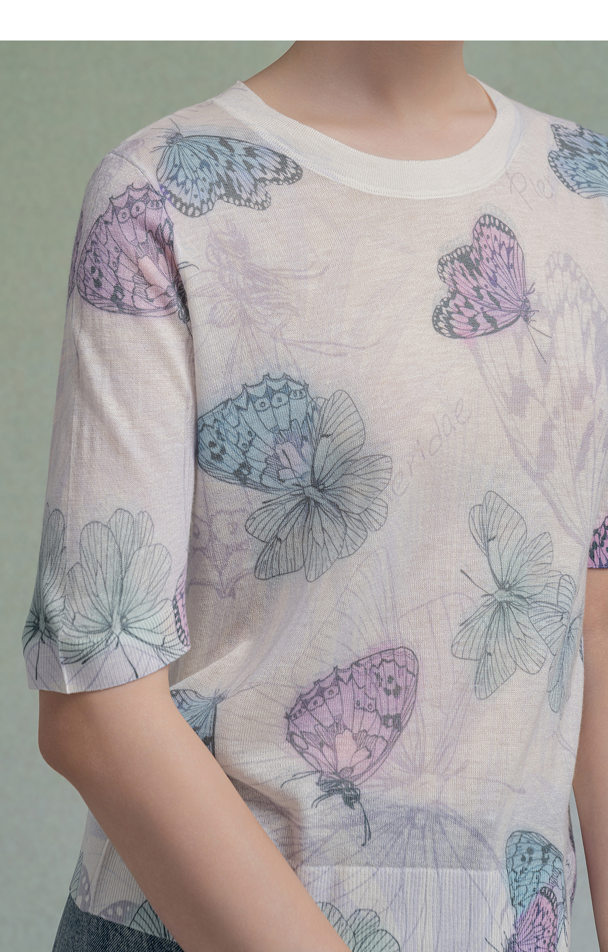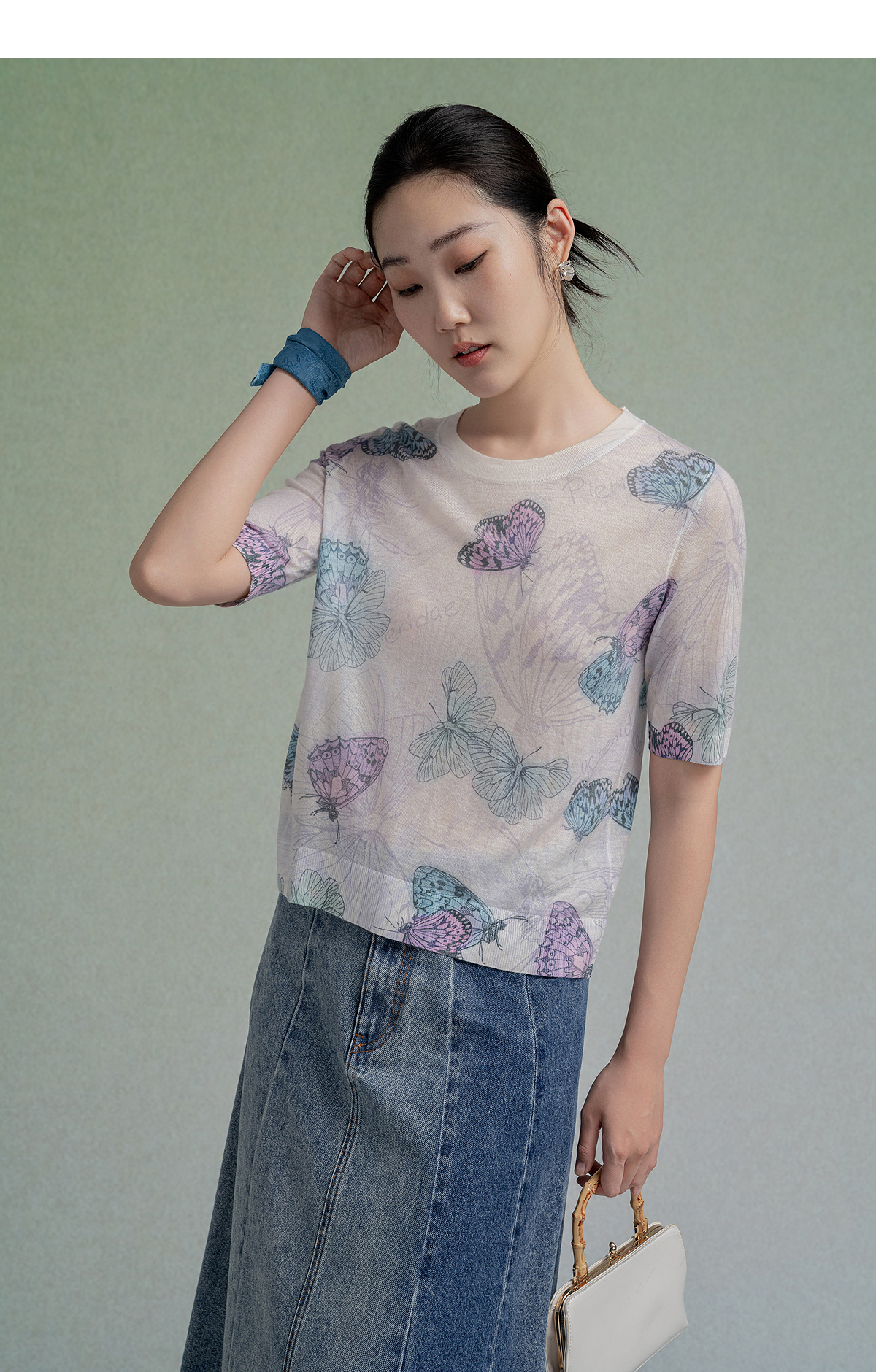 【林栖设计小店】蝴蝶衫轻氧薄绵羊毛衣印花油画衫套头透气早秋新款T恤短袖女G1953324