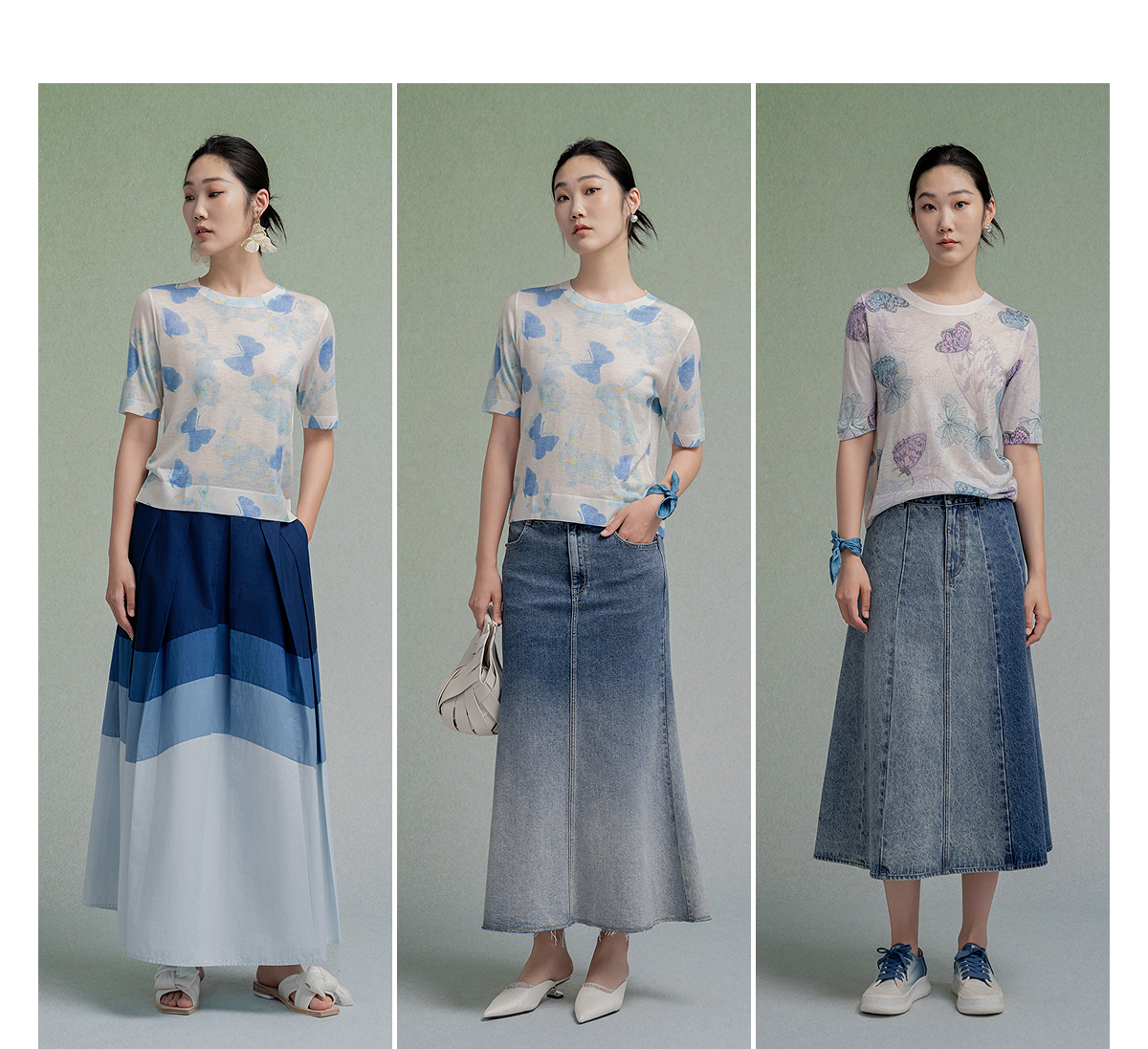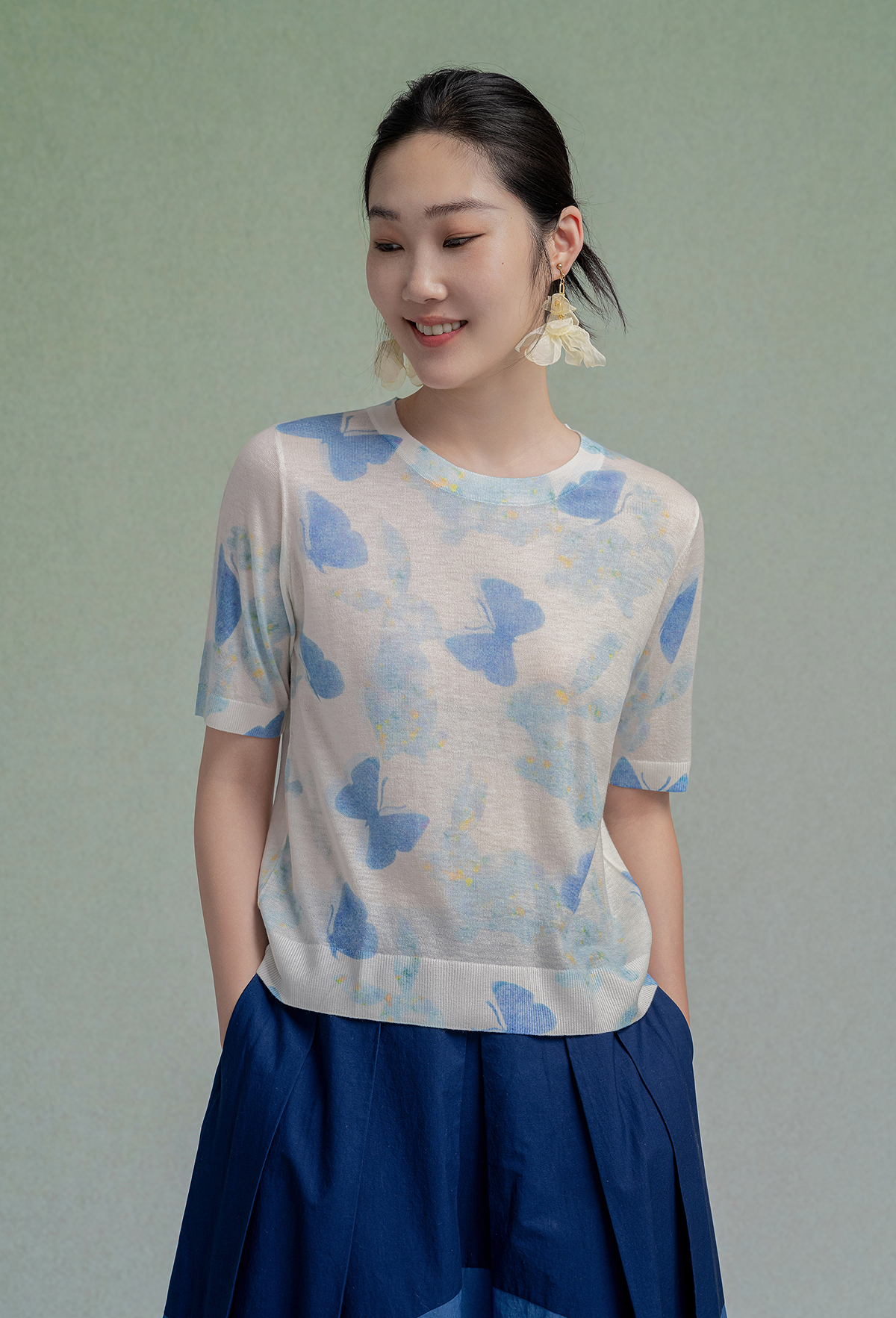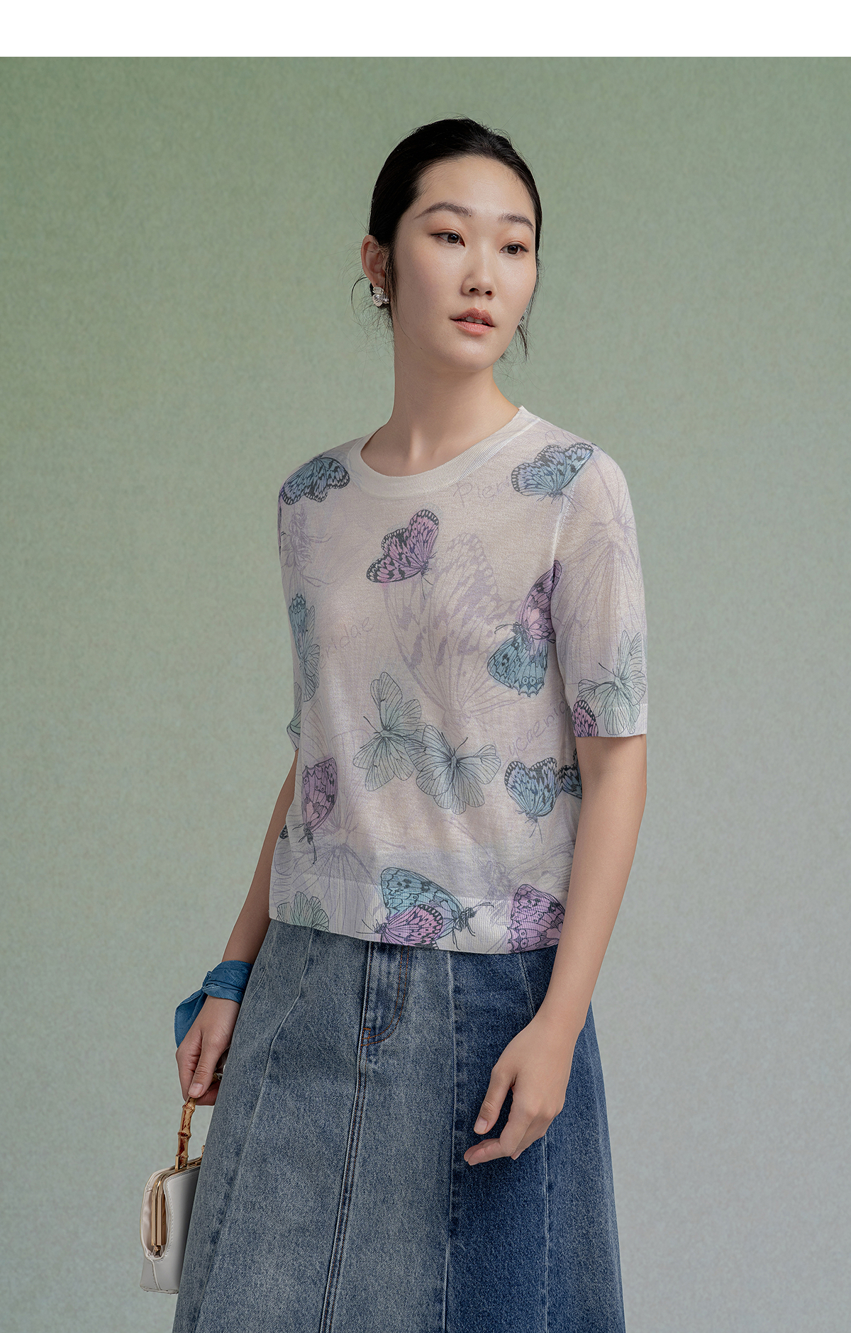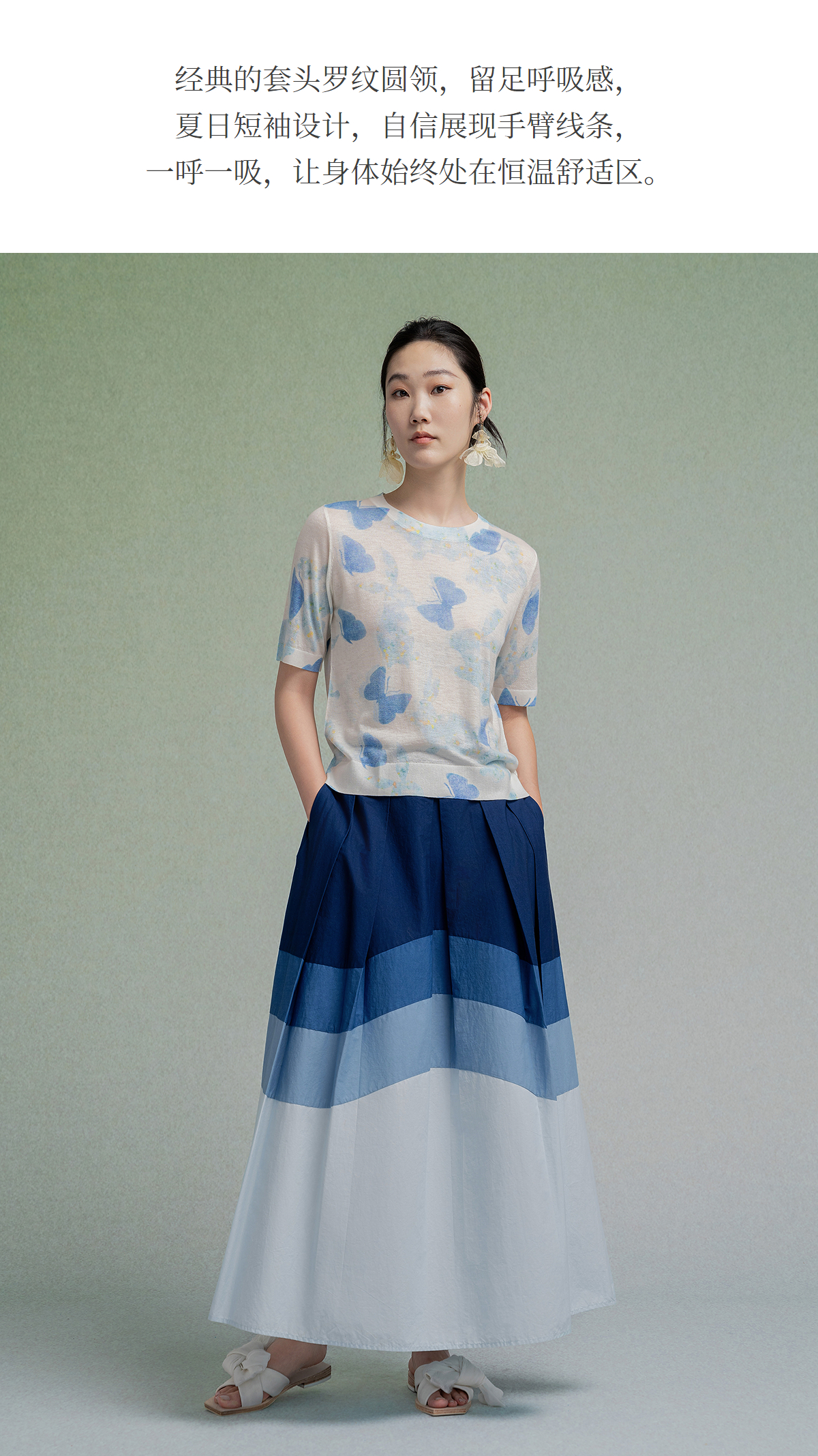 【林栖设计小店】蝴蝶衫轻氧薄绵羊毛衣印花油画衫套头透气早秋新款T恤短袖女G1953324