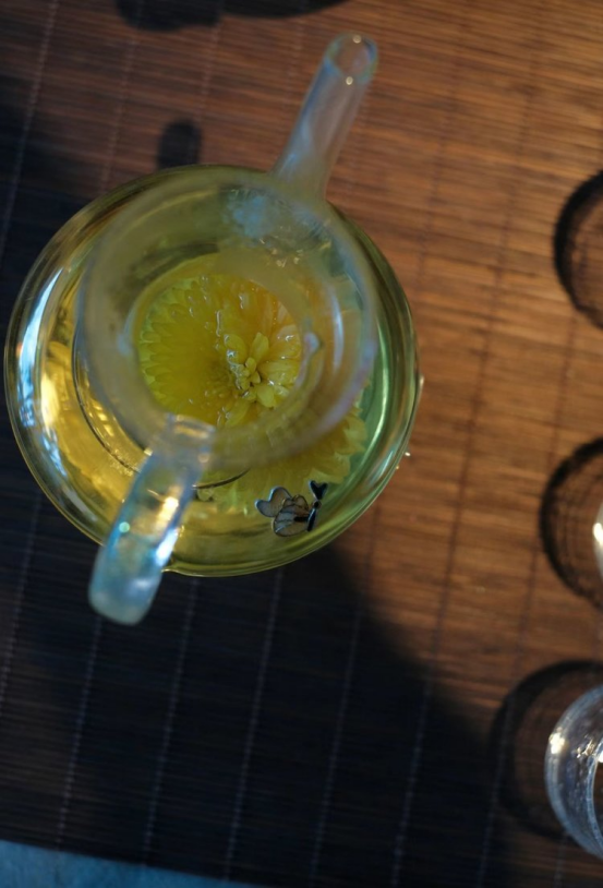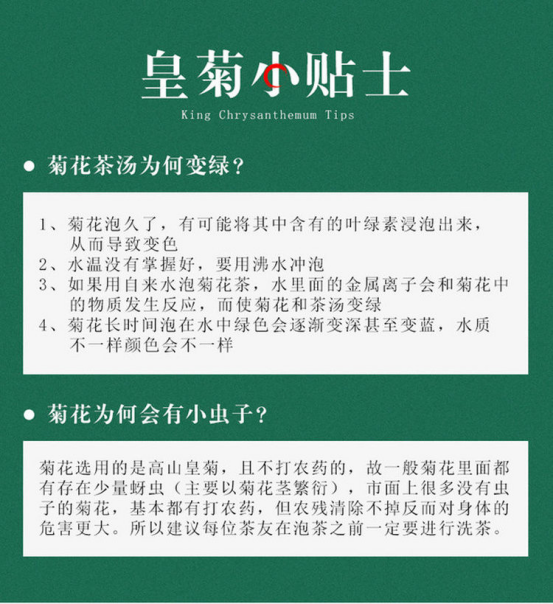 【皇菊小贴士】 菊花长时间泡在水中绿色 会逐渐变深甚至变蓝,水质不一样颜色会不一样 菊花为何会有小虫子?? 菊花选用的是高山皇菊,且不打农药 故一般菊花里面都有存在 少量蚜虫(主要以菊花茎繁衍) 市面上很多没有虫子的菊花,基本都有打农药 但农残清除不掉反而对身体的危害更大 所以建议每位茶友在泡茶之前一定要进行洗茶