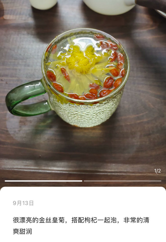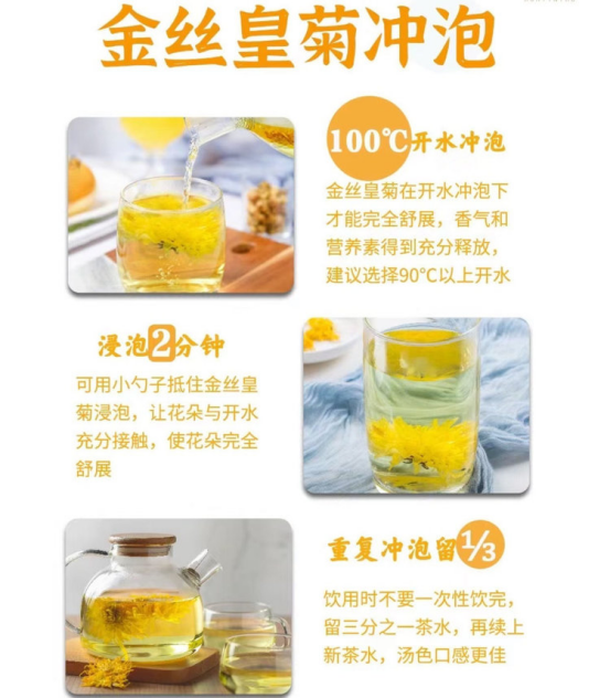 【金丝皇菊怎么泡更好喝?】 👉100℃开水冲泡 金丝皇菊在开水冲泡下才能完全舒展 香气和营养素得到充分释放 建议选择90℃以上 开水👉浸泡2分钟(浸泡划重点) 可用小勺子抵住金丝皇菊浸泡 让花朵与开水充分接触 使花朵完全舒展👉重复冲泡留⅓ 饮用时不要一次性饮完 留三分之一茶水,再续上新茶水 汤色口感更佳 大家日常可以喝起来,让自己补充水分保持好气色🌹~
