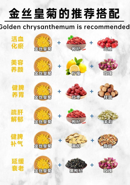 去火离不了它❗金丝皇菊推荐去火搭配 🌈金丝皇菊的推荐搭配 👉金丝皇菊+枸杞+山楂 活血化瘀 👉金丝皇菊+柠檬+玫瑰 美容养颜 👉金丝皇菊+红枣+桂圆 健脾养胃 👉金丝皇菊+枸杞+茉莉 疏肝解郁 👉金丝皇菊+黄芪+陈皮 健脾补气 👉金丝皇菊+黑枸杞+玫瑰 延缓衰老