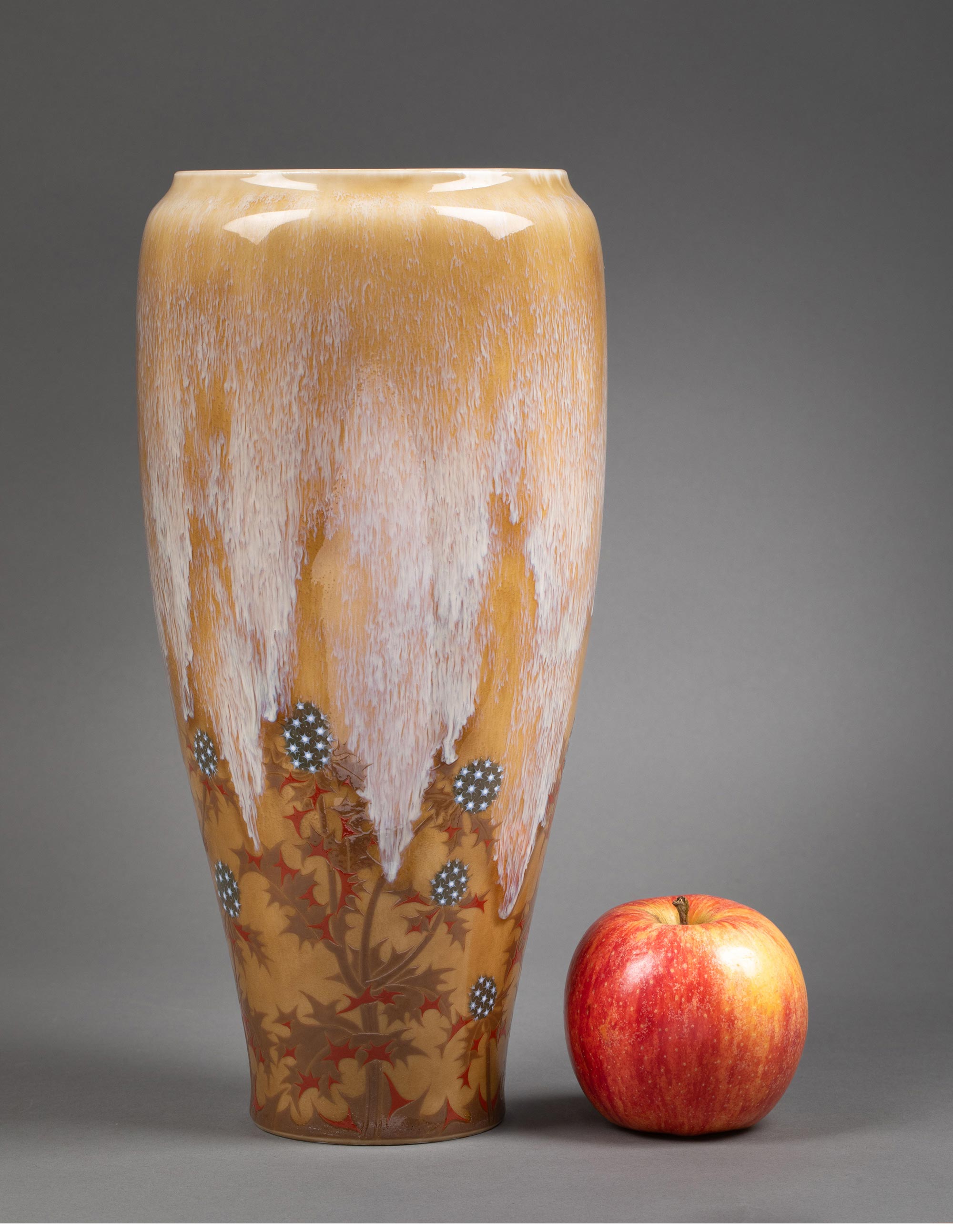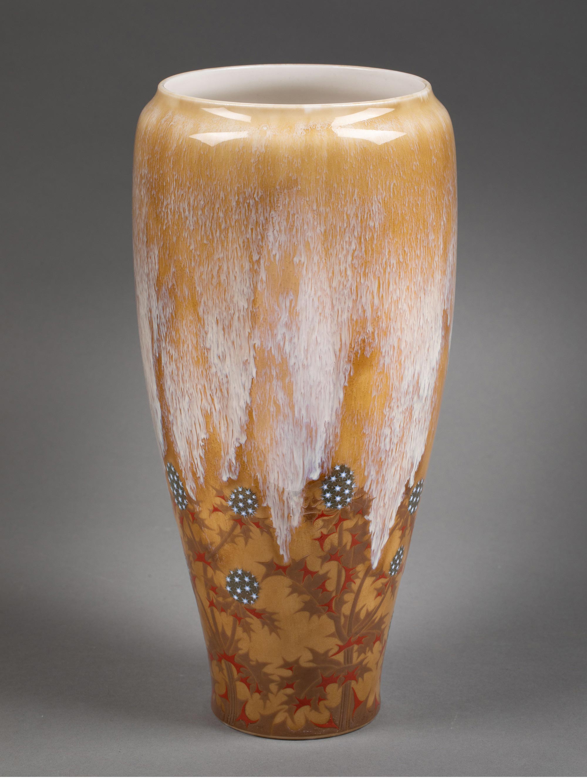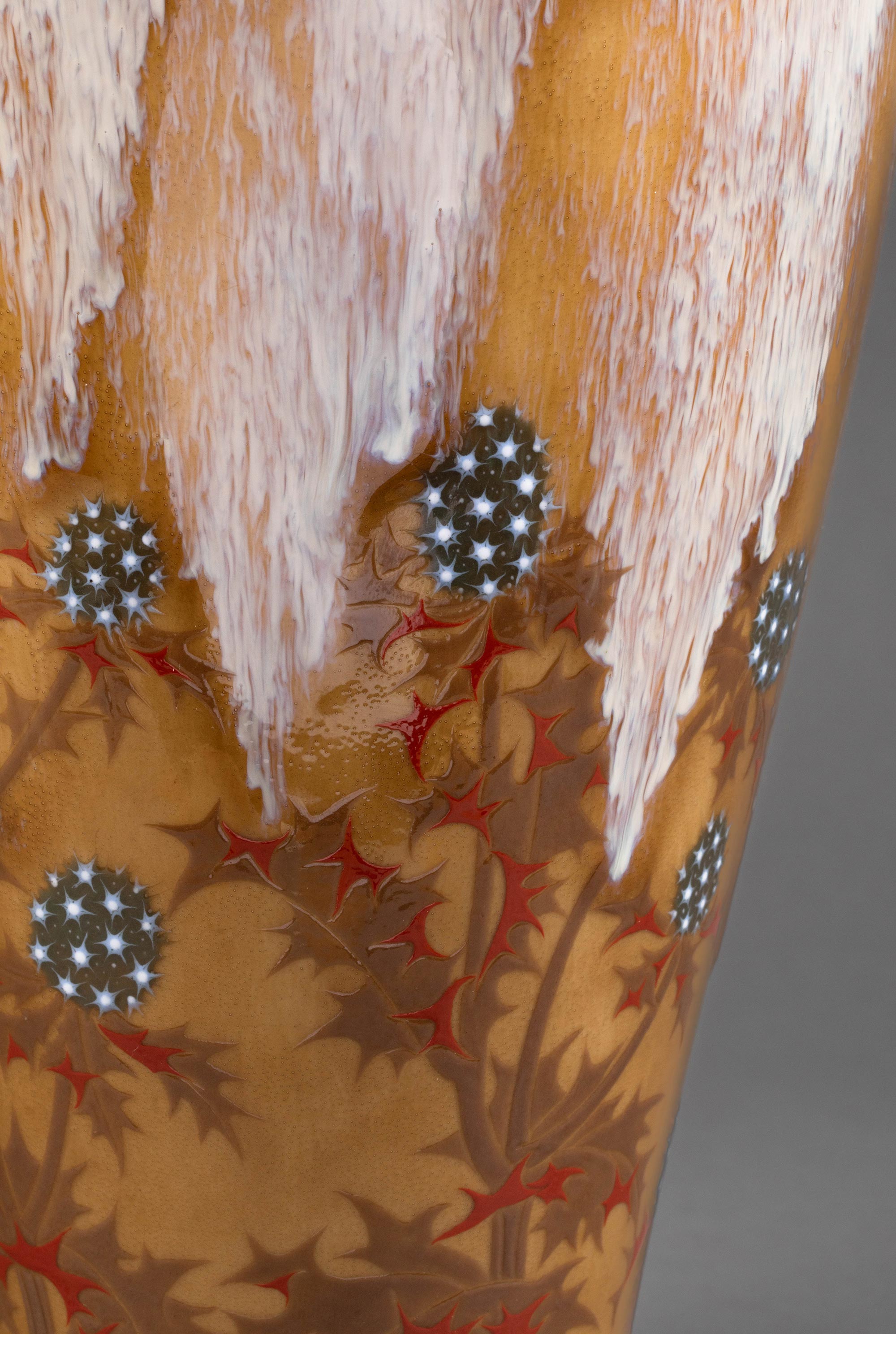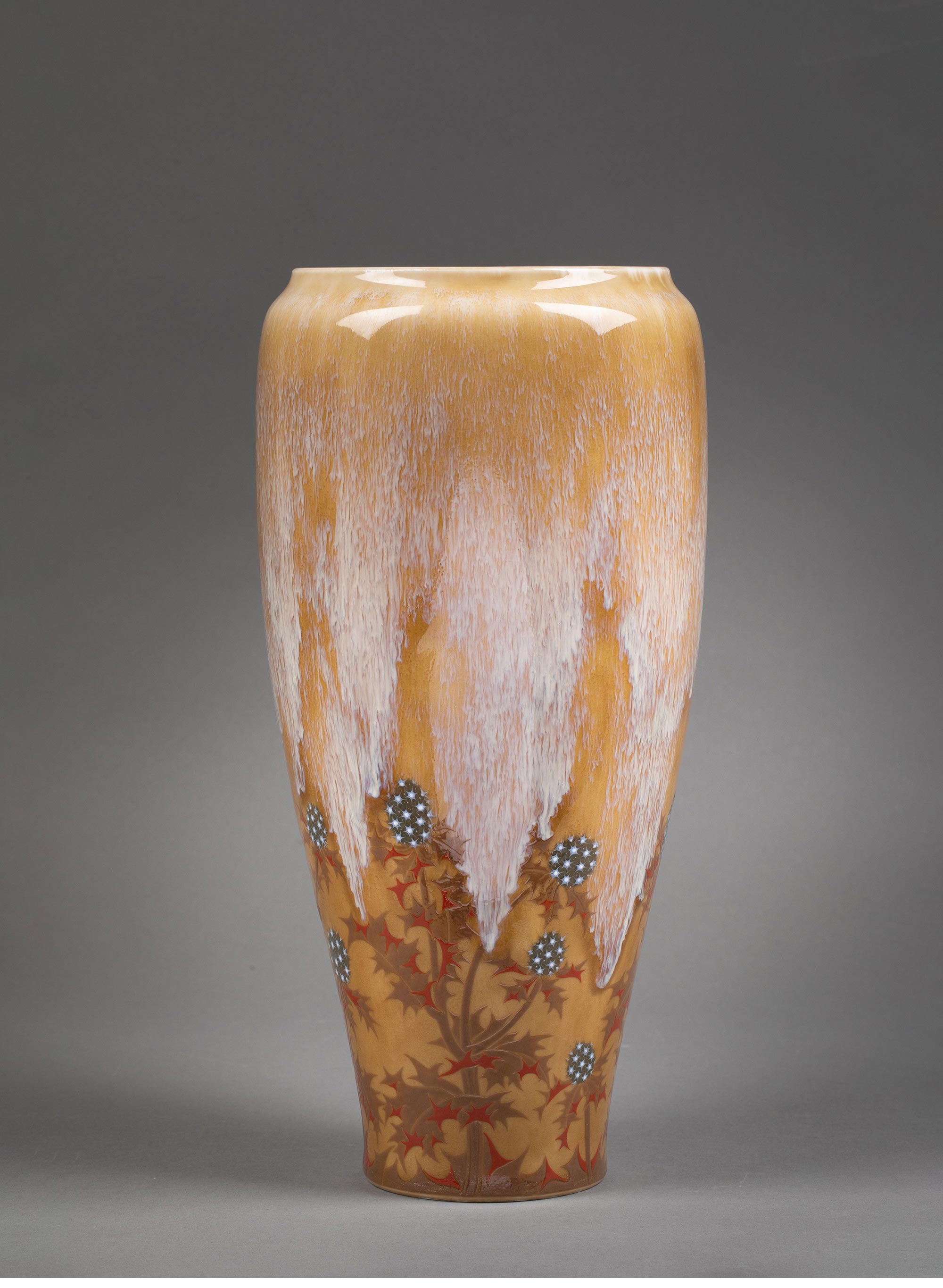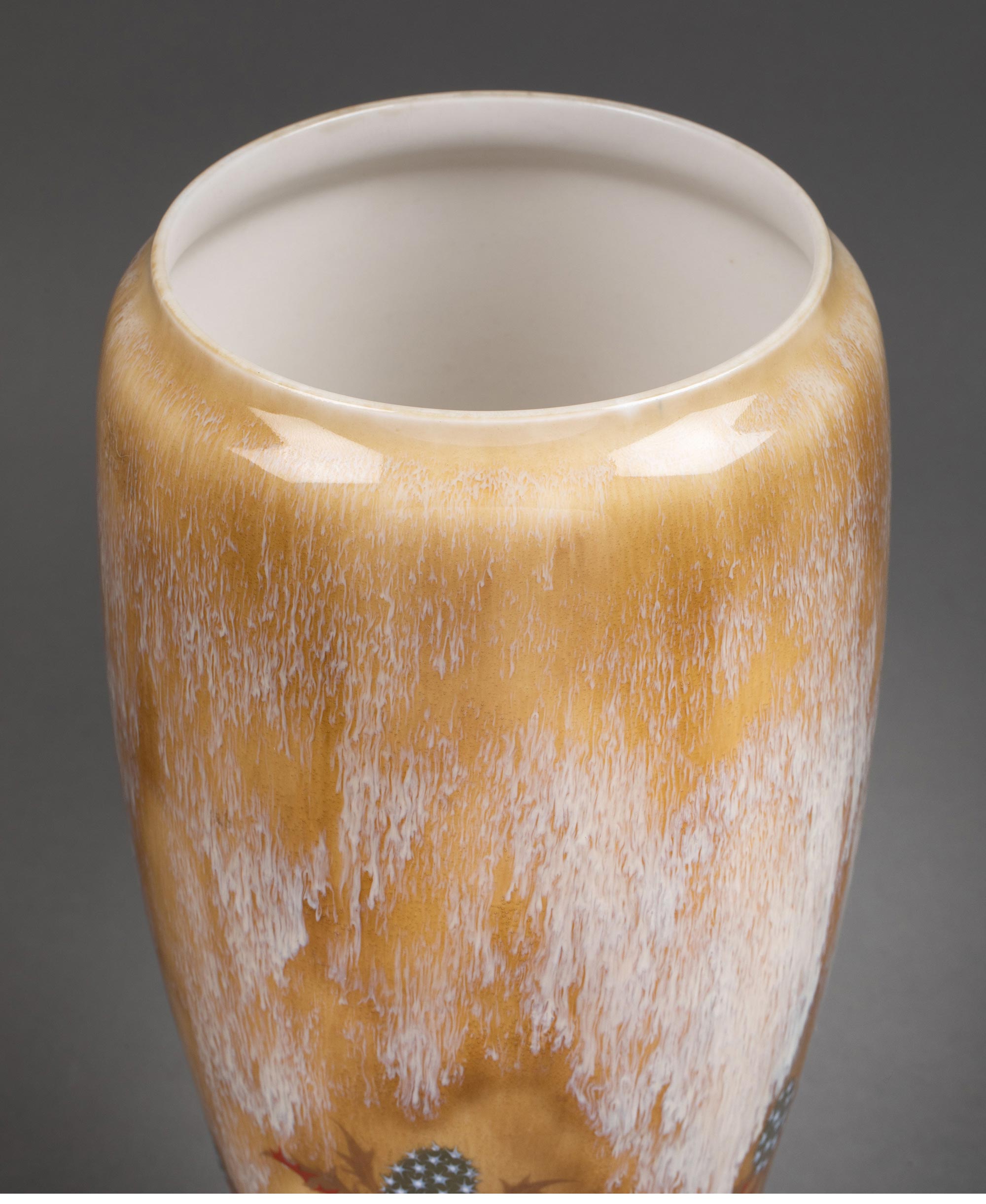 1900-1901年代新艺术时期法国御窑出品Alexandre SANDIER设计手绘蓟花主题du Creusot器形黄釉堆白瓷瓶