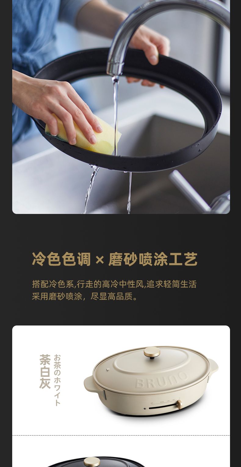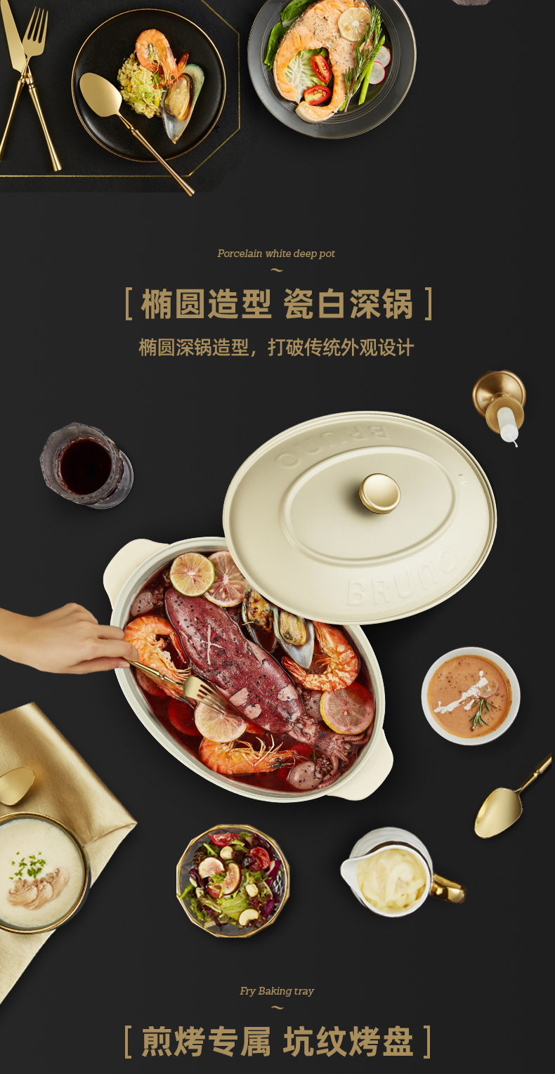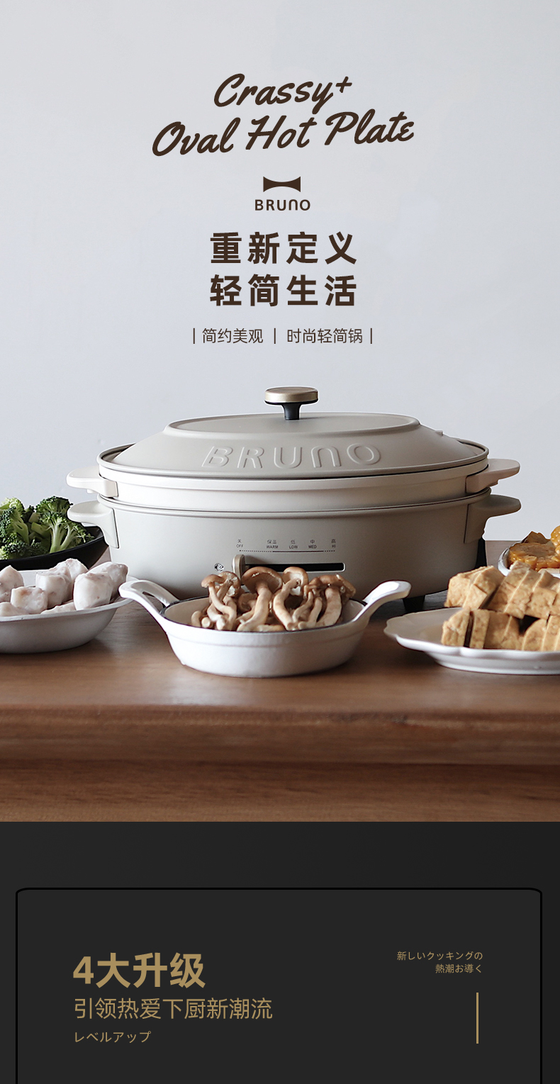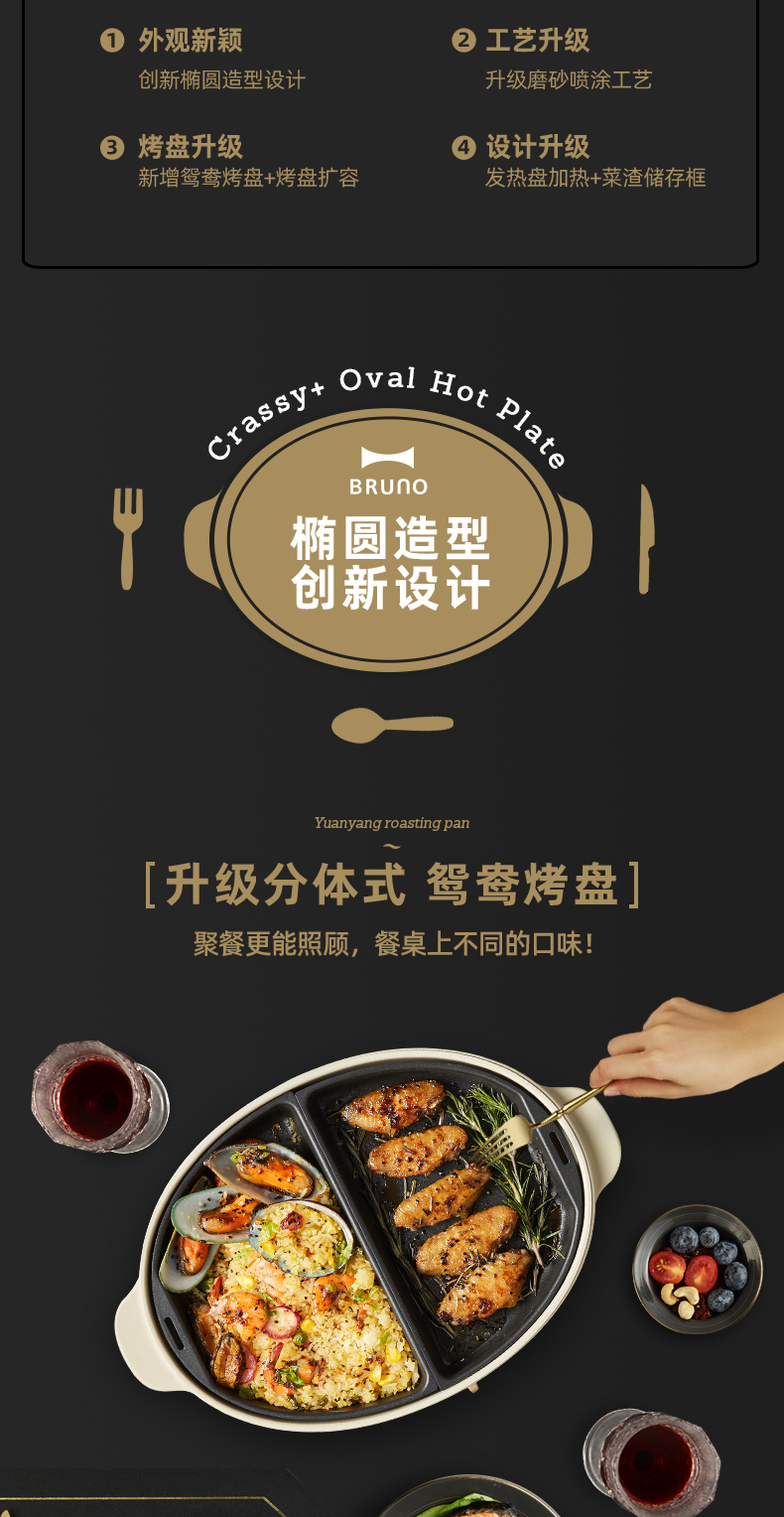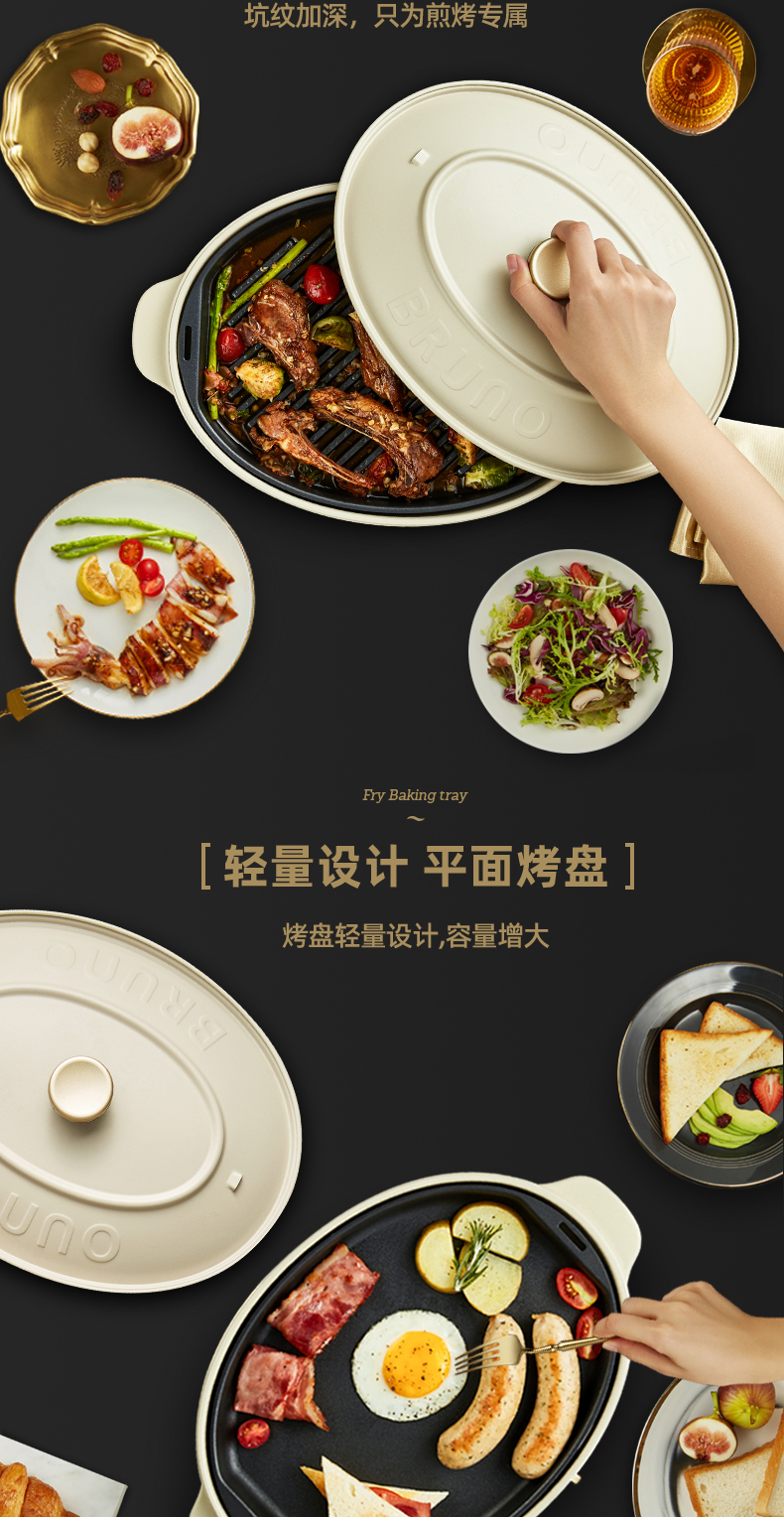 日本Bruno轻简锅电烤炉椭圆锅家用烧烤炉多功能料理锅蒸煮一体锅BOE053