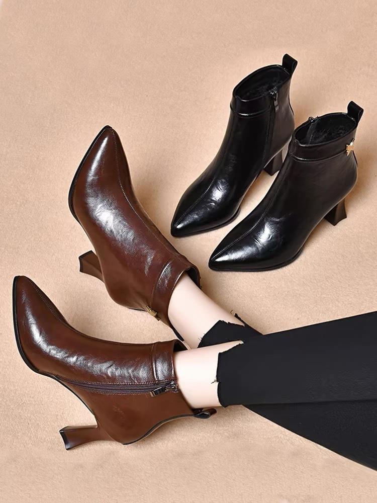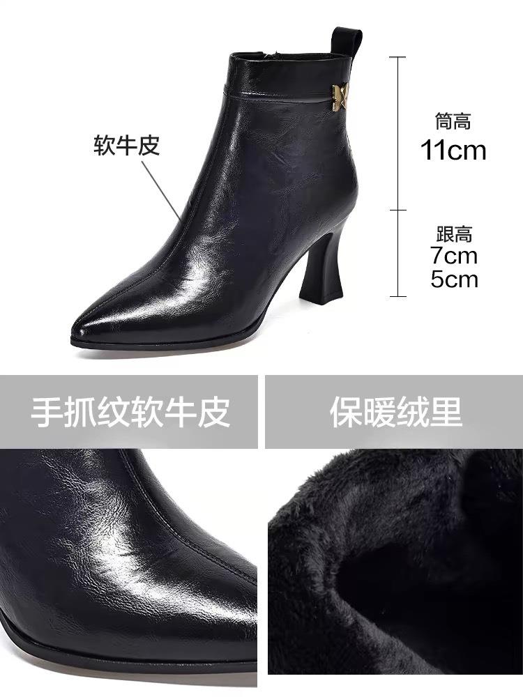 高跟鞋新款秋冬真皮女靴时尚尖头手抓纹短靴女士百搭春秋单靴