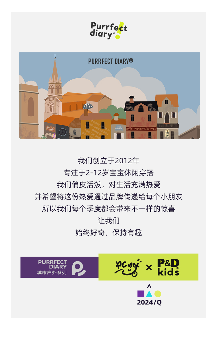 Purrfect-Diary专注于贴近自然随性的穿着概念,轻奢平价的童装文化传播,在产品设计上更加注重婴童穿着的舒适性、安全性、更出众的国际化品牌,将欧美的育婴文化在中国进行深入的传播与推广。