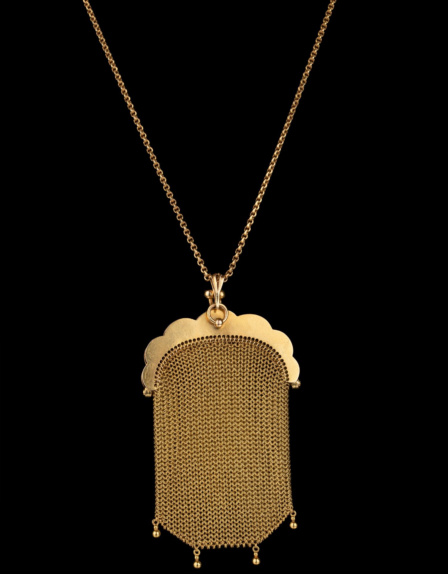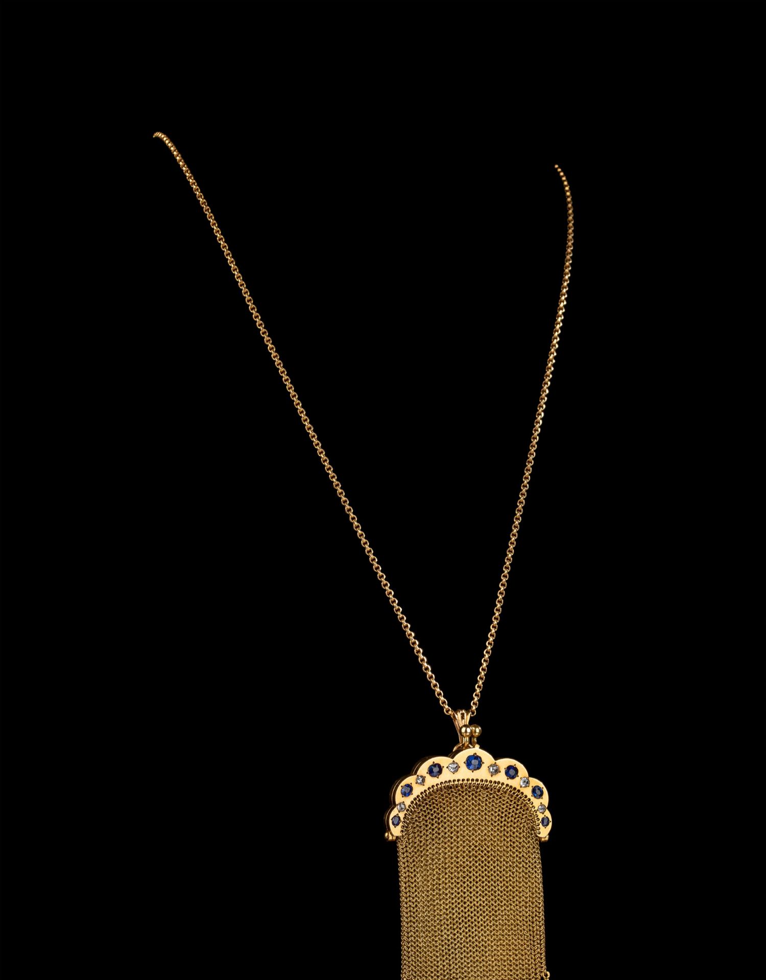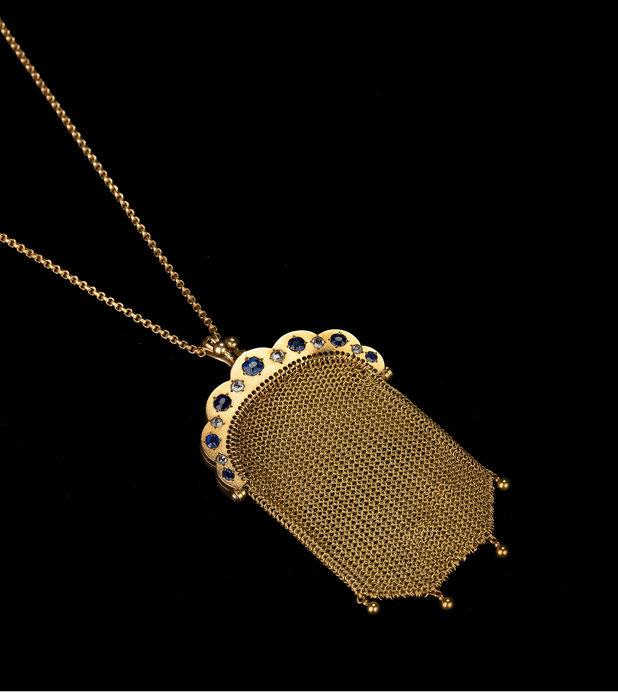 独角鹿西洋古董18K黄金镶嵌钻石蓝宝石配长链珠扣黄金编织零钱包