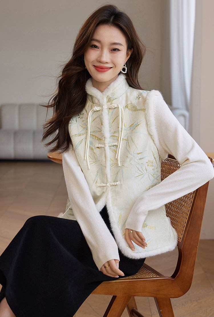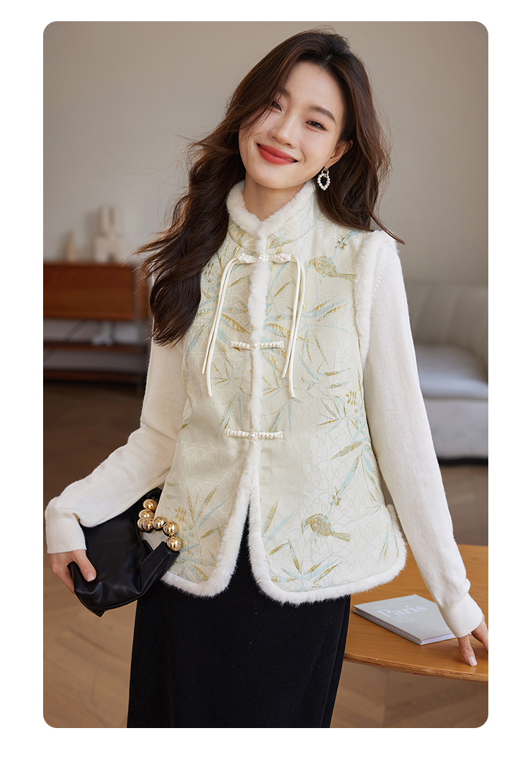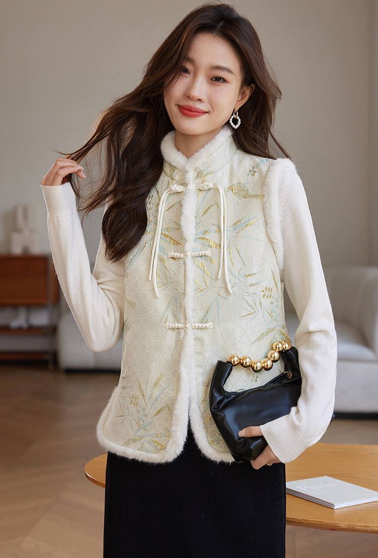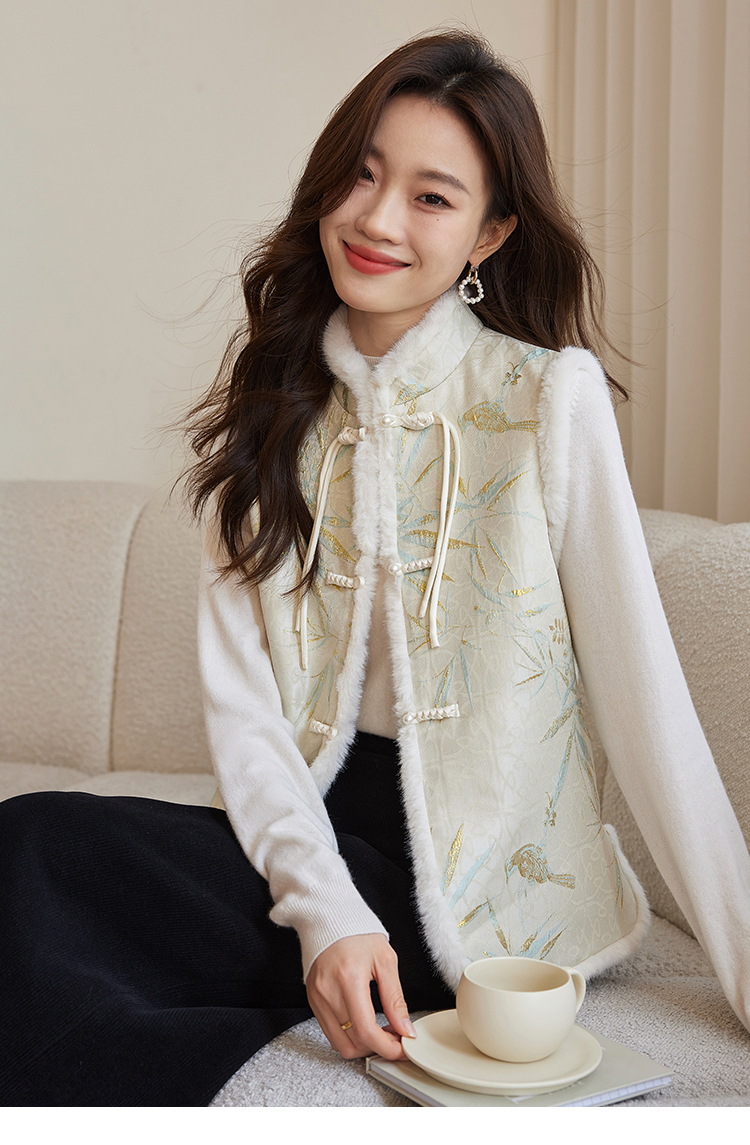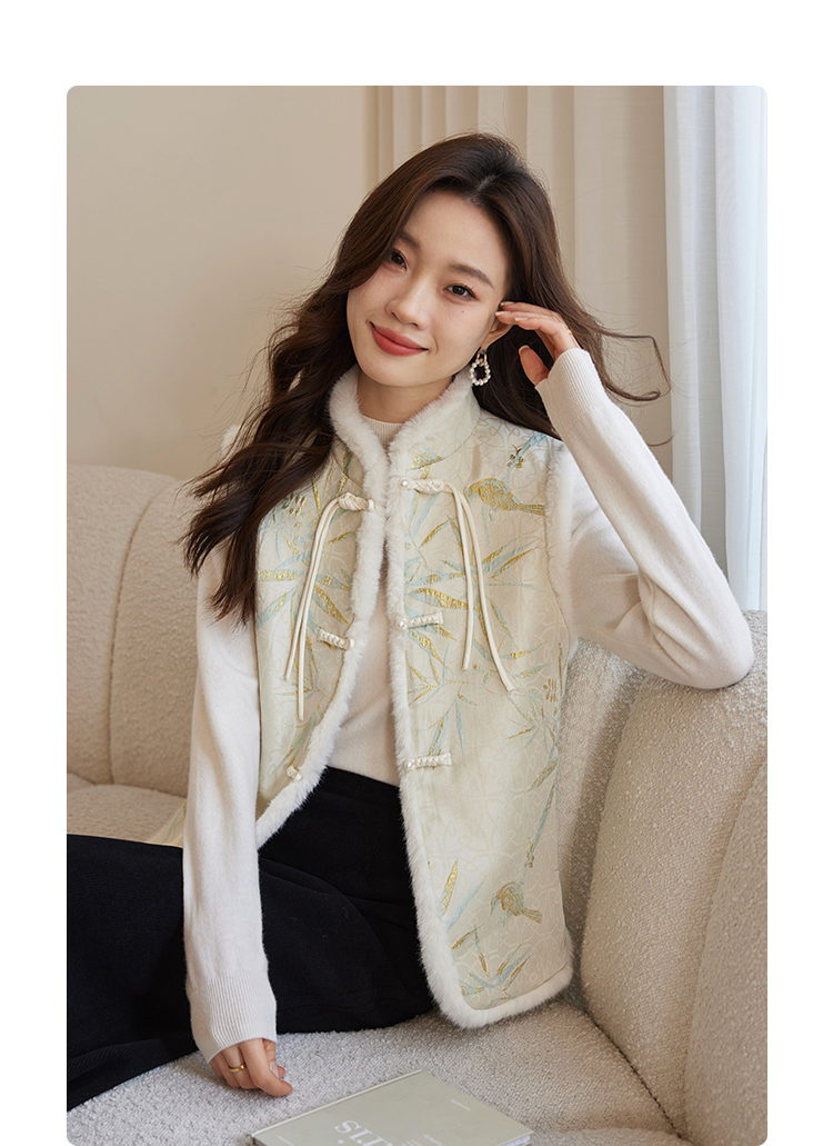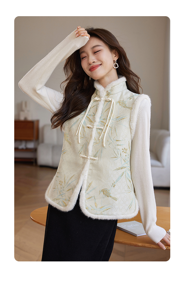 【年货节】熙世界新中式盘扣兔毛立领马甲短外套女冬夹棉国风无袖马夹上衣