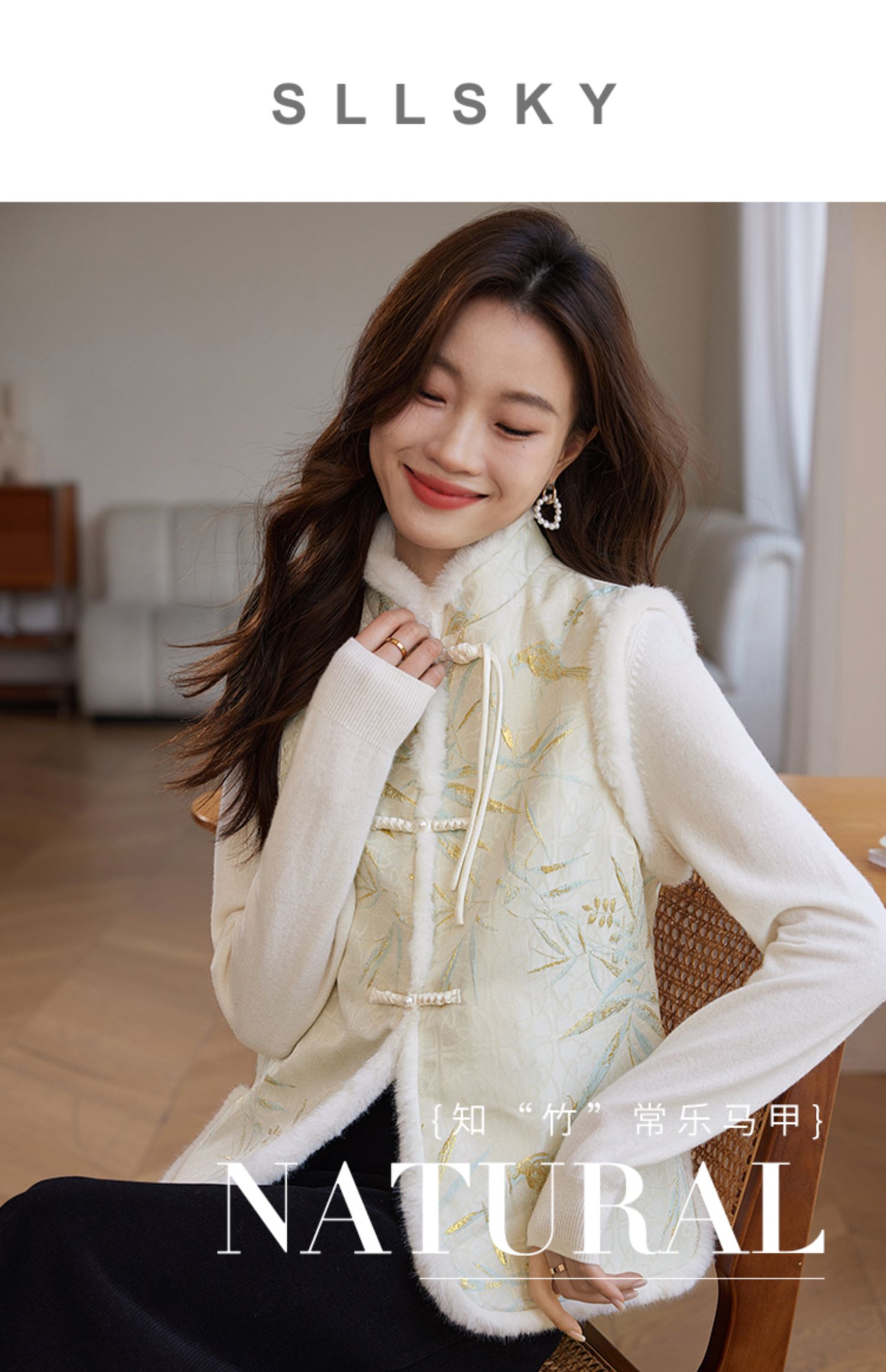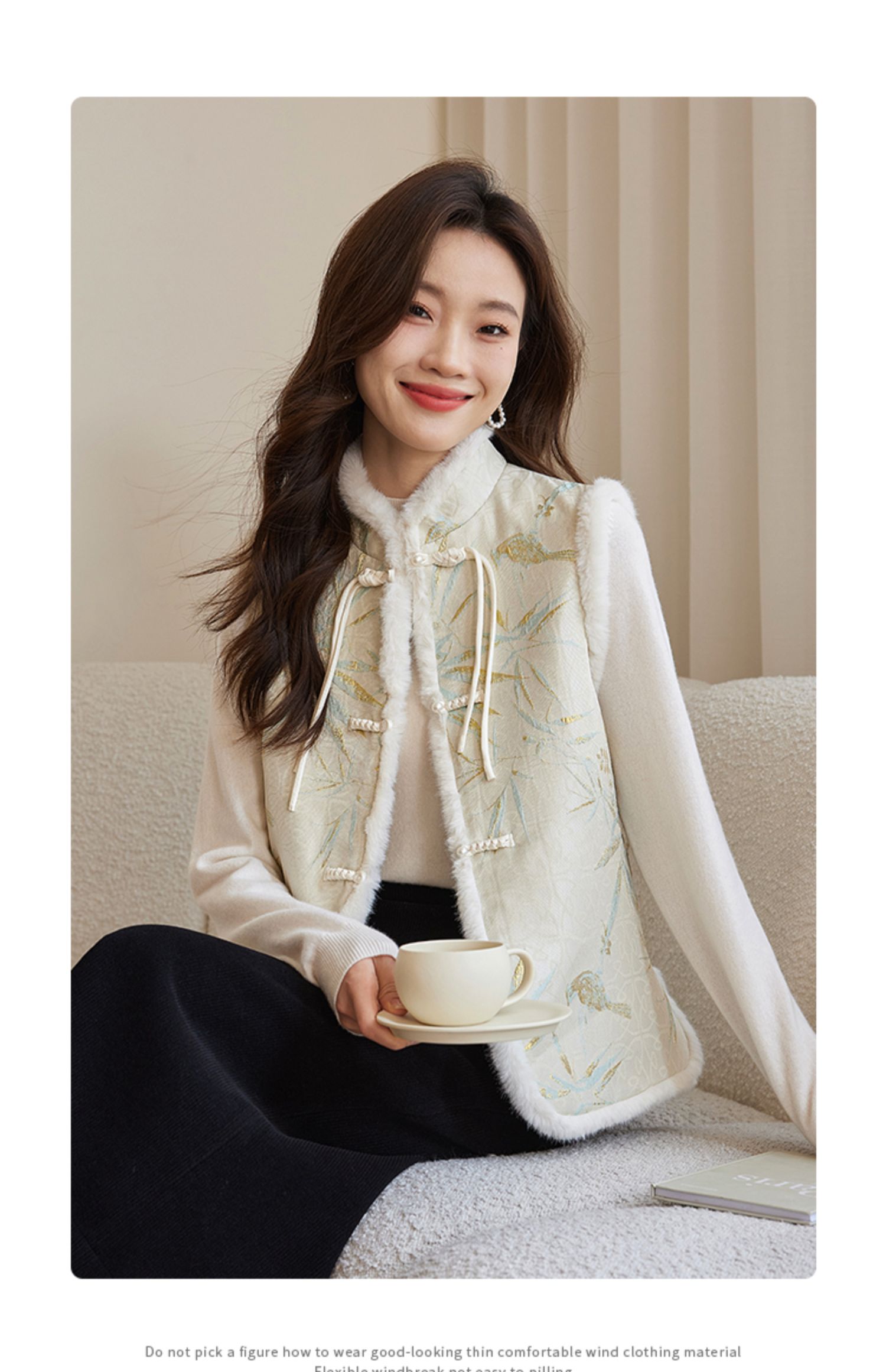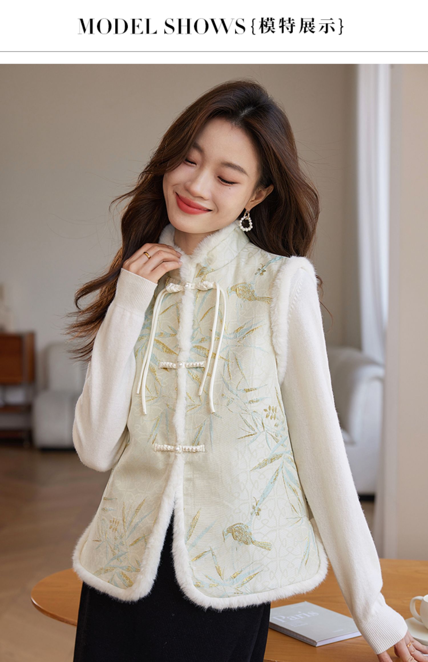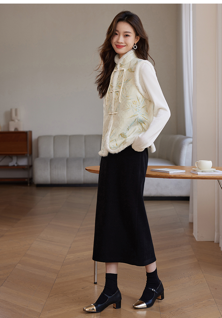 【年货节】熙世界新中式盘扣兔毛立领马甲短外套女冬夹棉国风无袖马夹上衣
