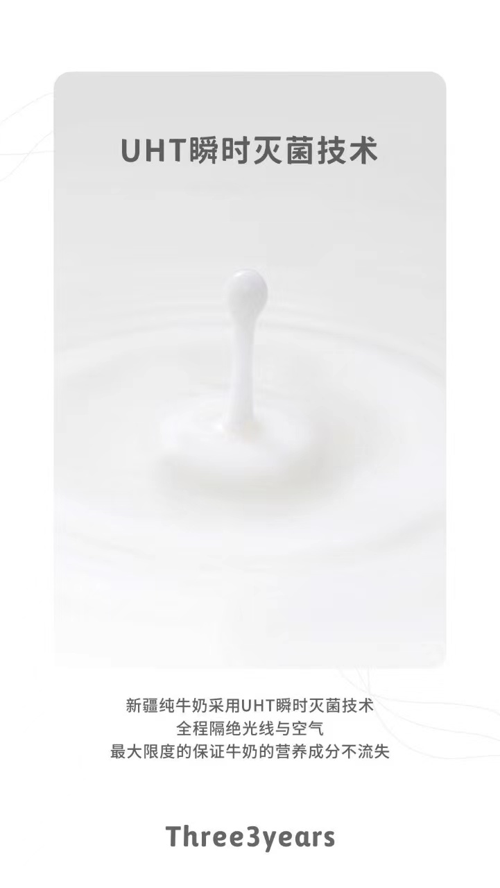 先进的加工技术:三个三年新疆纯牛奶采用UHT瞬时灭菌技术,全程隔绝光线与空气,最大限度的保证牛奶的营养成分不流失。