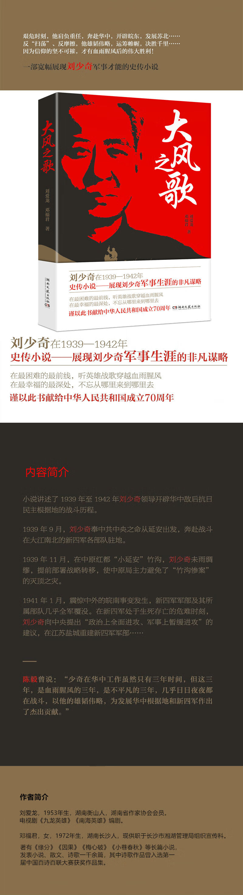《大风之歌》以真实史料为素材,描述了刘少奇同志从1939年年底到1942年年初领导开创华中抗战新局面的战斗历程。1939年,在国共关系日益紧张、日寇蠢蠢欲动的危急形势下,刘少奇同志受中共中央委托组建中共中央中原局,先后领导指挥半塔集战斗、华中地区反扫荡、郭村保卫战、黄桥决战等战役,为扭转“皖南事变”后的不利影响,开辟和巩固华中抗日根据地作出了重大贡献。