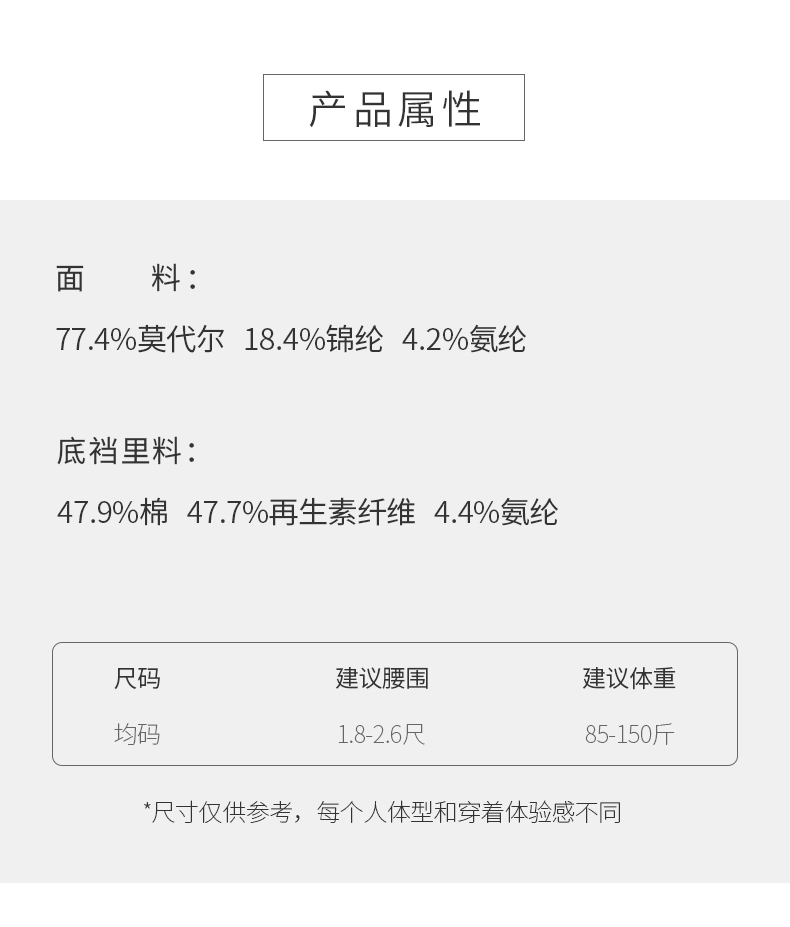 今天安利的这款莫代尔内裤简直好穿到炸裂,它的面料是50支超细莫代尔哦,贴身穿如牛奶般丝滑,非常适合夏季穿,而且透气性和吸湿性较于冰丝跟棉都更好!面料能顺应贴合身体曲线,包容性巨强!80~150斤的小仙女放心大胆的入手,简直不要太好穿!!!穿在身上你们就知道什么是“仿若无物 ” 的裸奔感!太快乐了~~质感、做工细节、舒适度都会帮你们把控的牢牢的,这条内裤绝对是物超所值再乘以10倍的存在~~推荐你们一定要买两条感受一下!