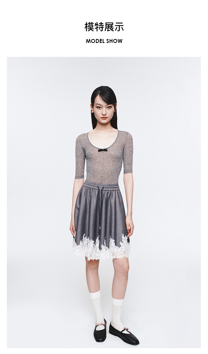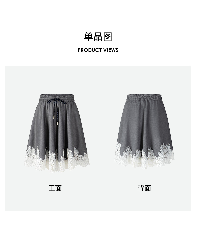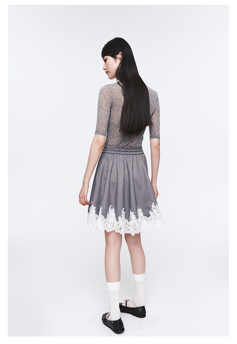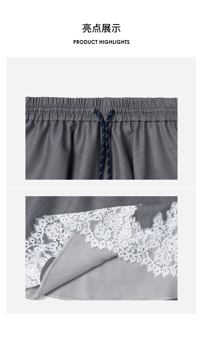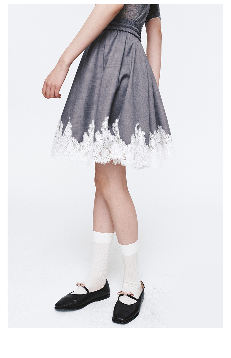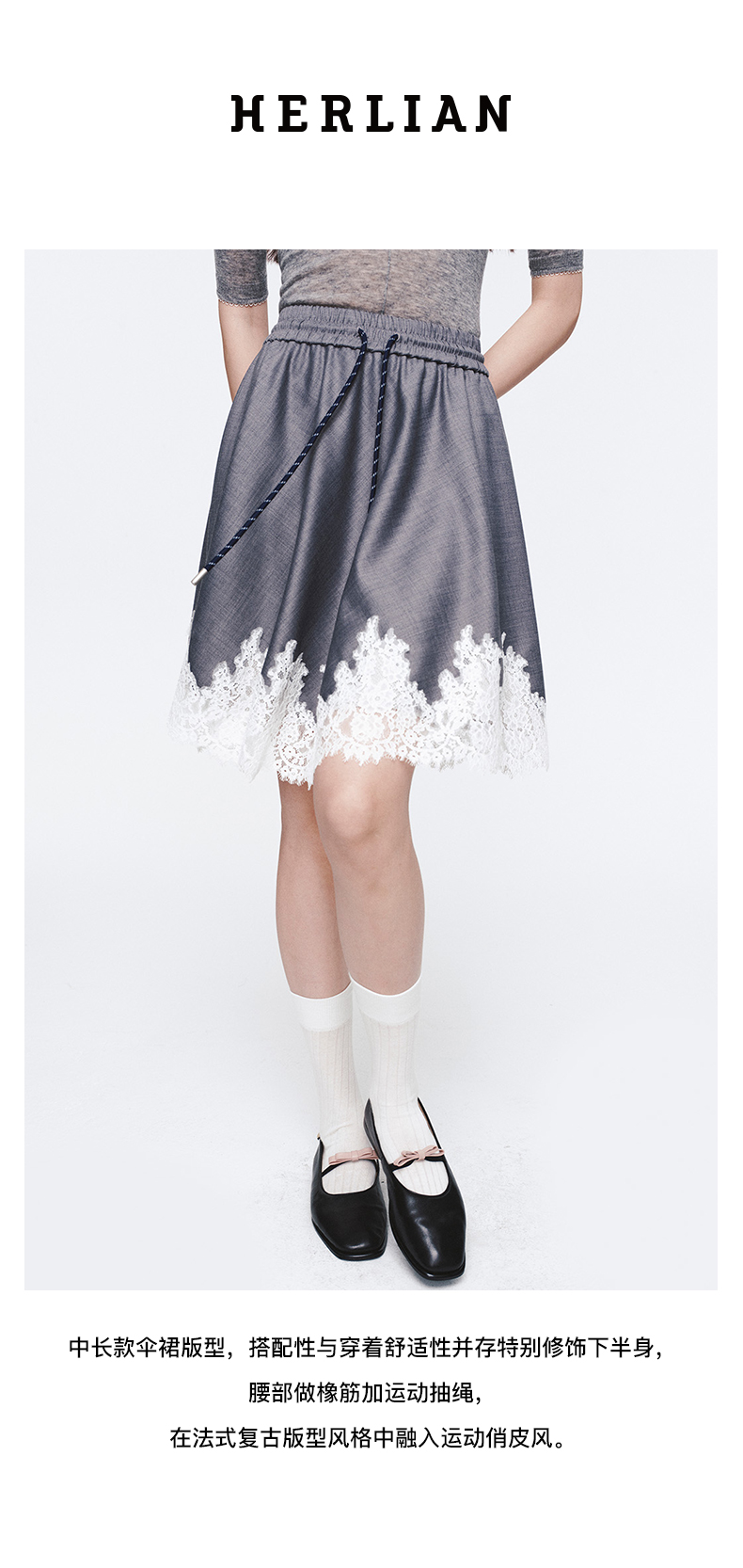 Herlian2025年蕾丝拼接松紧腰伞裙女士花边下摆中长款半裙