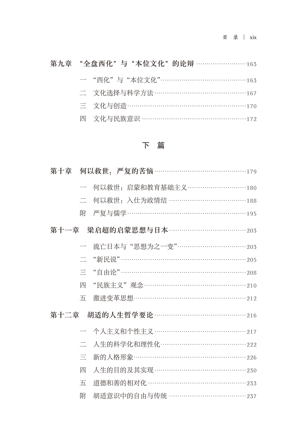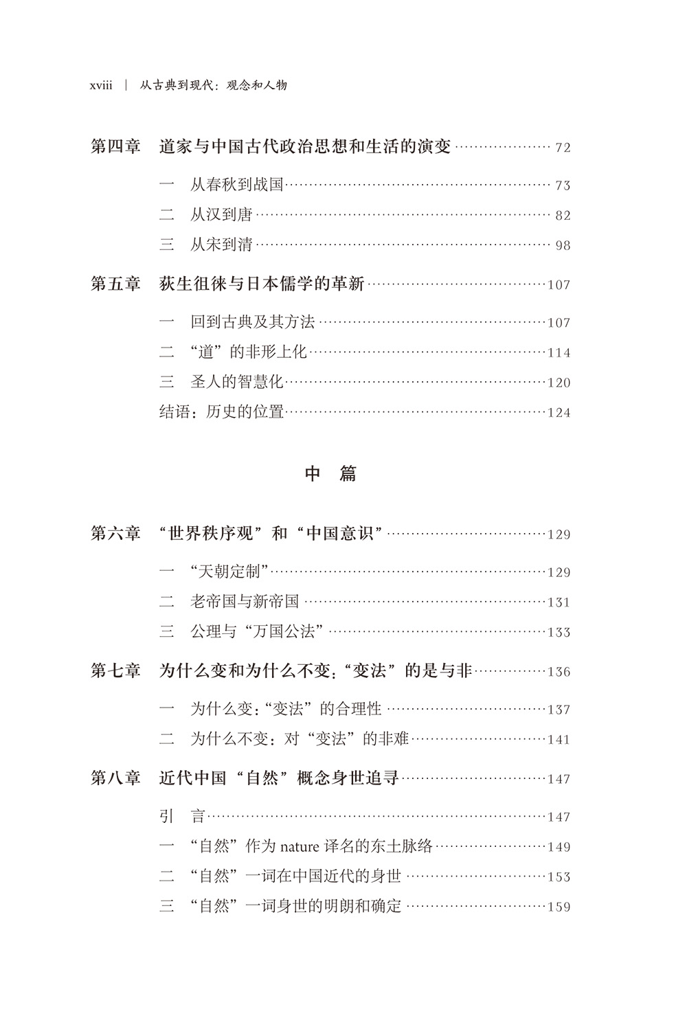 全书共三编十七章,上篇详细、深入地梳理了中国古代道家、儒家在形而上及社会政治两个层面的重要哲学观念在历史上的演变,在这个过程中思考古代政治思想和生活的演变是如何发生的,并与儒学在日本的想现代化进行了比照。中篇集中地考察了新旧交替时期,古代与下现代、西方文化与本土文化之间的冲突与交融;下篇以人物为主,通过对新旧交替时期严复、冯友兰、熊十力、殷海光、张岱年等哲学家思想的梳理,试图阐明,对古代思想世界的认识与解读,与研究者们的观察视点和范式的改变有着密切的关联。