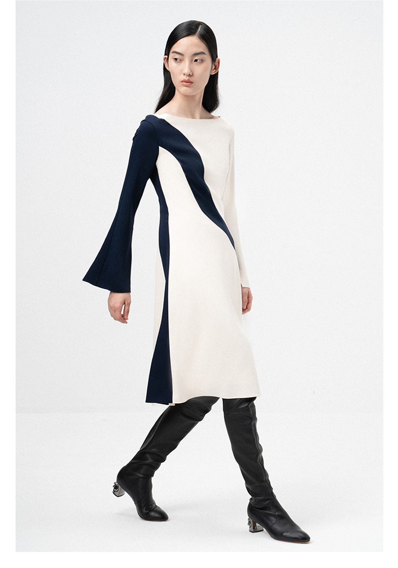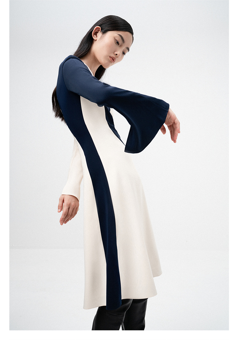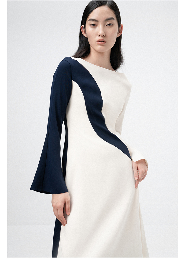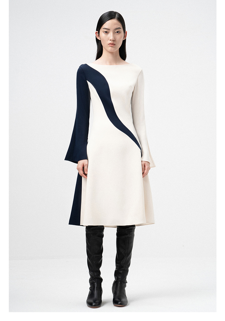 【晨流】不规则曲线拼接米白藏青撞色连衣裙/0000739