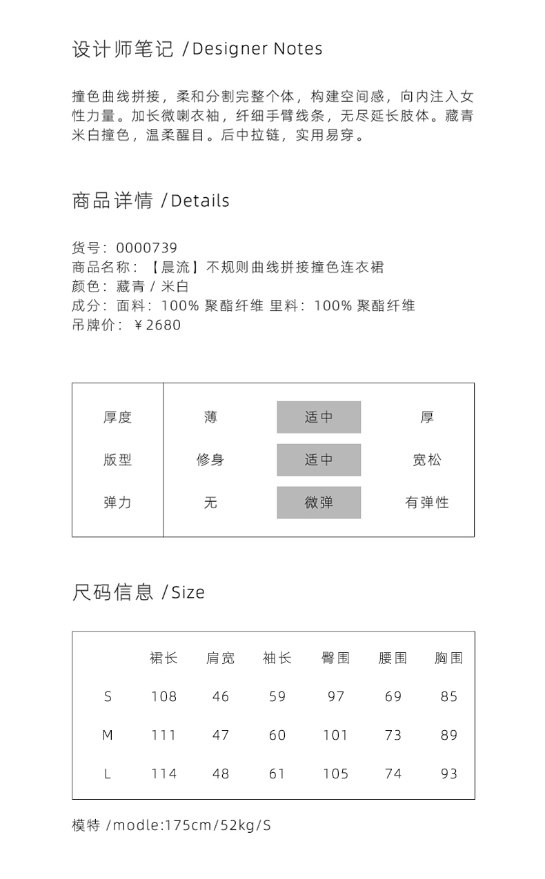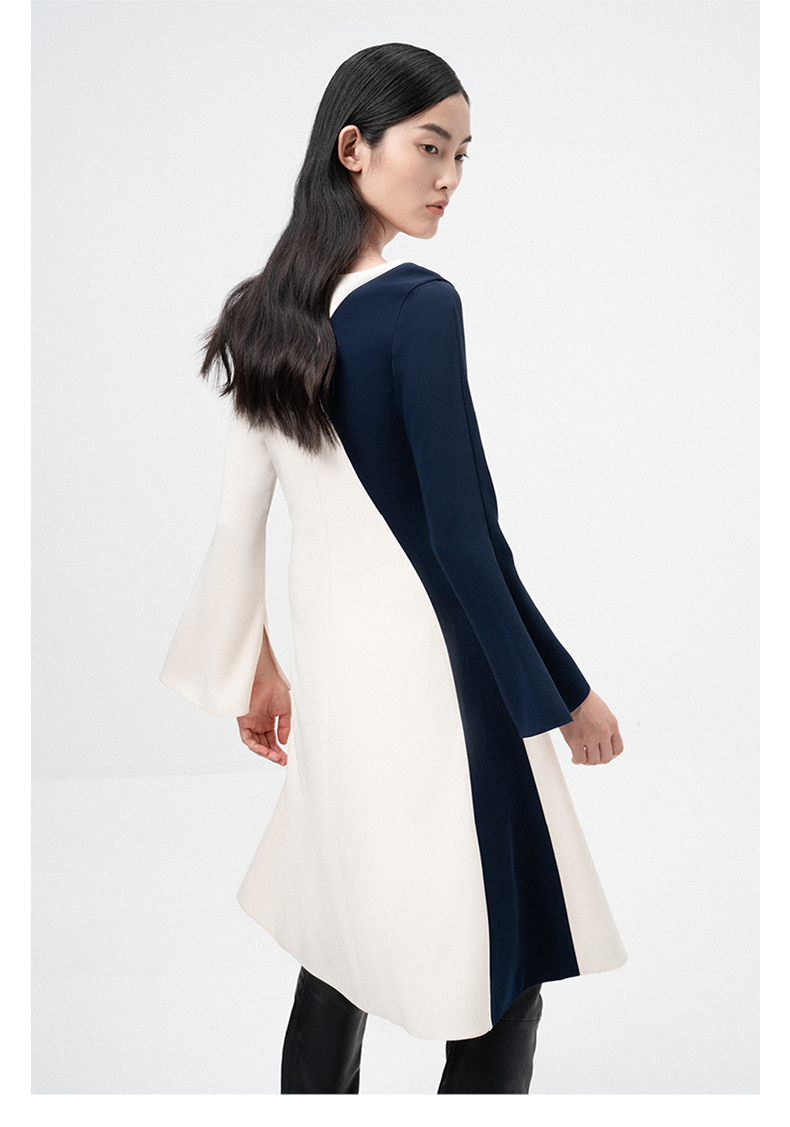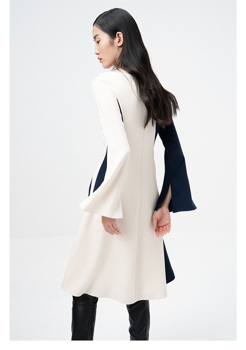 【晨流】不规则曲线拼接米白藏青撞色连衣裙/0000739
