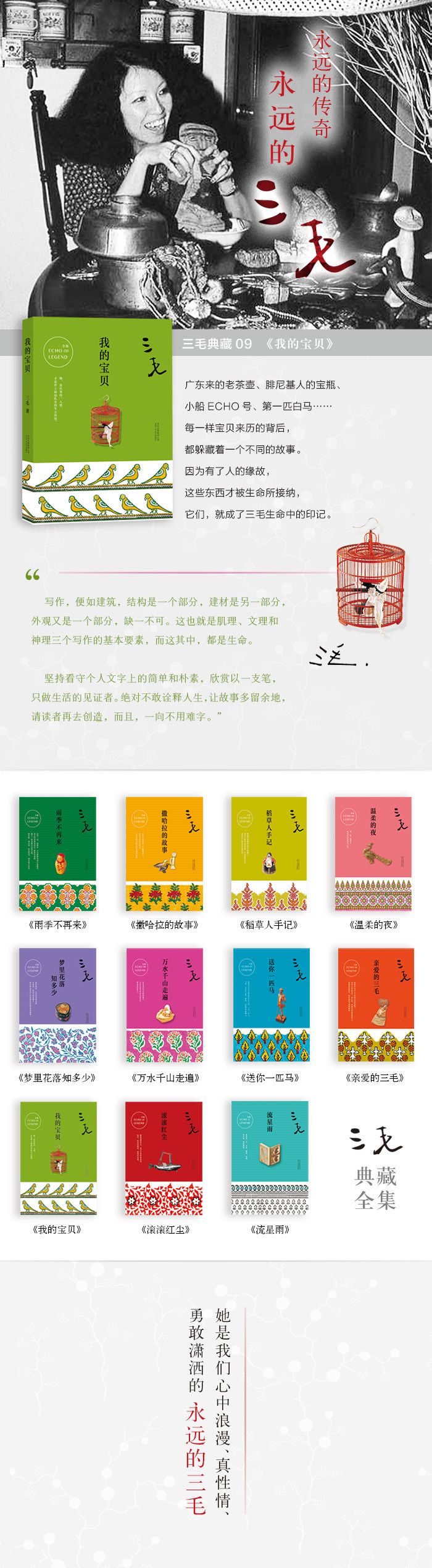 《我的宝贝》一书中,三毛向读者们展示了86件珍藏多年的宝贝,她并未刻意编排,而是抽到哪一张照片,就去写哪一个故事。广东来的老茶壶、腓尼基人的宝瓶、小船ECHO号、结婚礼物……每一样宝贝来历的背后,都躲藏着一个不同的故事,见证了三毛所拥有的爱情、亲情和友情,以及走遍世界各地的奇妙旅程。这些宝贝并非价值连城,但因为有了人的缘故,才被接纳,成了三毛生命中的印记,反映了扎实的生之欢悦。